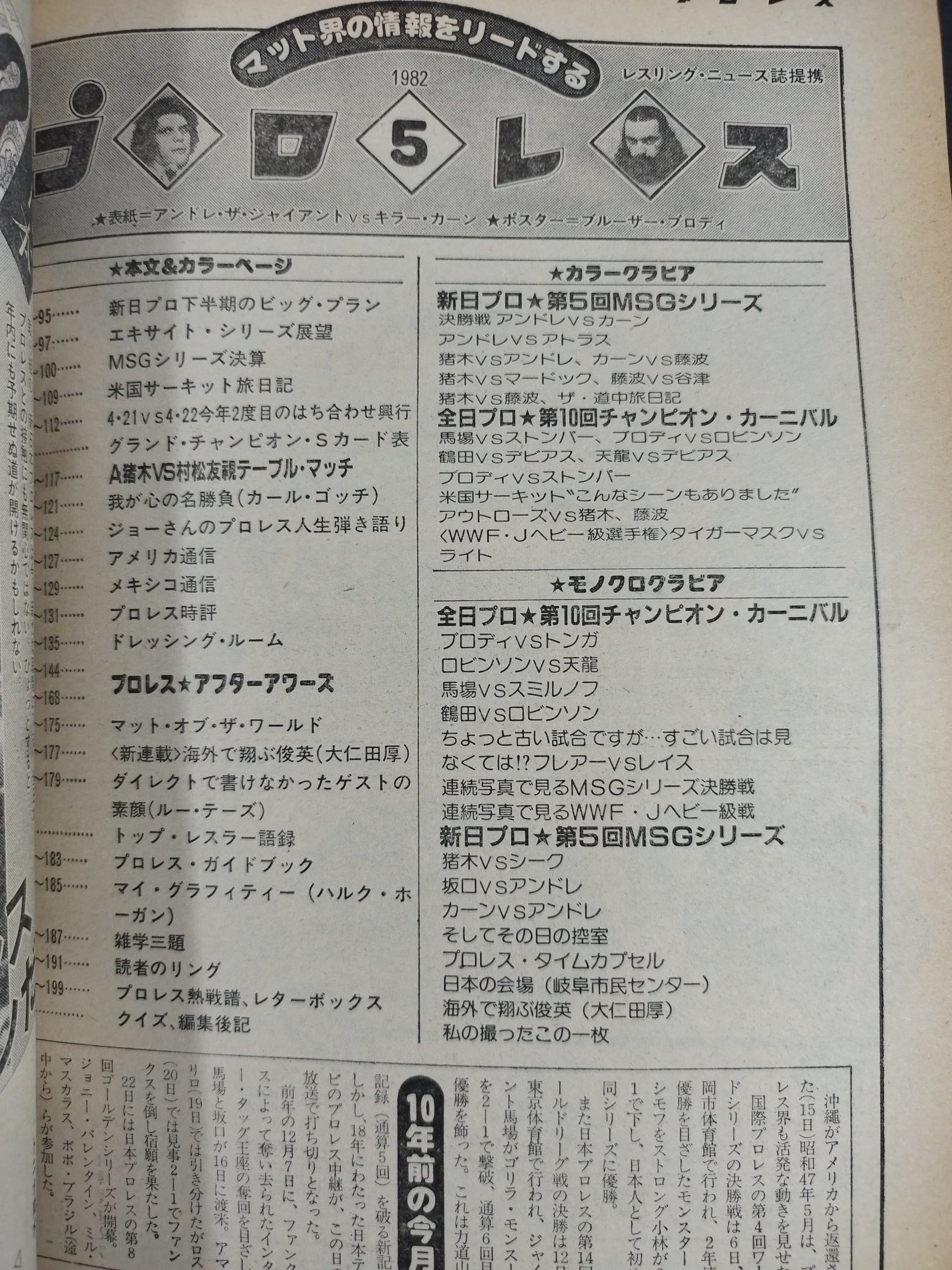 1982年 第5回MSGシリーズ決勝戦 チャンピオン・カーニバルハイライト 我が心の名勝負 カール・ゴッチ 馬場、鶴田、天龍”全米サーキット”旅日記 エキサイトシリーズにフレアー出場 新日プロ下半期のビッグ・プラン 馬場・猪木タッグ再現か!? / 【付録】×ポスター(ブルーザー・ブロディ) 表紙:キラーカーンvsアンドレ・ザ・ジャイアント