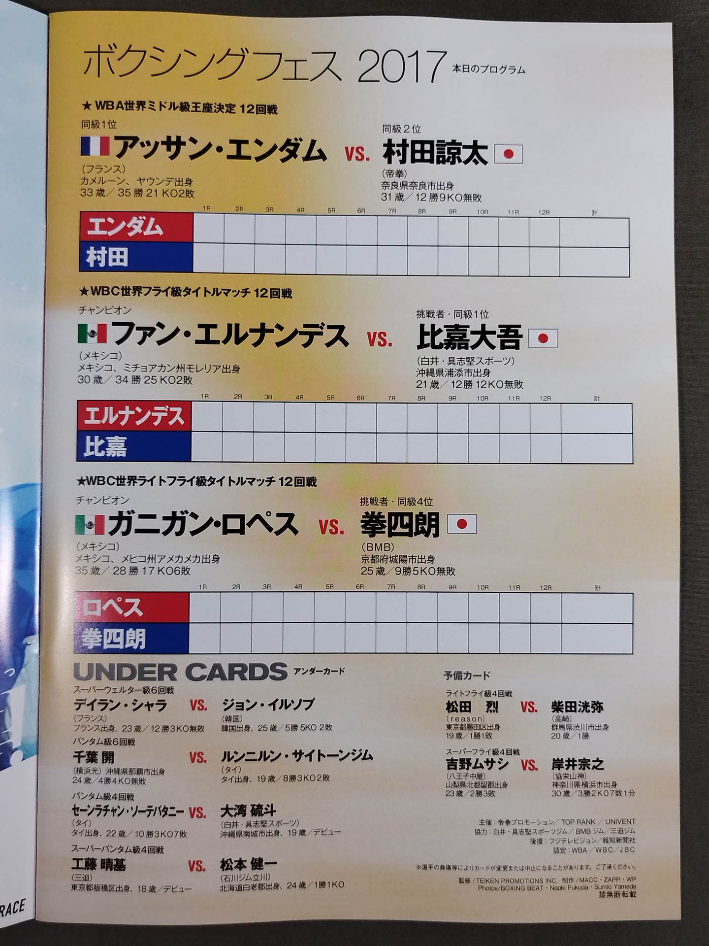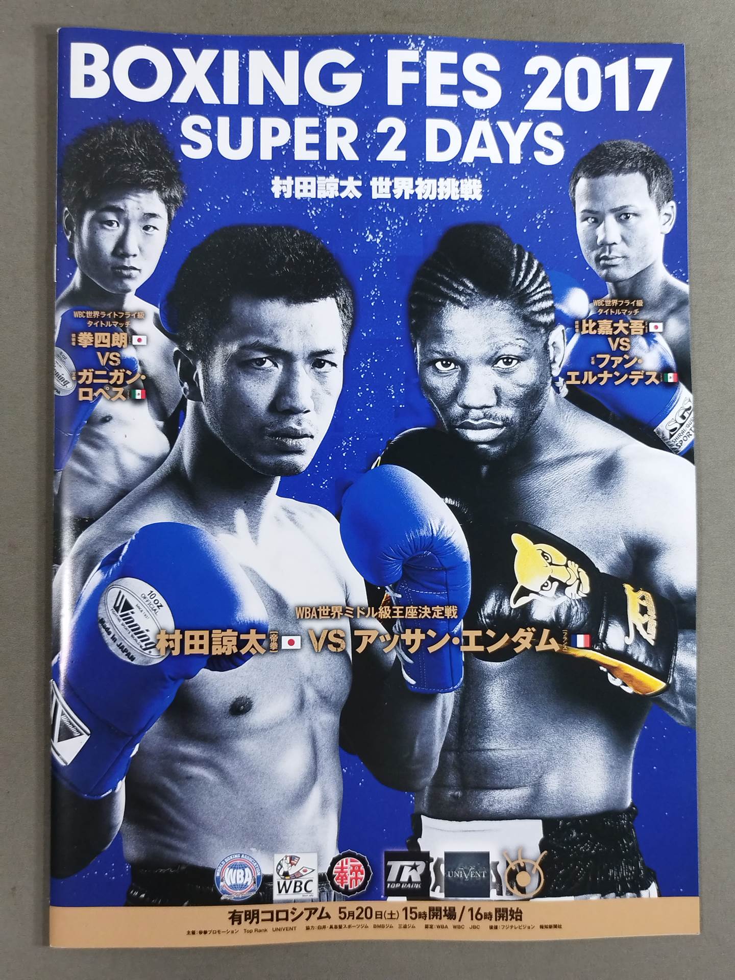 会場:有明コロシアム / 【WBA世界ミドル級王座決定戦】村田諒太vsアッサン・エンダム /【WBC世界フライ級タイトルマッチ】比嘉大吾vsファン・エルナンデス /【WBC世界ライトフライ級タイトルマッチ】 拳四朗vsガニガン・ロペス BOXING FES 2017 SUPER 2 DAYS