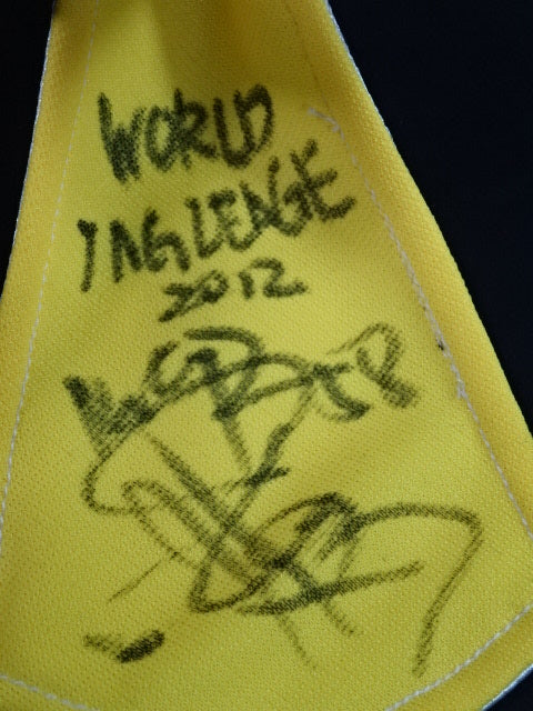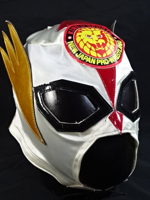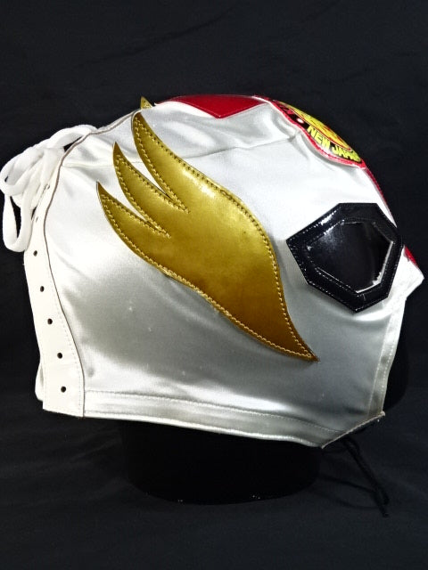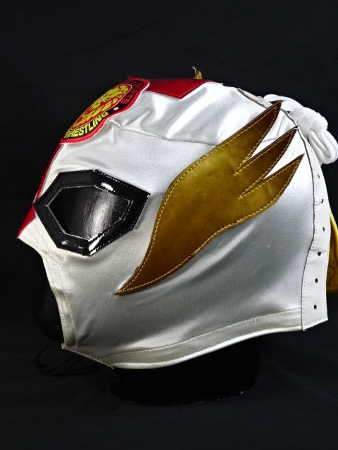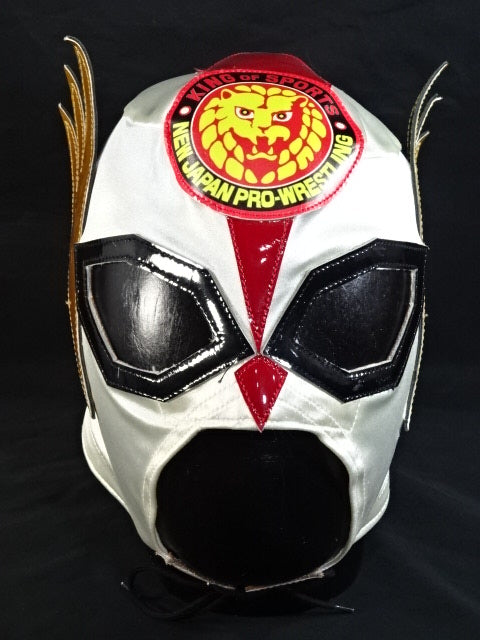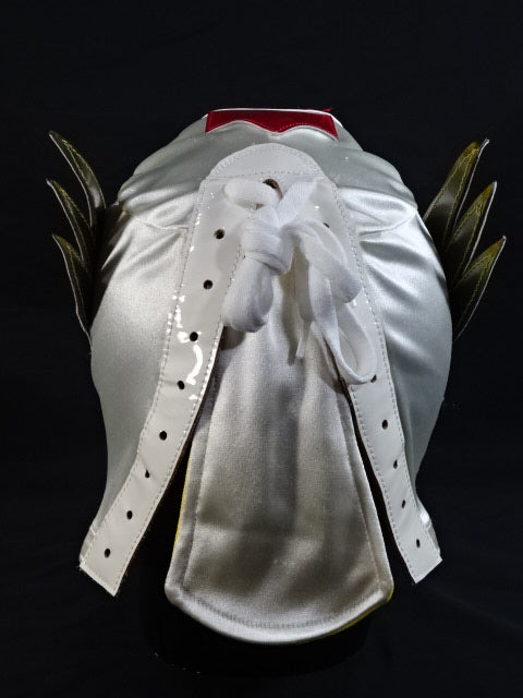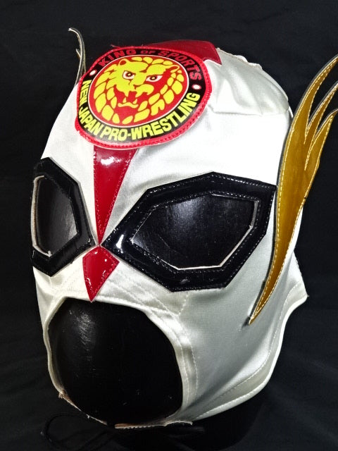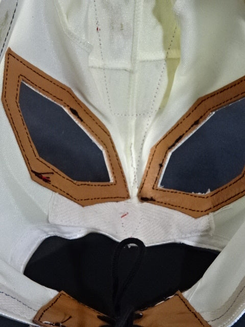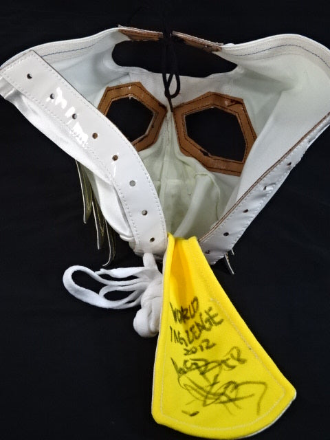 2012年11月20日~12月2日に行われた「WORLD TAG LEAGUE 2012」で入場時に使用していたもの 「マスク大百科Ⅱ」に掲載されいる現物マスク 本人使用サイン入り(WORLD TAG LEAGUE 2012) 掲載写真付 ゲットクレイジー製 白サテン生地 黒革フチ&金革フチ&赤革フチ
