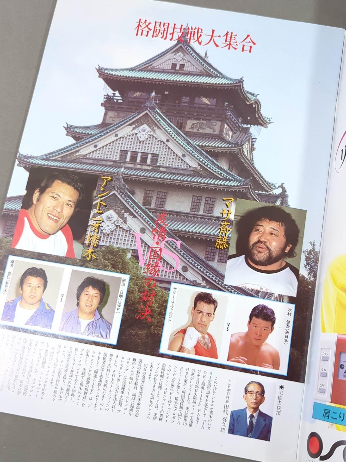 会場:大阪城ホール / 印刷対戦カード:アントニオ猪木vsマサ斉藤※試合中盤、海賊男が乱入し、マサ斎藤に手錠をかけ拉致!その結果、猪木の反則勝ち。意図がつかめない展開に観客が暴動を起こしてしまう。 / アントニオ猪木レスラー生活25周年記念