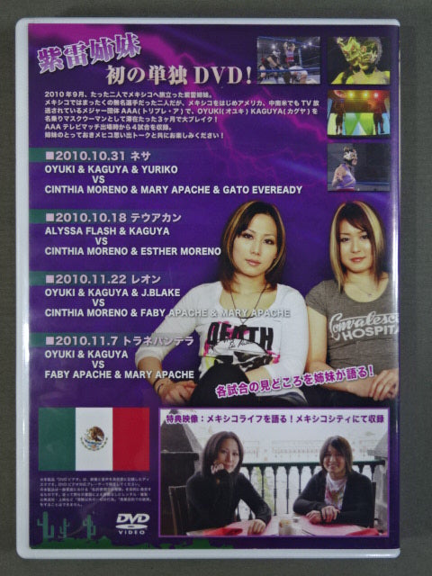 紫雷姉妹 初の単独DVD! 2010年9月、たった二人でメキシコへ旅立った紫雷姉妹。 メキシコではまったく無名選手だった二人だが、メキシコをはじめアメリカ、中南米でもTV放映されているメジャー団体AAAでOYUKIとKAGUYAを名乗りマスクウーマンとして滞在たった3ヶ月で大ブレイク! AAAテレビマッチ出場時から4試合(2010.10.30~2010.11.7)を収録。姉妹のとっておきメヒコ思い出トークと共にお楽しみください!