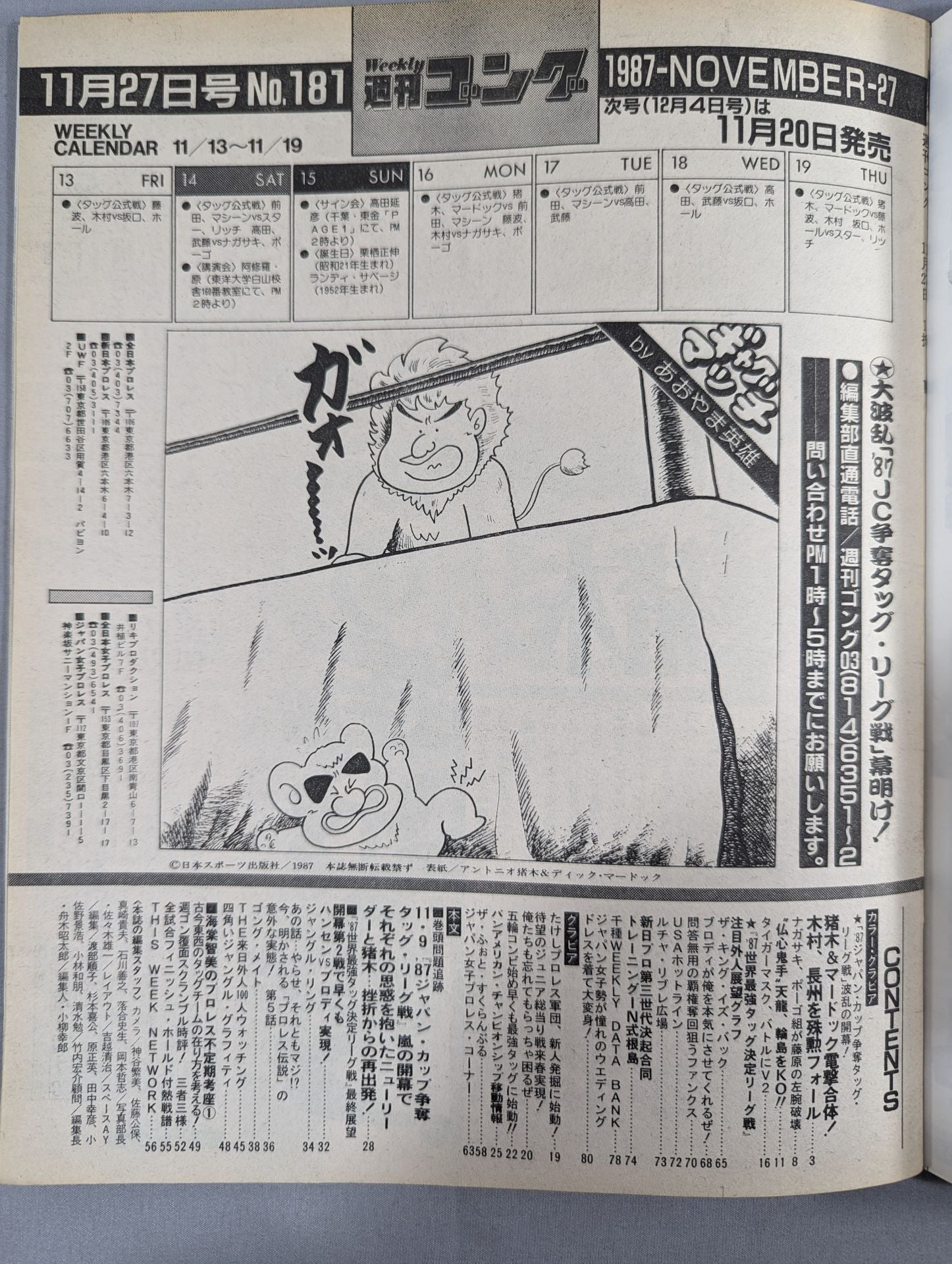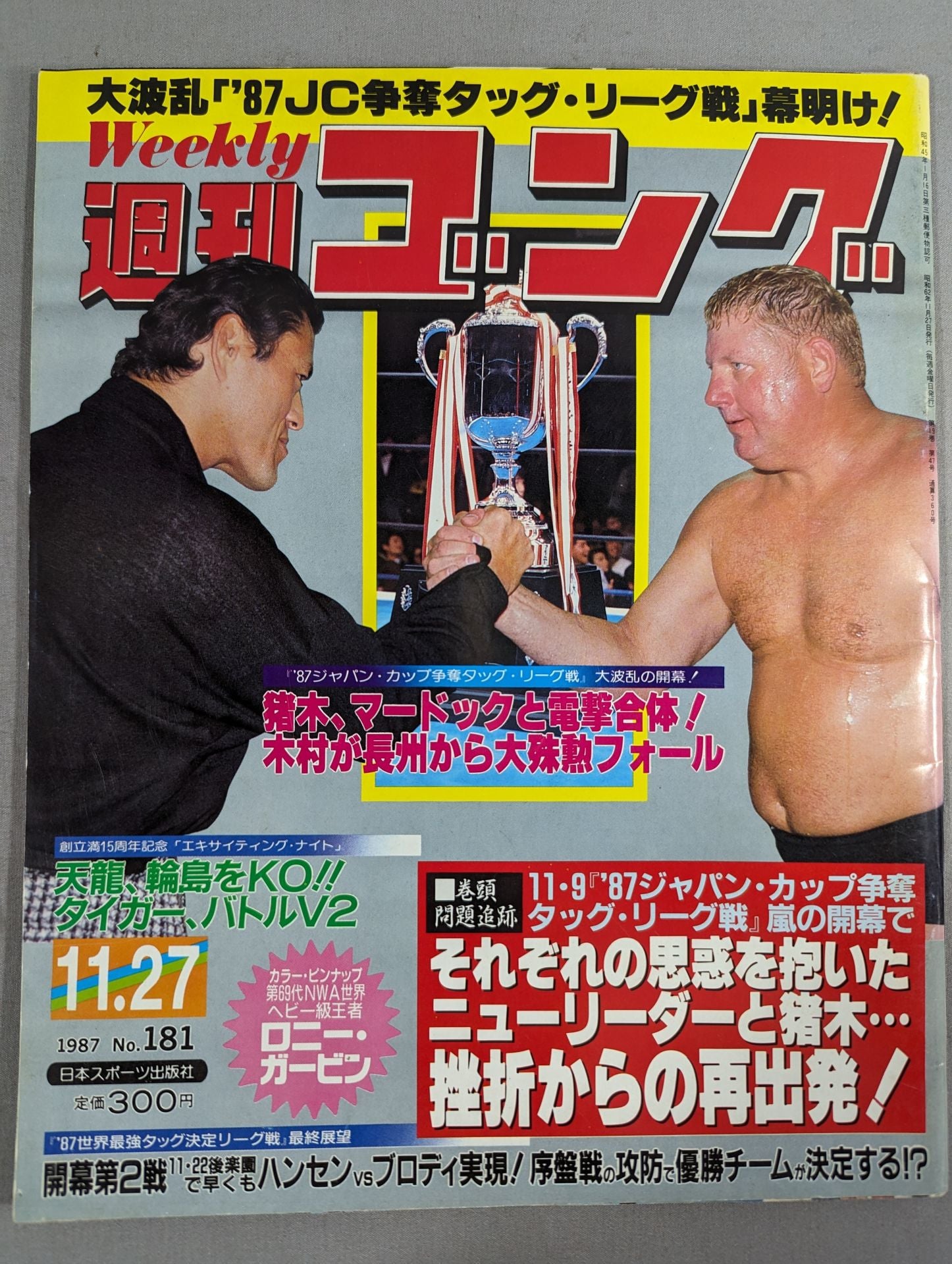 大波乱 『’87JC争奪タッグ・リーグ戦』幕開け! / ピンナップ:ロニー・ガービン / 表紙:アントニオ猪木、ディック・マードック