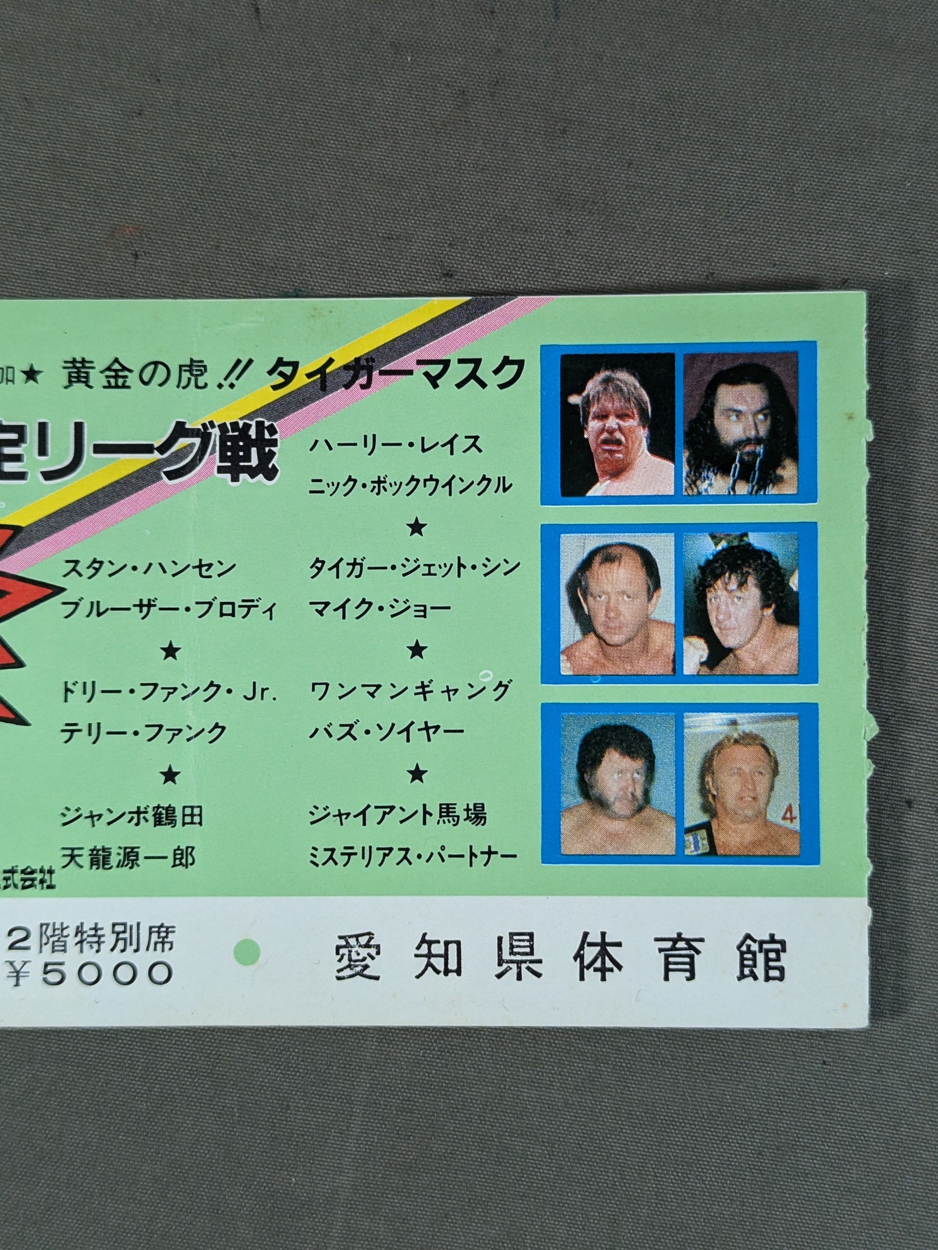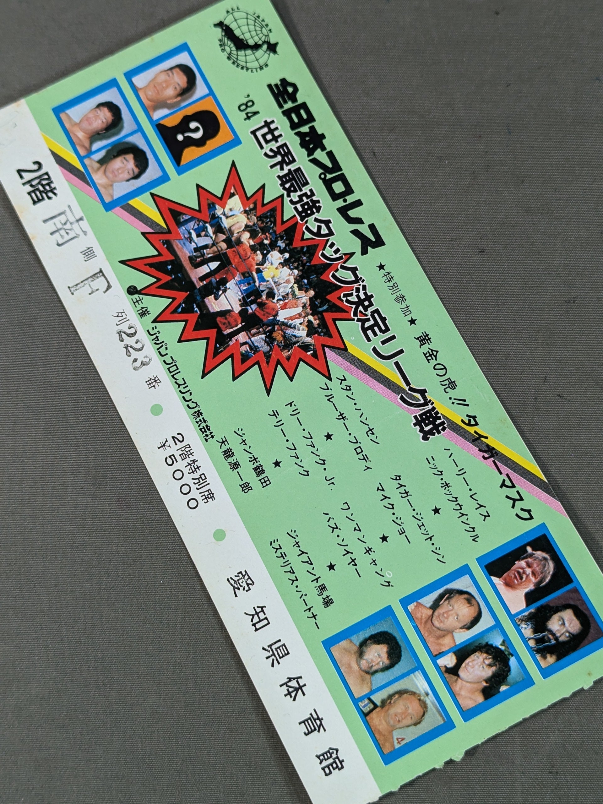 2階特別席 南側F列223番 / スタン・ハンセン&ブルーザー・ブロディvsテリー・ファンク&ドリー・ファンクJr / メインの超獣コンビvsファンクス終了後、馬場がリング上から観客席にいた長州を挑発。馬場、鶴田、天龍らと長州、浜口らが大乱闘となり、長州の全日本参戦が正式に決定した。