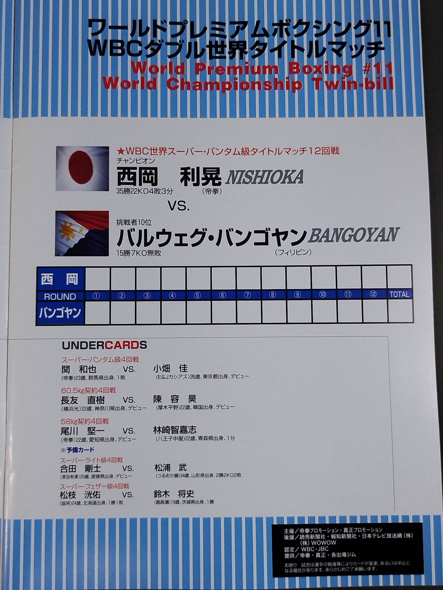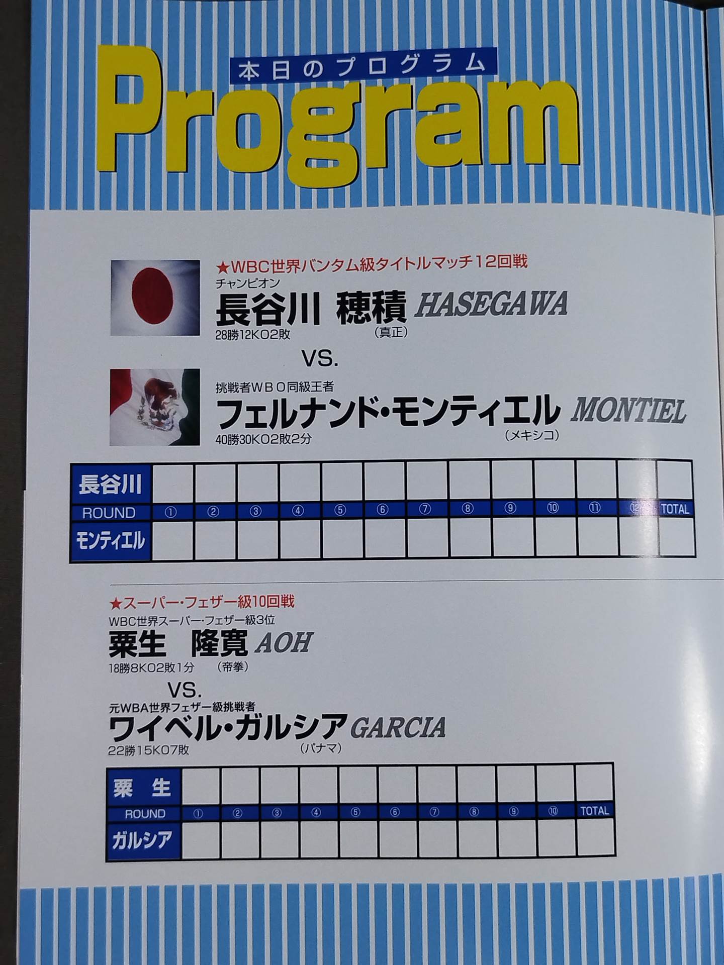 会場:日本武道館 / 印刷対戦カード:【WBC世界バンタム級タイトルマッチ】長谷川穂積vsフェルナンド・モンティエル/ 【WBC世界スーパーバンタム級タイトルマッチ】西岡利晃vsバルウェグ・バンゴヤン / 粟生隆寛vsワイベル・ガルシア