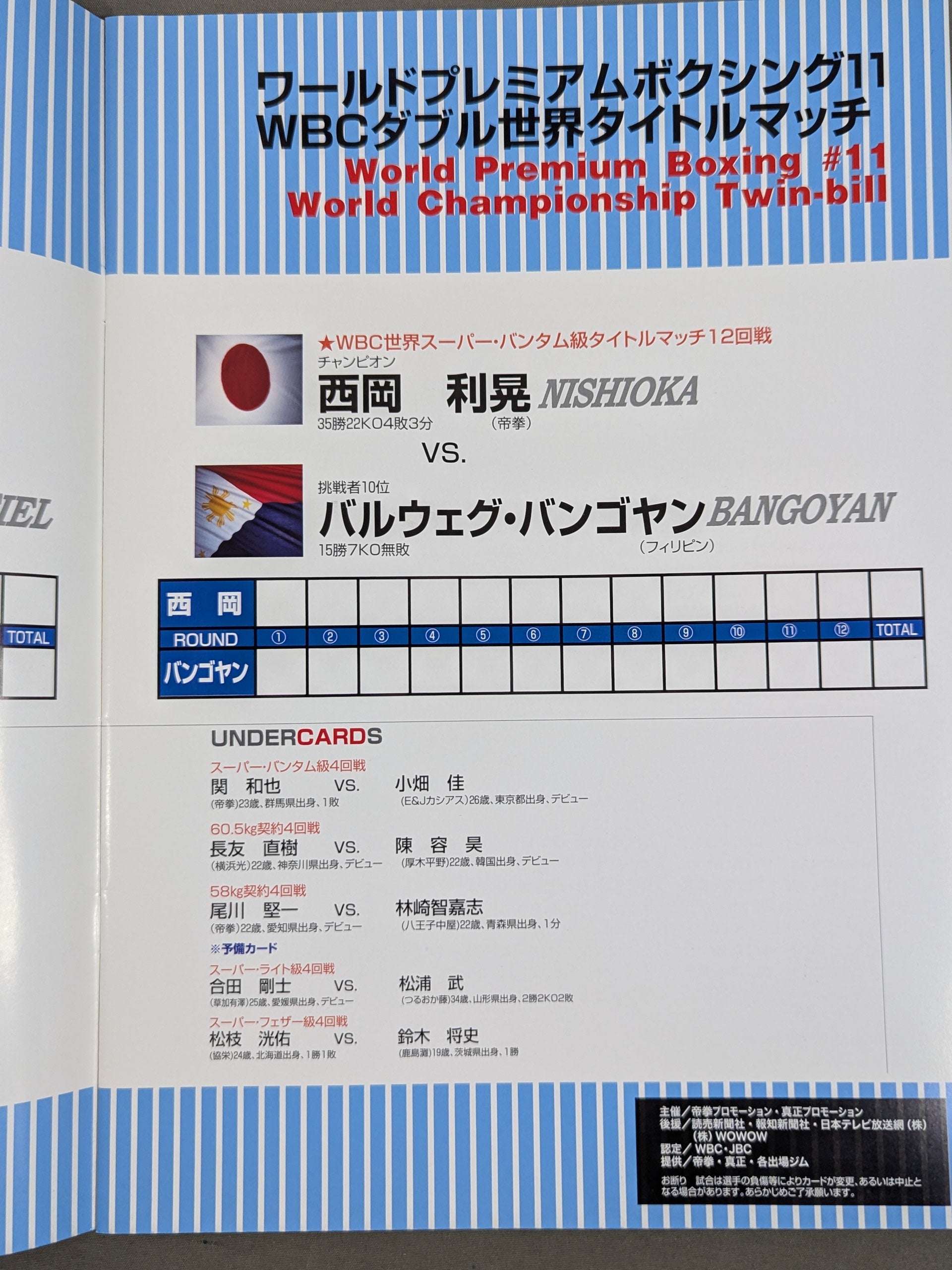 会場:日本武道館 / 印刷対戦カード:【WBC世界バンタム級タイトルマッチ】長谷川穂積vsフェルナンド・モンティエル/ 【WBC世界スーパーバンタム級タイトルマッチ】西岡利晃vsバルウェグ・バンゴヤン / 粟生隆寛vsワイベル・ガルシア