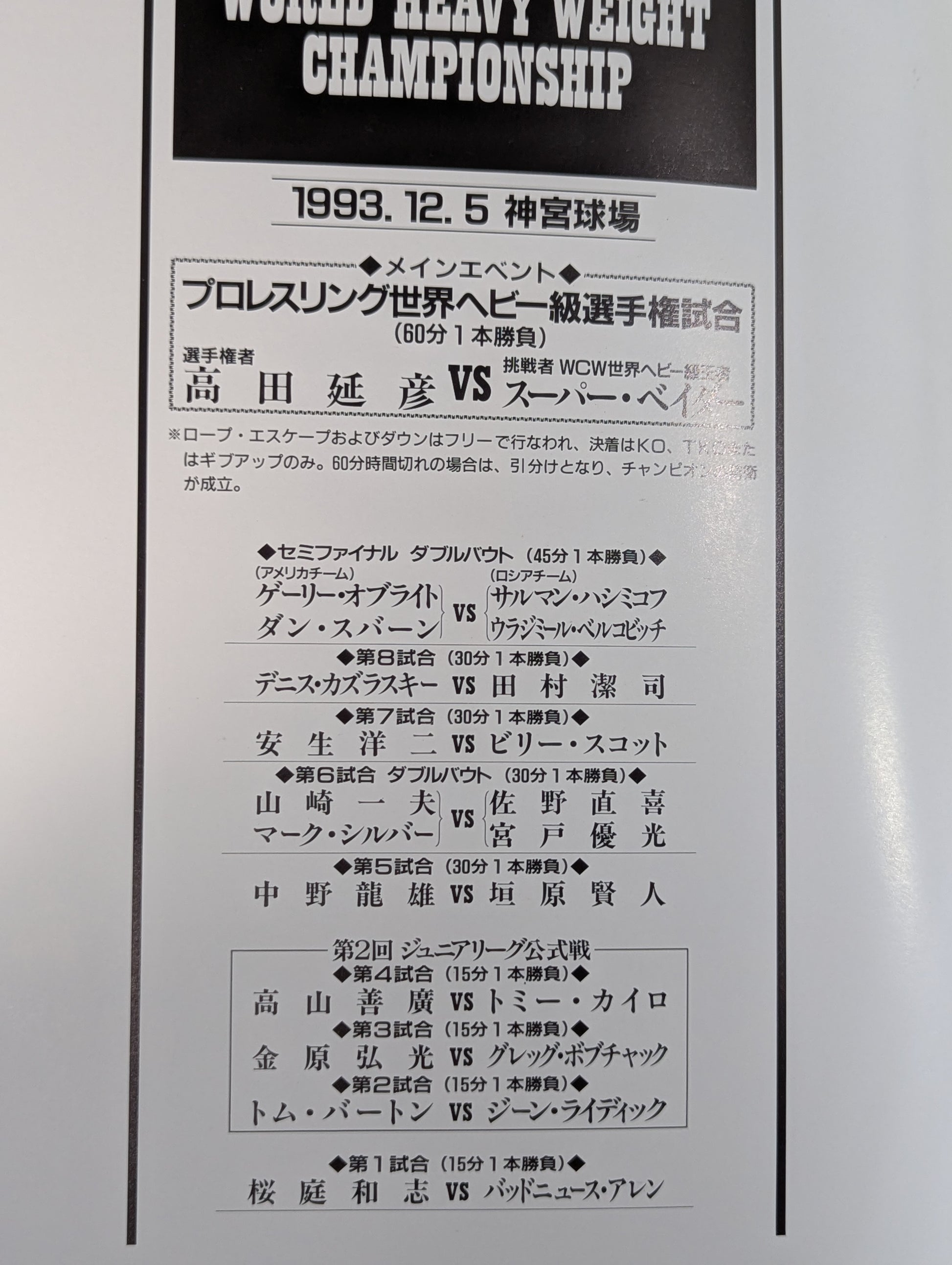 会場:神宮球場 / 印刷対戦カード:【プロレスリング世界ヘビー級選手権試合】高田延彦vsスーパー・ベイダー / ゲーリー・オブライト&ダン・スバーンvsサルマン・ハシミコフ&ウラジミール・ベルコビッチ