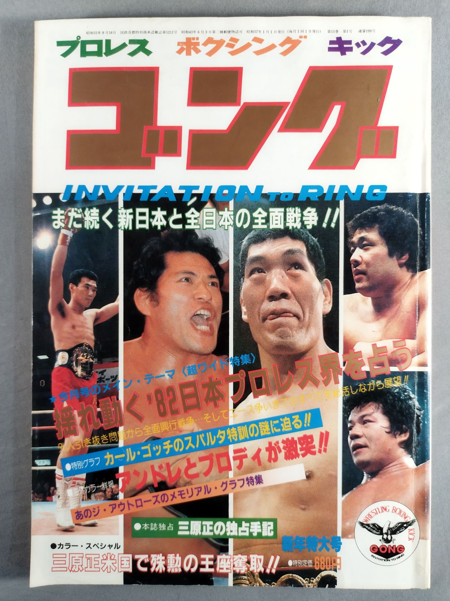 揺れ動く'82日本プロレス界を占う 特別グラフカール・ゴッチのスパルタ特訓の謎に迫る!! 海外カラー詳報アンドレとブロディが激突!! あのジ・アウトローズのメモリアル・グラフ特集 本誌独占三原正の独占手記 /【付録】〇特別付録(ゴングアイドルステッカー⑤ / アントニオ猪木、サルバドル・サンチェス) 表紙:アントニオ猪木、ジャイアント馬場、ジャンボ鶴田、藤波辰巳、三原正