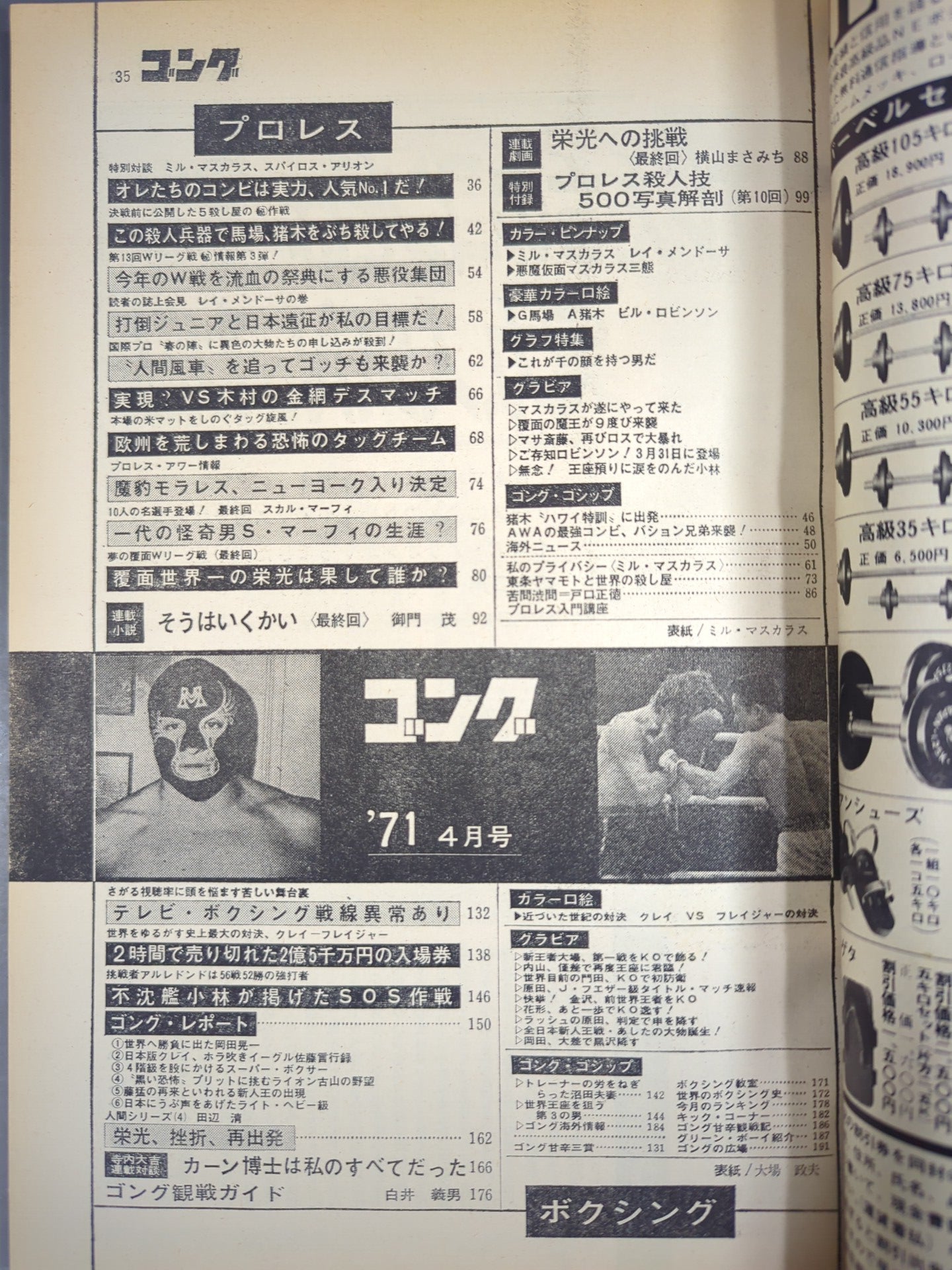 アリオン、マスカラスの特別対談 第13回Wリーグ決定版情報 クレイ、フレイジャー戦最終レポート /【付録】◯ピンナップ(ミル・マスカラス、レイ・メンドーサ/悪魔仮面M・マスカラス三態) ◯特別付録(第10回 プロレス殺人技500写真解剖) ×ジャンボピンナップ(ジャイアント馬場vsザ・ストンパー) 表紙:ミル・マスカラス、大場政夫