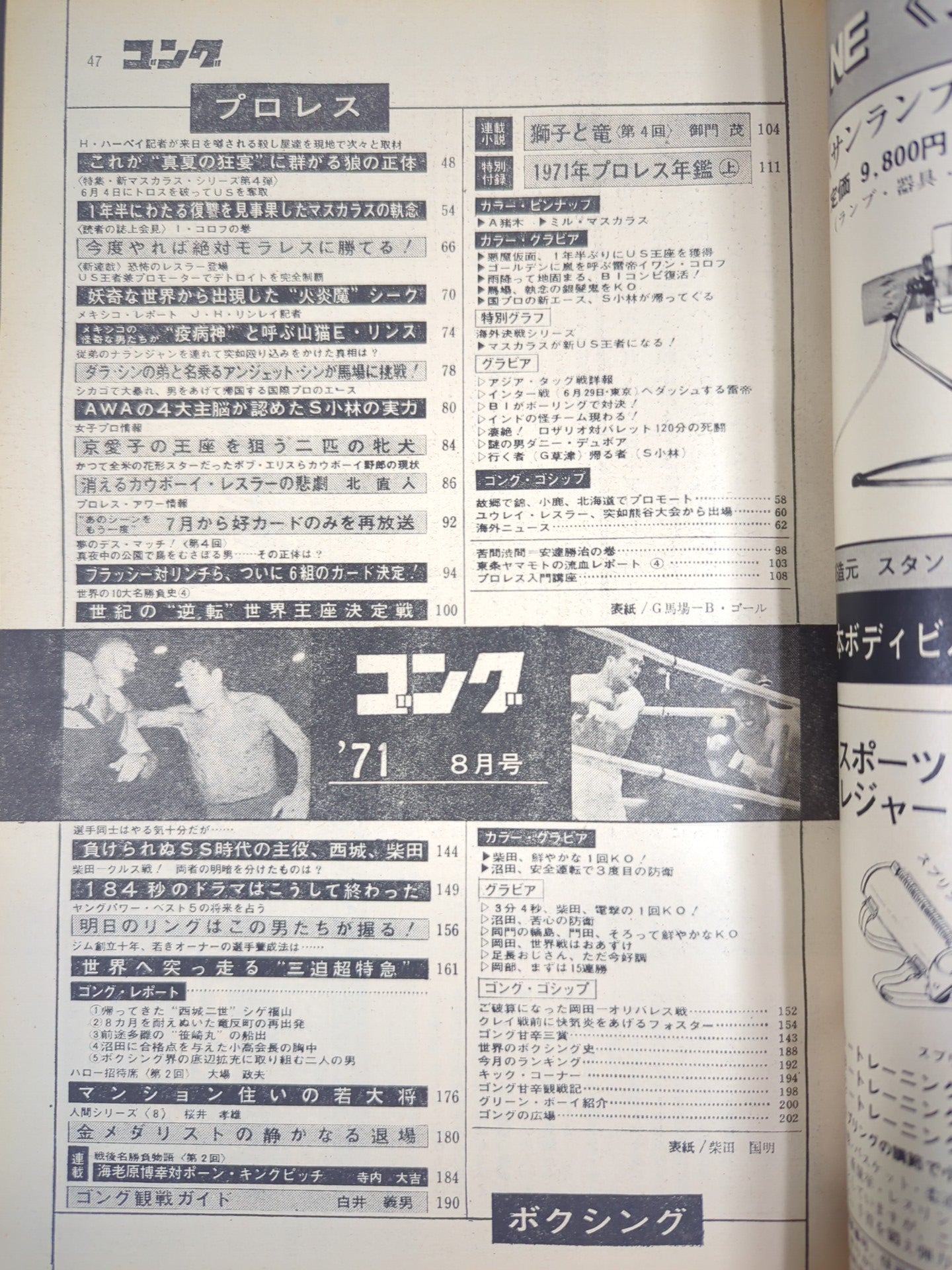 好評マスカラス・シリ-ズ / サマー・シリーズ展望特集 / 負けられぬ”SS時代”の主役、西城、柴田 / 【付録】○ピンナップ(アントニオ猪木/ミル・マスカラス) ◯特別付録(1971年プロレス年鑑・上巻) / 表紙:ジャイアント馬場、柴田国明