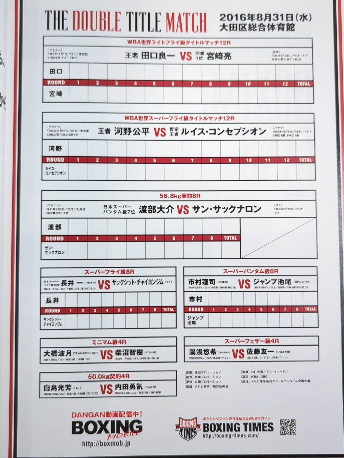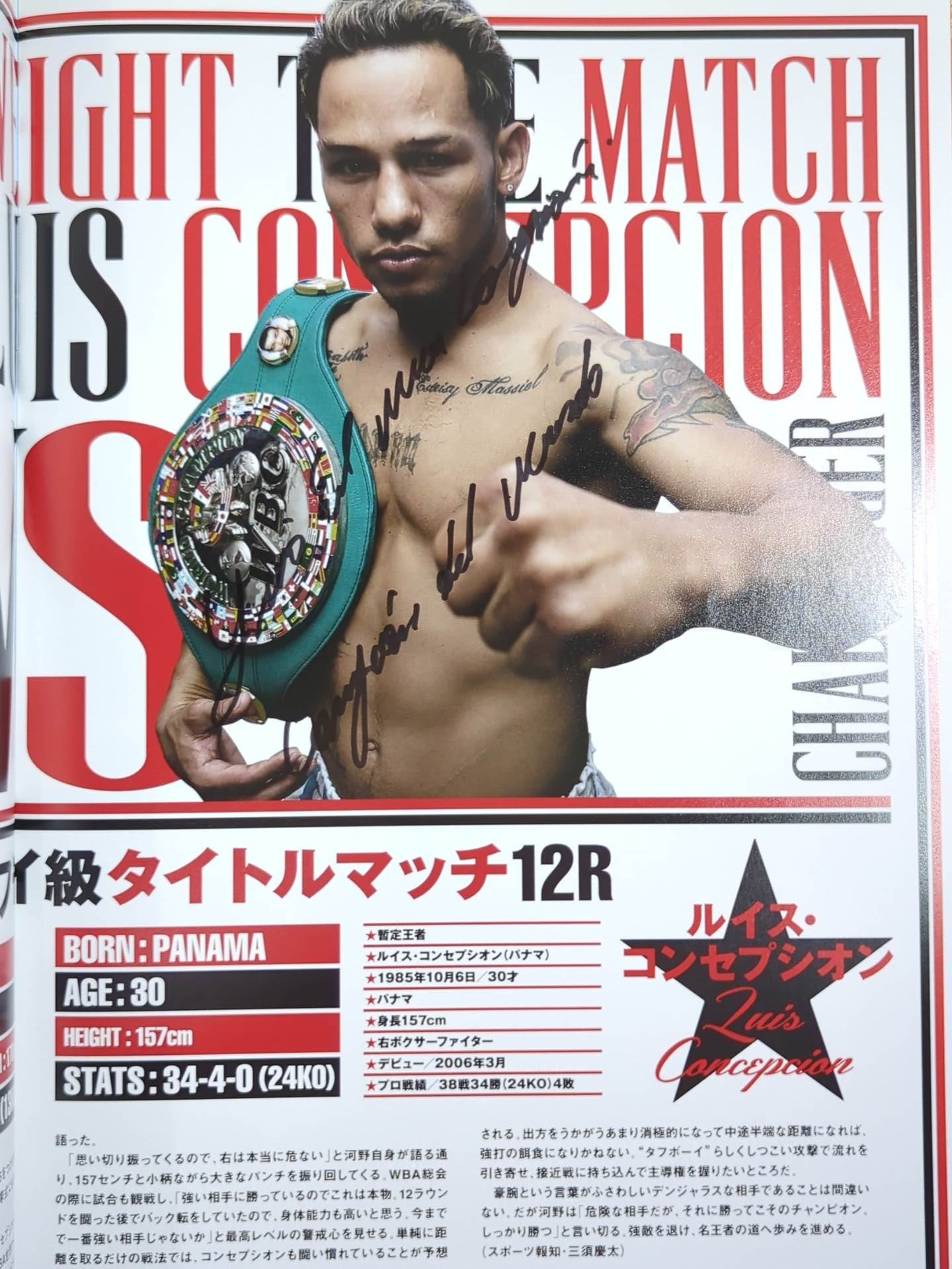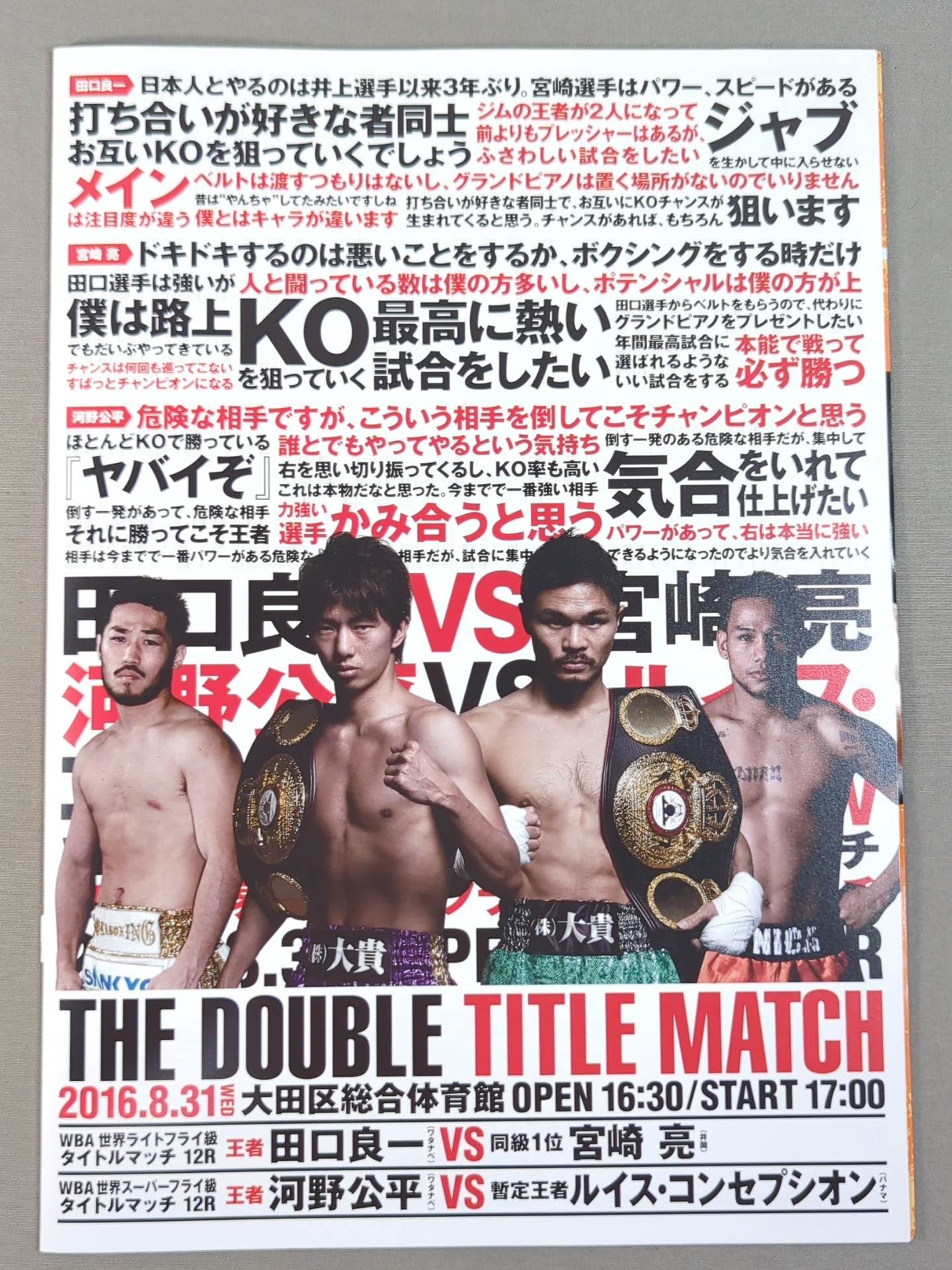 田口良一、ルイス・コンセプシオン 以上 2選手直筆サイン入り!! / 会場:大田区総合体育館 / 印刷対戦カード:【WBA世界ライトフライ級タイトルマッチ】田口良一vs宮崎亮 /【WBA世界スーパーフライ級タイトルマッチ】河野公平vsルイス・コンセプシオン