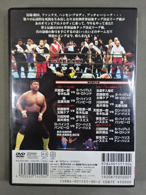武藤&ケアvs天龍&冬木 川田&長井vs嵐&北原戦など / 馬場・鶴田、ファンクス、ブッチャー・シーク・・・数々の伝説的な死闘を生み出した年末恒例世界最強タッグ決定リーグ戦があのオリンピアのメロディに乗って、今年もやって来た!!夢と伝統の2001世界最強タッグ決定リーグ戦。真の最強の称号を手にするのはいったいどのチームだ?!興奮のゴングは今、鳴らされる・・・