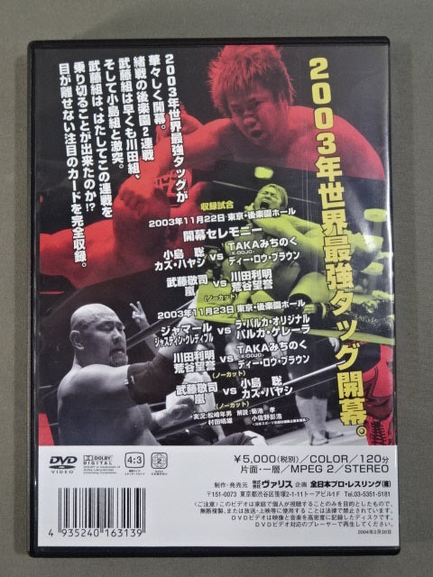 武藤、嵐vs小島、カズ・ハヤシ 他全5試合 ○2003年世界最強タッグが華々しく開幕。緒戦の後楽園2連戦、武藤組みは早くも川田組み、そして小島組みと激突。武藤組は、はたしてこの連戦を乗り切ることができたのか!?目が離せない注目のカードを完全収録!!