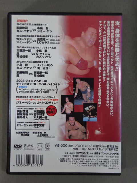 2003.3.22後楽園ホール武藤&カズvs小島&ジミー・ヤン 他、2003.04.04福島、2003.04.05長岡市、2003ジュニアヘビー級チャンピオンカーニバルハイライト、2003.04.10広島ジミー・ヤンvsカール・コンティニー 他 ○橋本真也が持ち去った三冠ベルト。今の嵐はそのベルトにしか興味がない。全日本屈指の身体に大いなる野望が宿れば、誰にも嵐を止められない!!