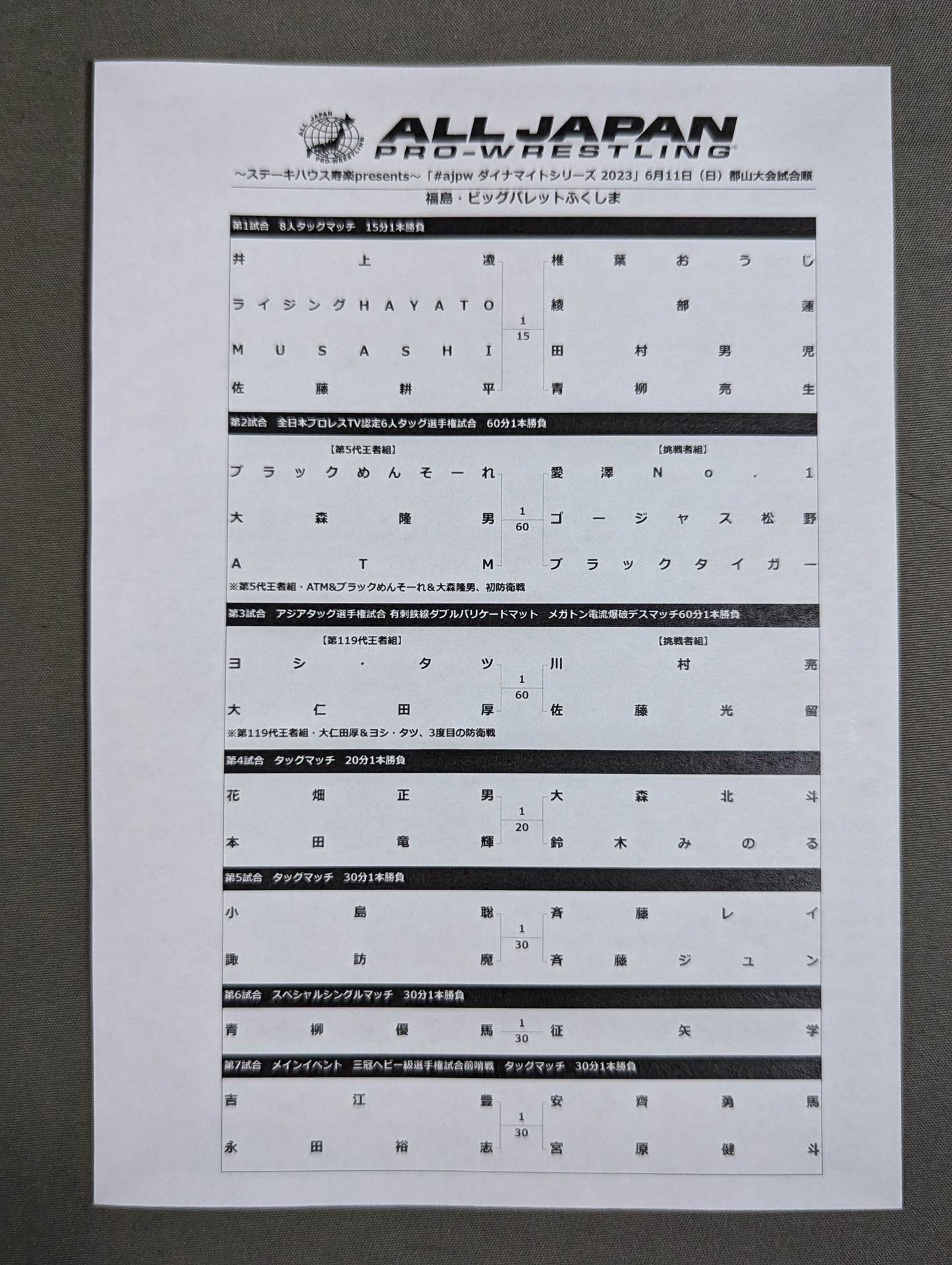 会場:福島・ビッグパレットふくしま / 別紙対戦カードあり:吉江豊&永田裕志vs安齊勇馬&宮原健斗 / 【アジアタッグ選手権 有刺鉄線ダブルバリケードマット メガトン電流爆破デスマッチ】大仁田厚&ヨシ・タツvs佐藤光留&川村亮