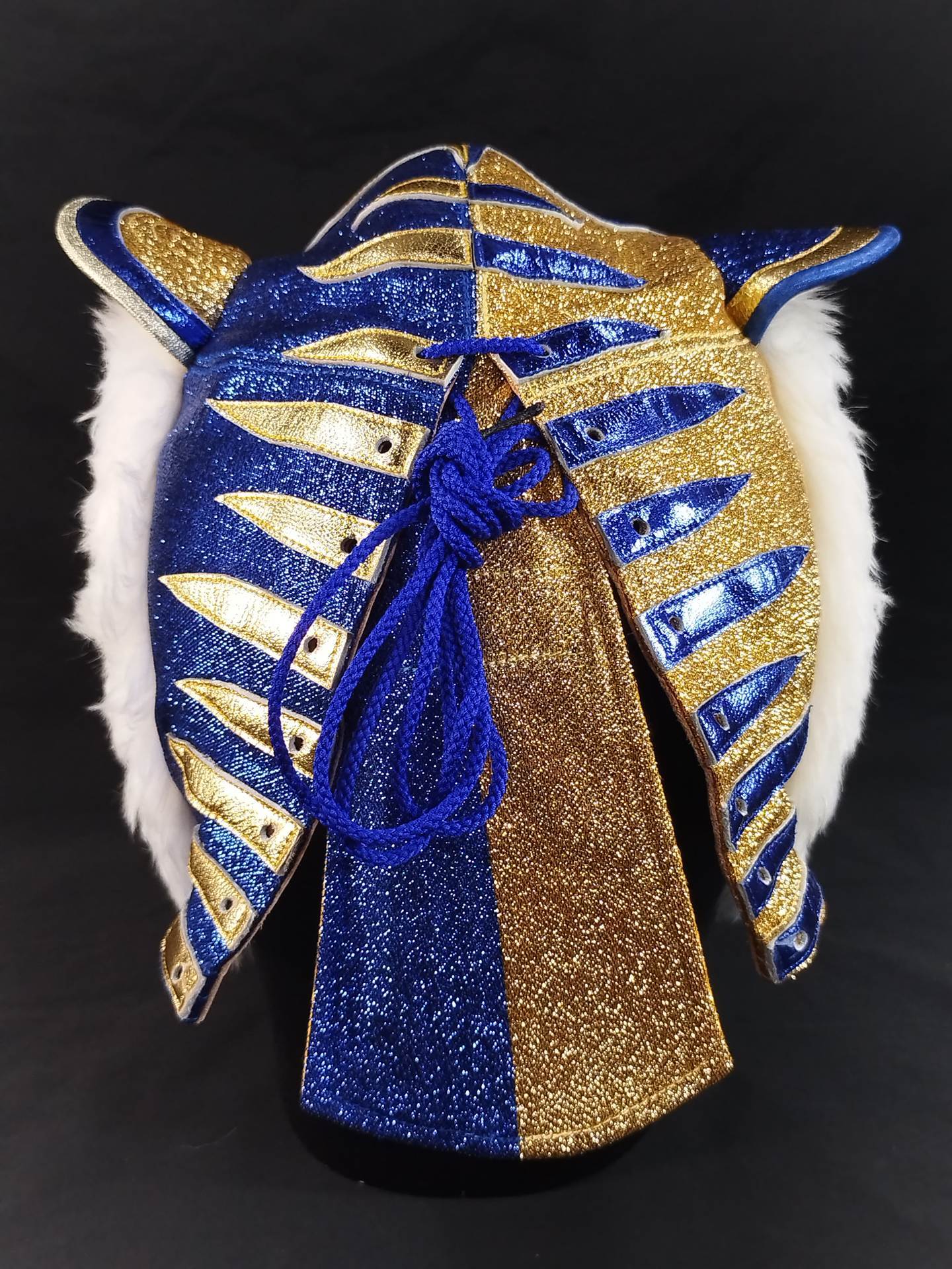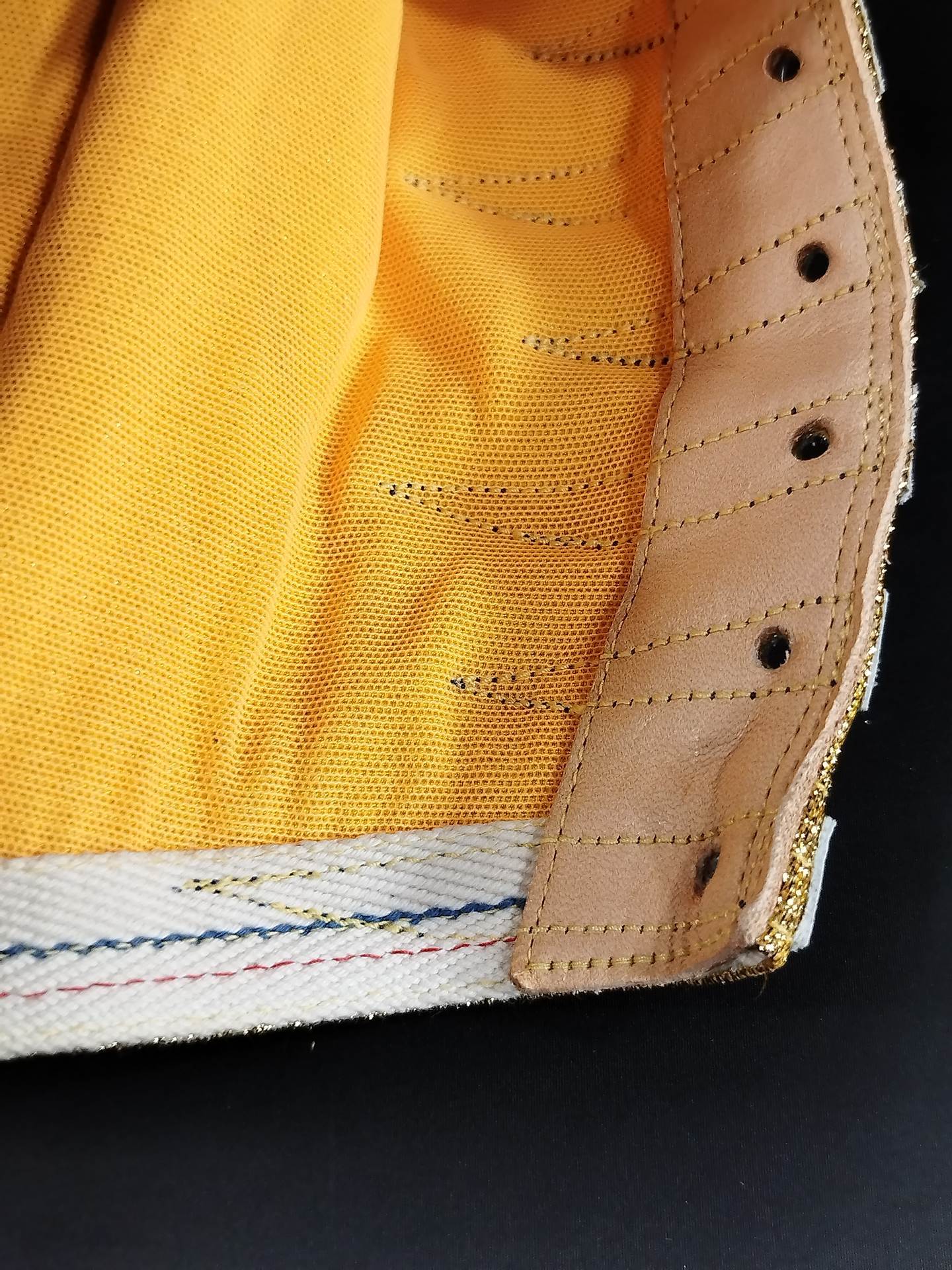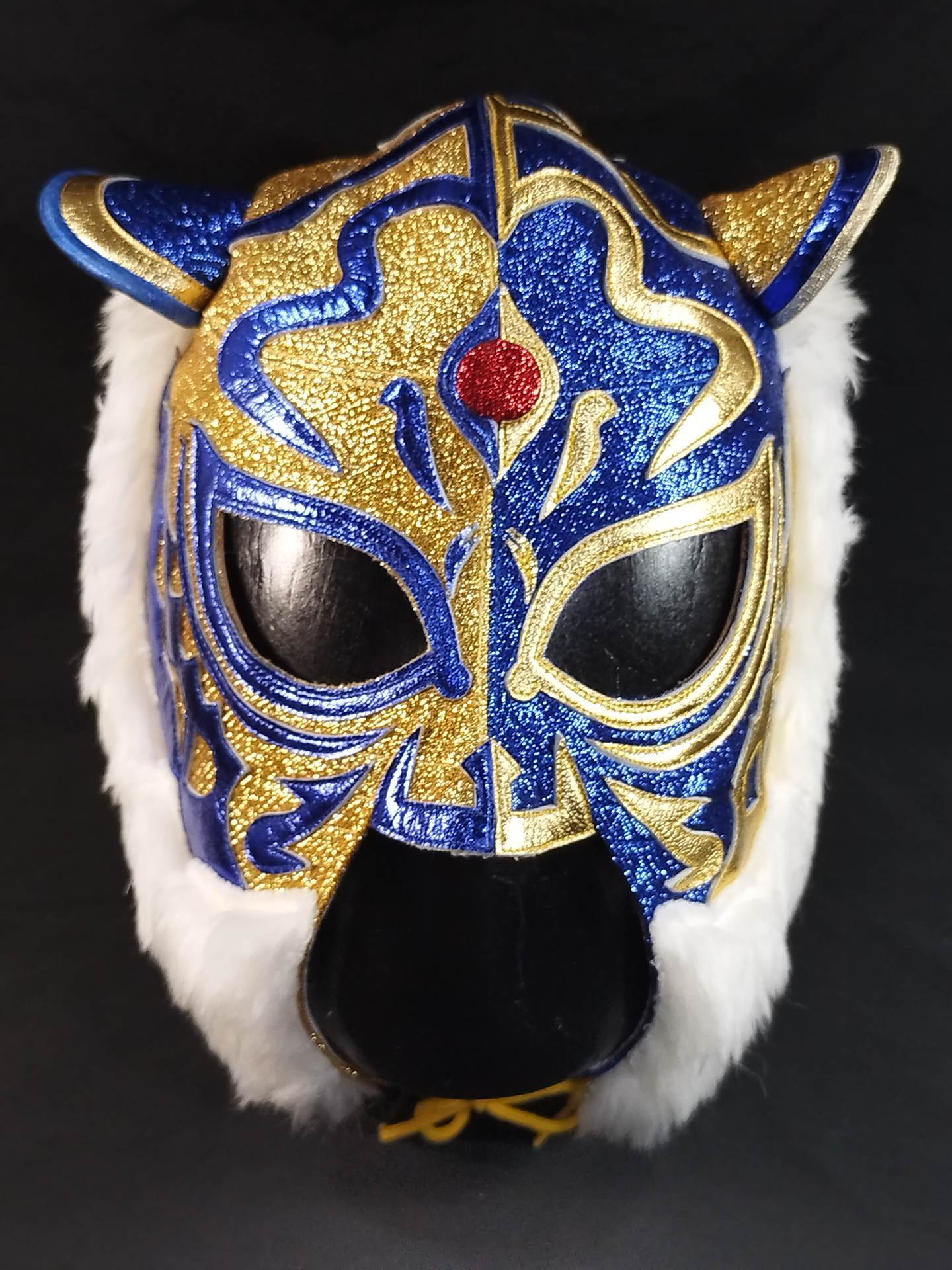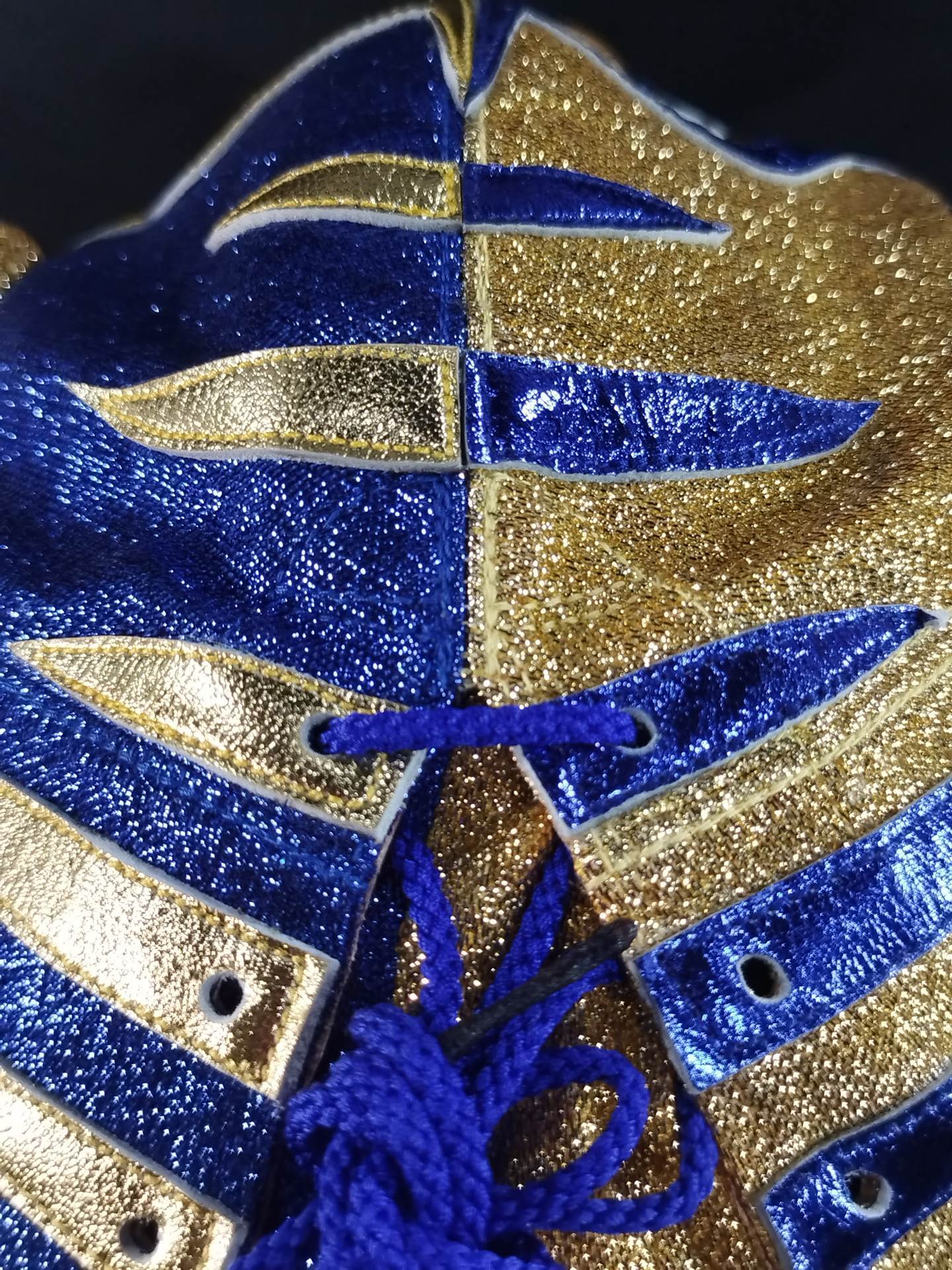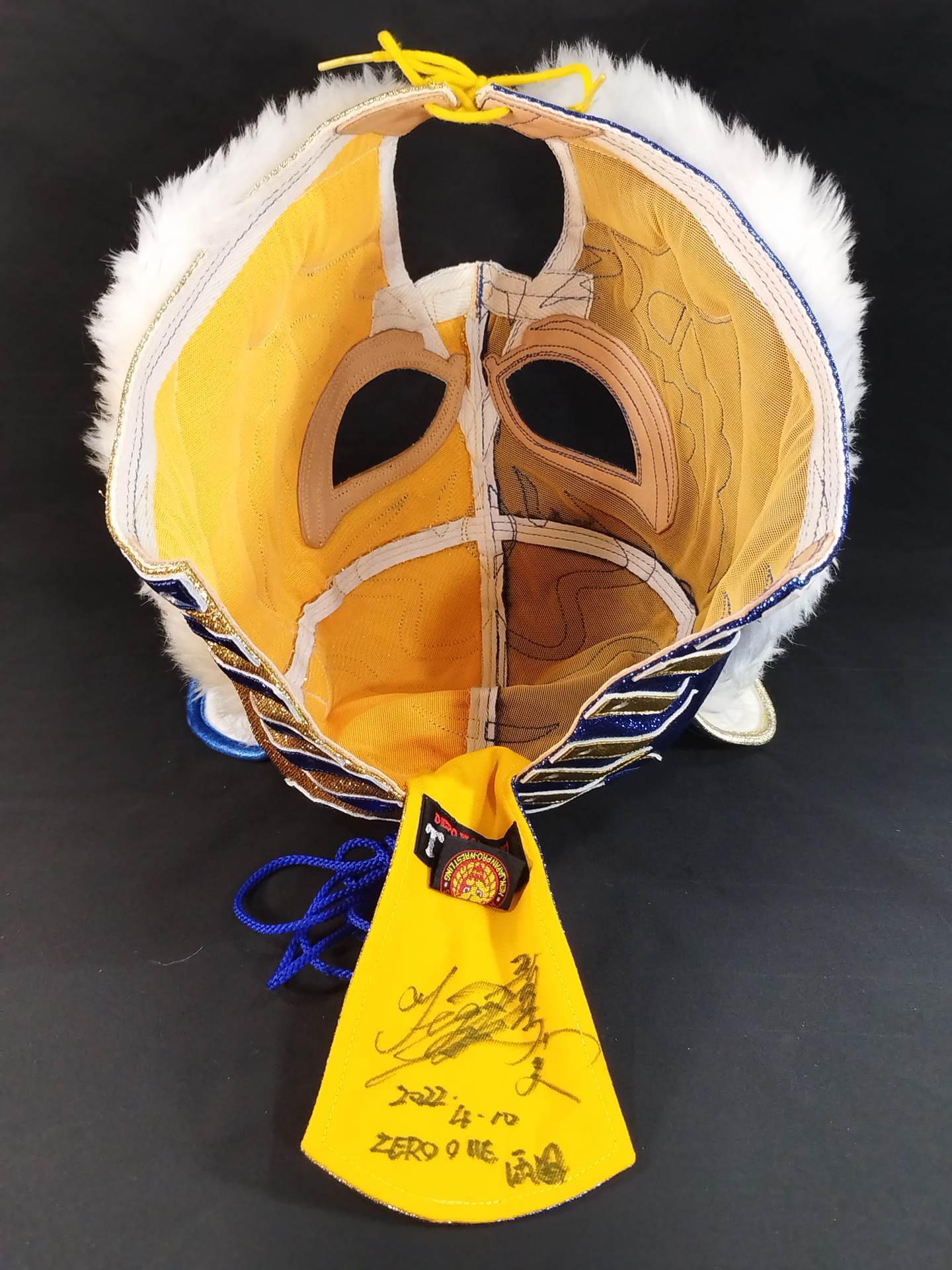 本人使用サイン入り(2022.4.10 ZEROONE 両国) 着用写真付 金&青ハーフラメ2重生地(メッシュ張り) 青特殊革フチ&金特殊革フチ 赤ランプ 2022年4月10日、東京・両国国技館で行われた「押忍PREMIUM〜ZERO1旗揚げ20周年&21周年記念大会〜プロレス」の8人タッグマッチで使用したもの
