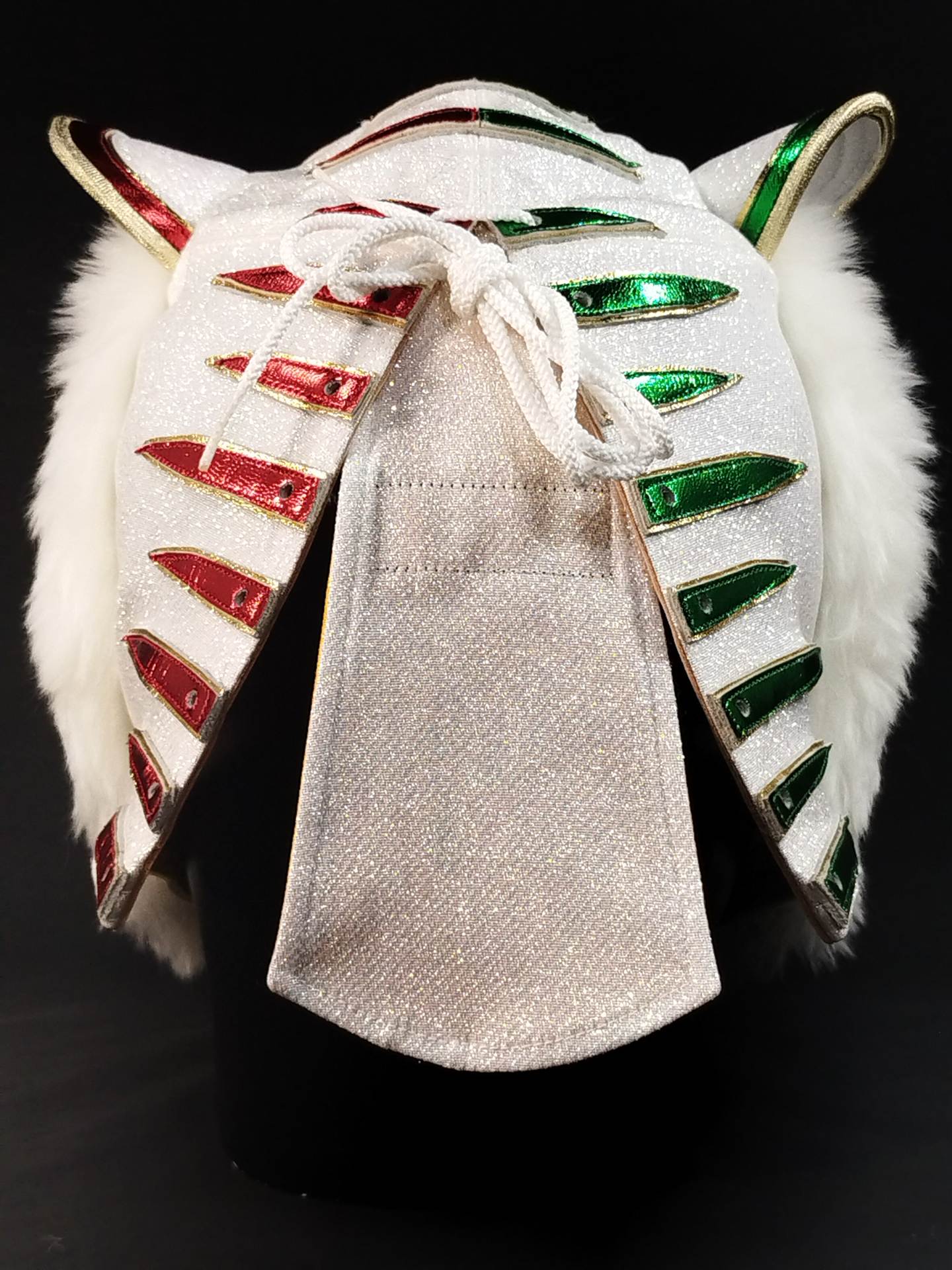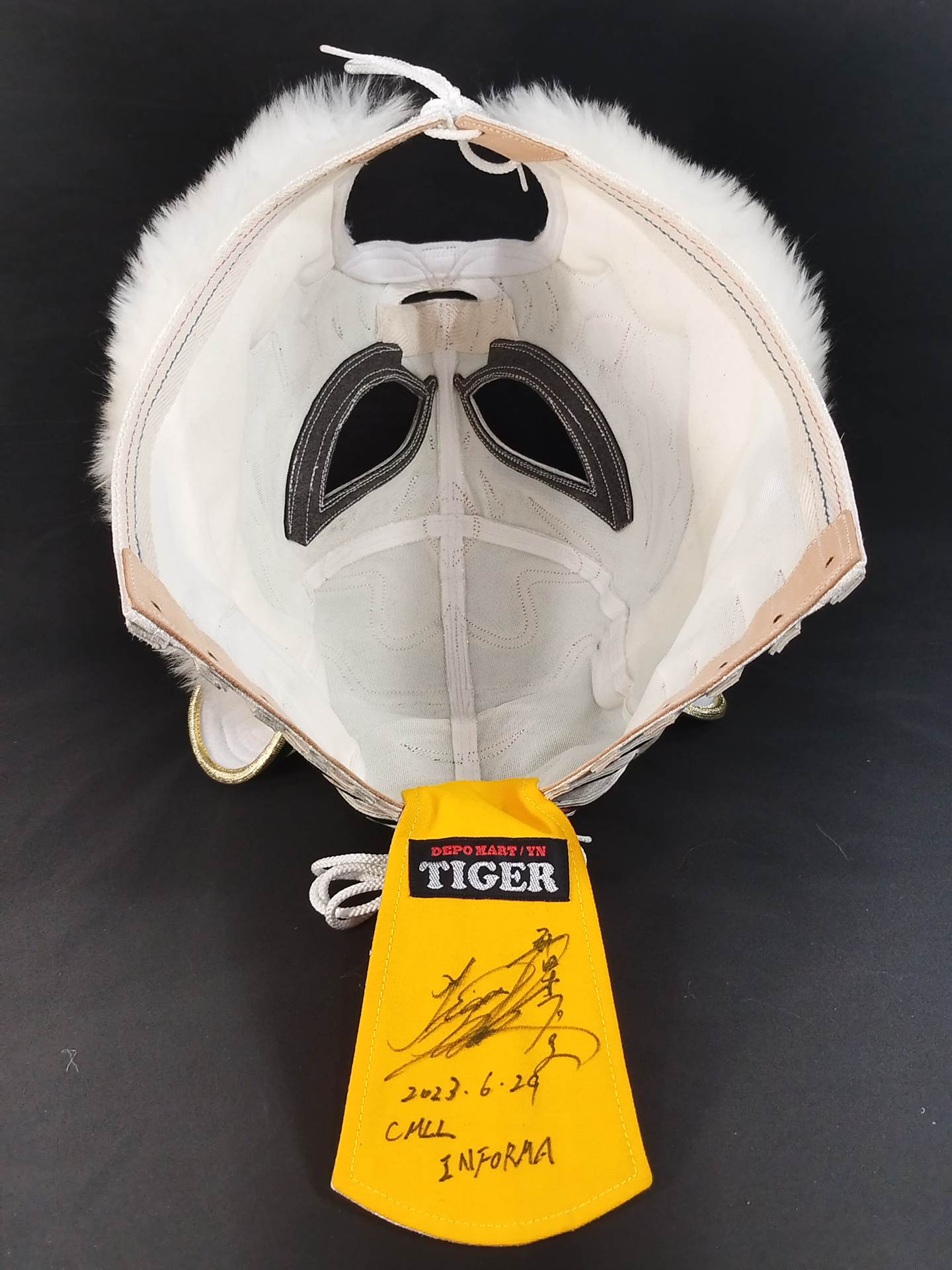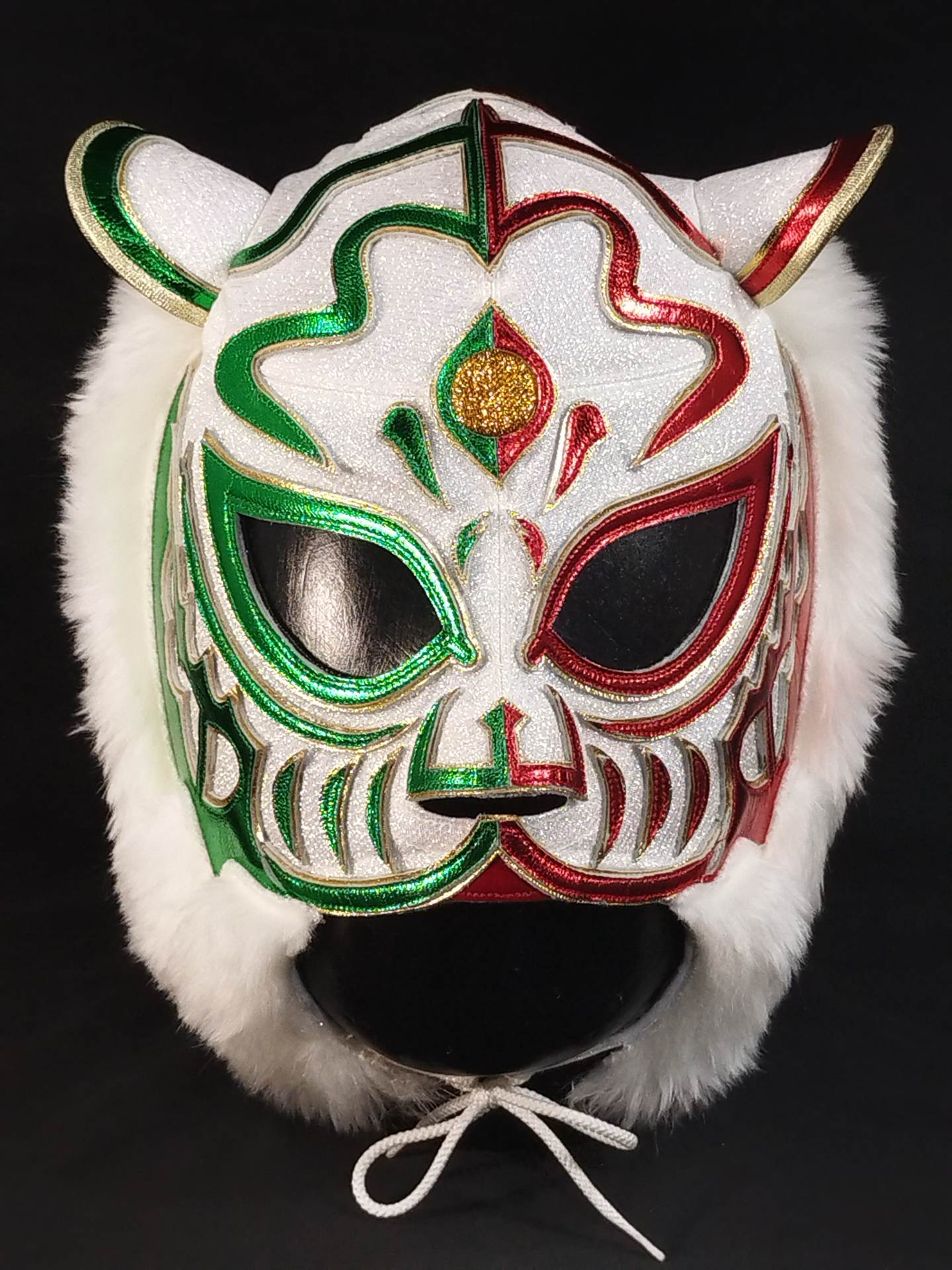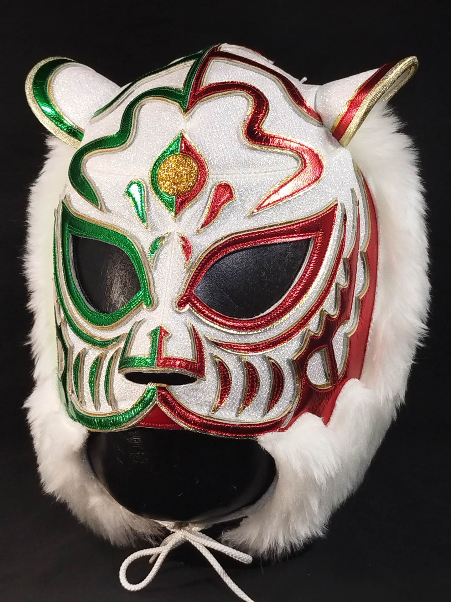 本人使用サイン入り(2023.6.29 CMLL INFORMA) 着用写真付 パールラメ2重生地(メッシュ張り) 金特殊革地緑特殊革フチ&赤特殊革フチ