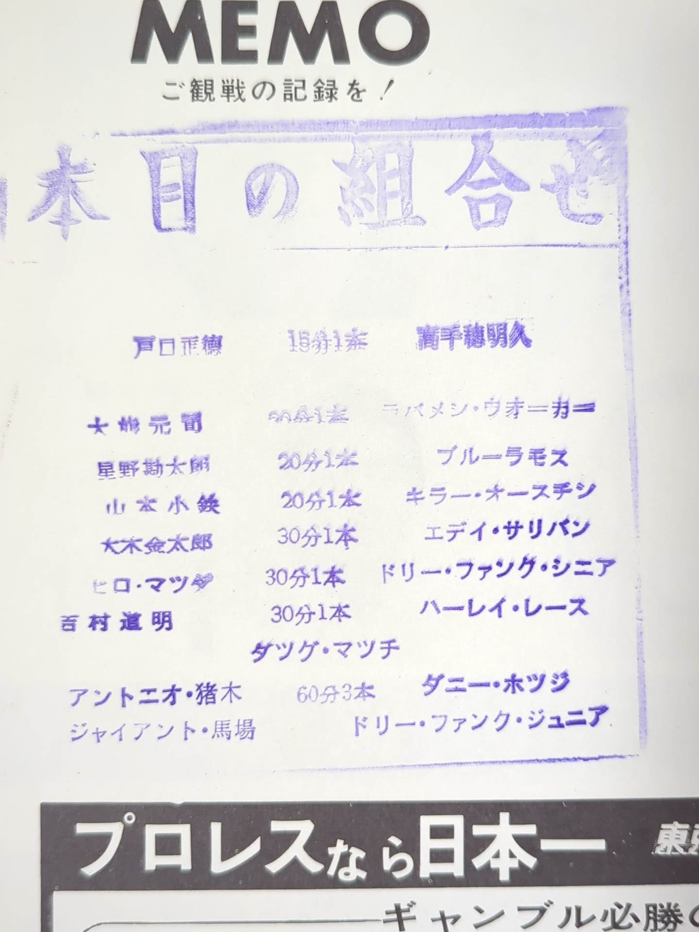 会場:蔵前国技館 / スタンプあり:【インタータッグ選手権試合】アントニオ猪木&ジャイアント馬場vsダニー・ホッジ&ドリー・ファンク・ジュニア / 吉村道明vsハーリー・レイス(ハーレイ・レースと記載)
