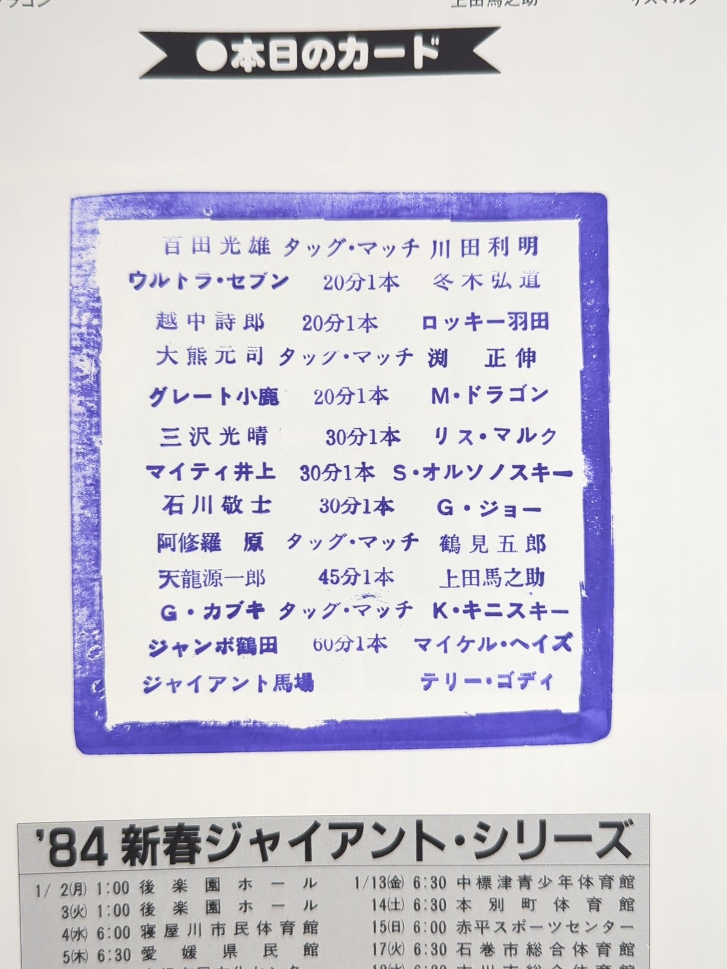 会場:北海道・中標津青少年体育館 / スタンプあり:ジャイアント馬場&ジャンボ鶴田&ザ・グレート・カブキvsテリー・ゴディ&マイケル・ヘイズ&ケリー・キニスキー / 天龍源一郎&阿修羅・原vs上田馬之助&鶴見五郎