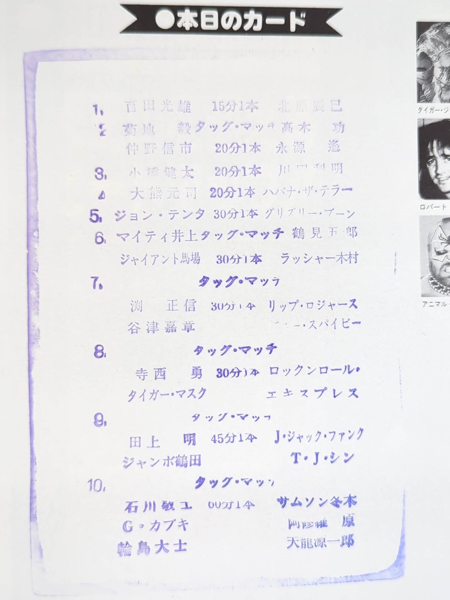 会場:後楽園ホール / スタンプあり:輪島大士&ザ・グレート・カブキ&石川敬士vs天龍源一郎&阿修羅原&サムソン冬木 / ジャンボ鶴田&田上明vsタイガー・ジェット・シン&ジミー・ジャック・ファンク