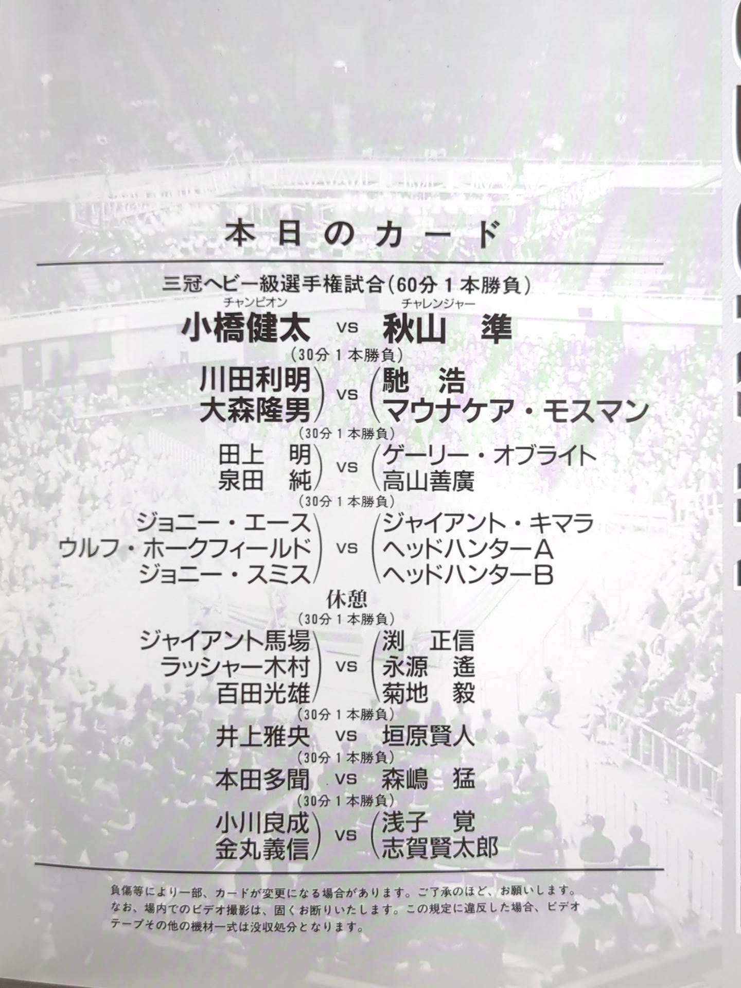 会場:日本武道館 /  印刷対戦カード:【三冠へビー級選手権試合】小橋健太vs秋山準 / 川田利明&大森隆男vs馳浩&マウナケア・モスマン