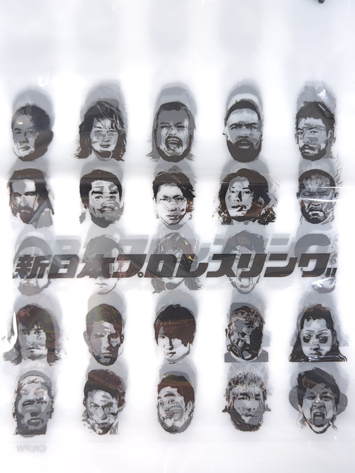 棚橋弘至、オカダ・カズチカ、内藤哲也、エル・デスペラード、飯伏幸太、ウィル・オスプレイほか新日本プロレス選手オールスターの顔イラストがデザインされています。
