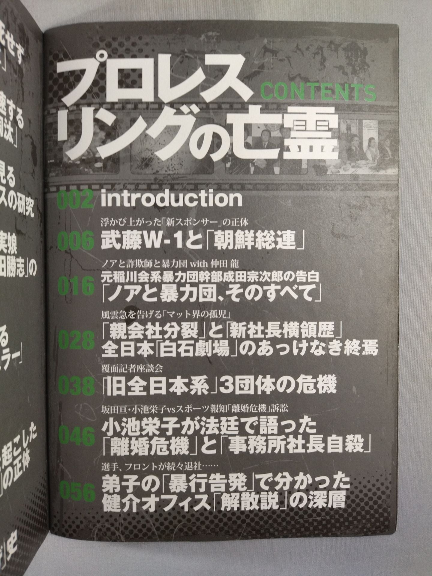 2013年 ムック(別冊宝島2084) 宝島社 / 迷走を続ける旧全日本系3団体。「王道」の自分勝手な解釈によりマット界を焼け野原にした戦犯たちの罪状を暴く。好調が伝えられる新日本の経営実態。国政復帰したアントニオ猪木と安倍政権の奇妙なパワーゲーム。武藤全日本が置き去りにした負の遺産。終わっていないノアの暴力団問題など、マット界の最新スキャンダルをえぐる人気シリーズ最新作。
