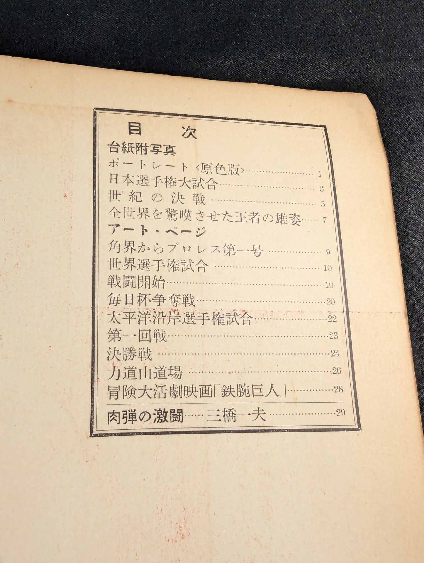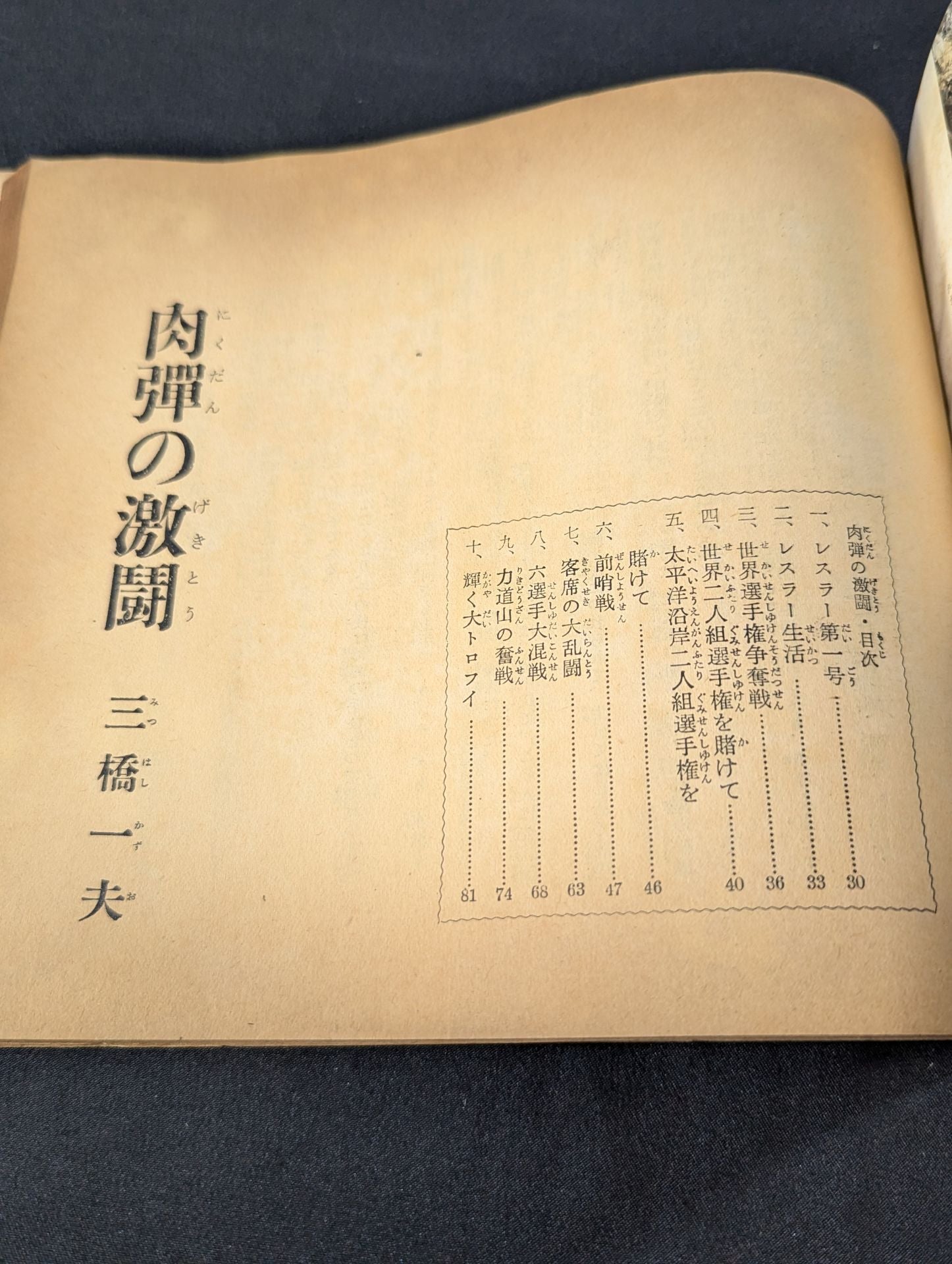 単(ソフトカバー) 久保書店 / 前年に行われたシャープ兄弟との世界タッグチーム選手権試合、ハンス・シュナベル&ルー・ニューマン組との太平洋沿岸タッグチーム選手権試合、 ”昭和の巌流島”と呼ばれる木村政彦との日本選手権大試合、それぞれの試合写真が掲載された貴重な1冊。一部の写真は印刷ではなく、写真をページ台紙に直接貼り付けた特別な仕様となっている。巻末には三橋一夫が力道山のプロレスデビューから太平洋沿岸タッグチーム選手権までを書いた『肉弾の激闘』を掲載。