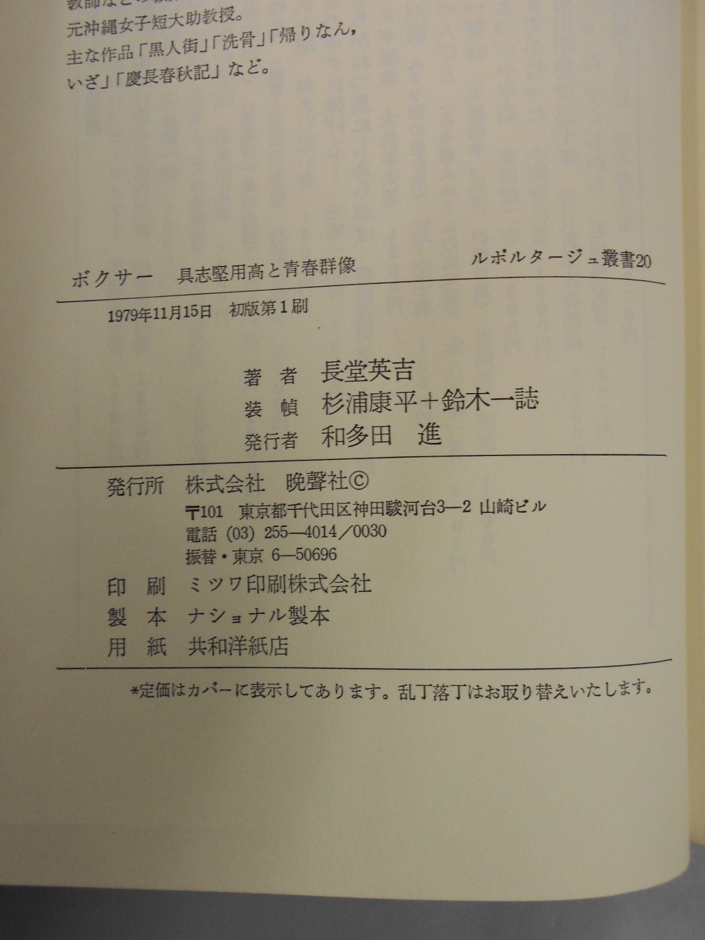 1979年 単(ハードカバー) 晩聲社 / ルポルタージュ叢書 沖縄人にとって具志堅の登場は、たんに傑出したスポーツ選手の出現というだけにとどまらない。すこしおおげさに言えば、慶長の役以来のたまりにたまったうっぷんを吹きとばしてくれた大事件であった。