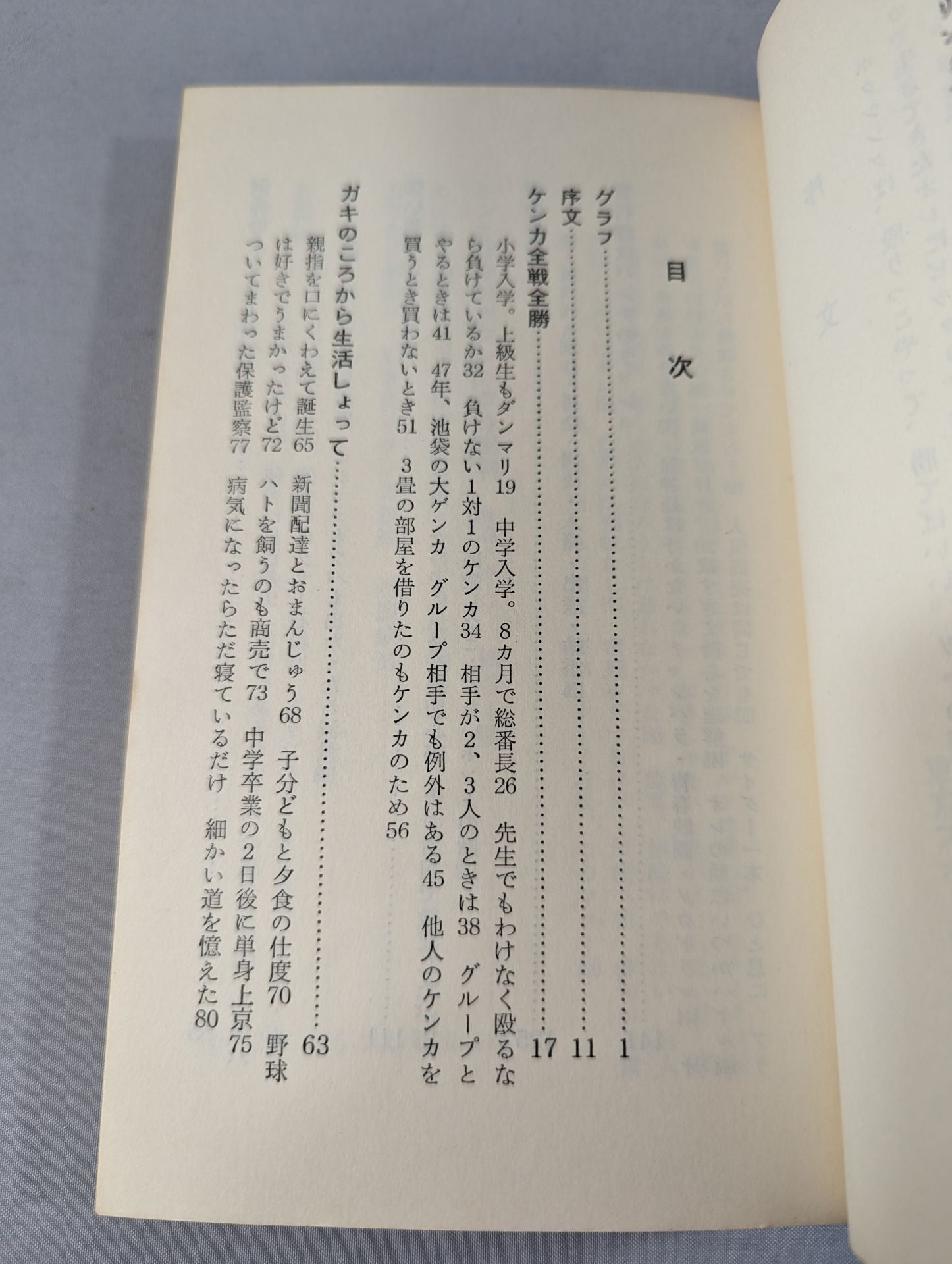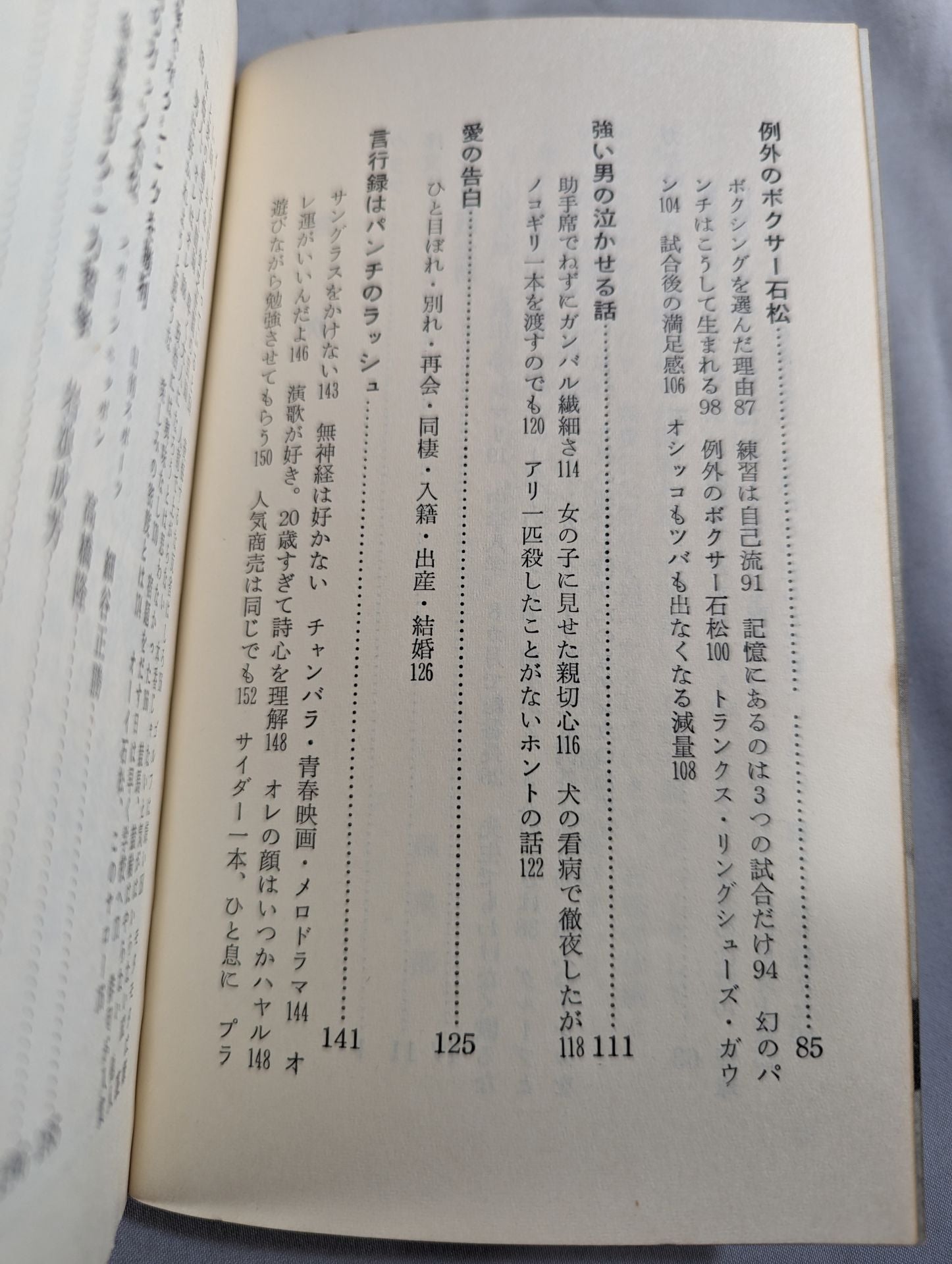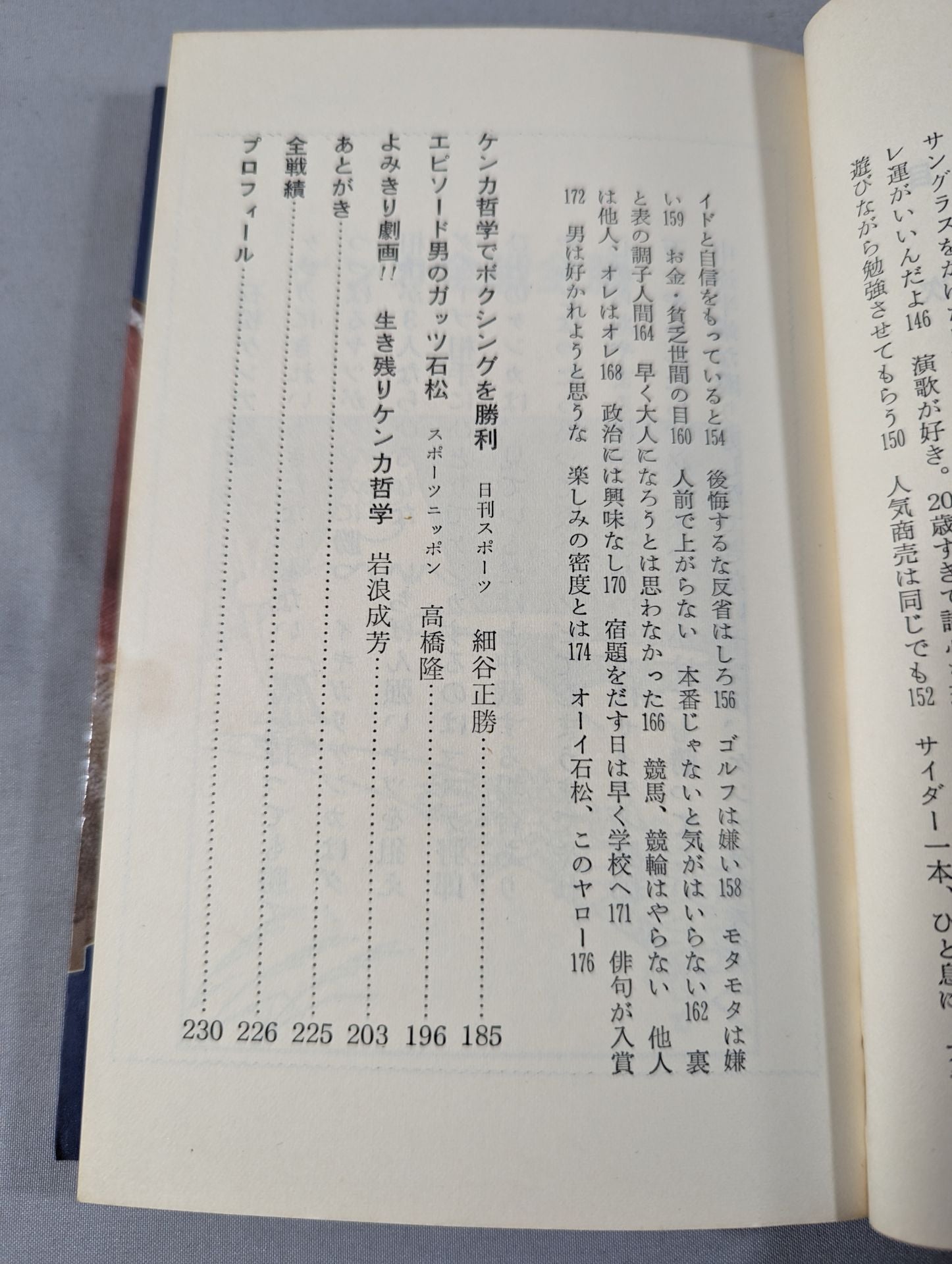 1975年 新(ソフトカバー) NP出版(エヌピー出版) / ボクシングは、殴りっこやって、勝てばいい。ガキの頃から、ケンカ、ケンカで生きてきたオレにピッタリ。おまけに、ボクシングに必要なのは、パンツ 一丁。お金がないオレにむいていた。負けないケンカ。ボクシングでは1敗しているが、ケンカは全戦全勝。オレがスーパーマンだから、ケンカに負けなかったんじゃない。このケンカの話を中心に、『生き残りケンカ哲学』は、最終ラウンドまでつっばしる。オレの考え方や生き方が、おもしれえ、と楽しんでもらえればVサインだ。(序文)