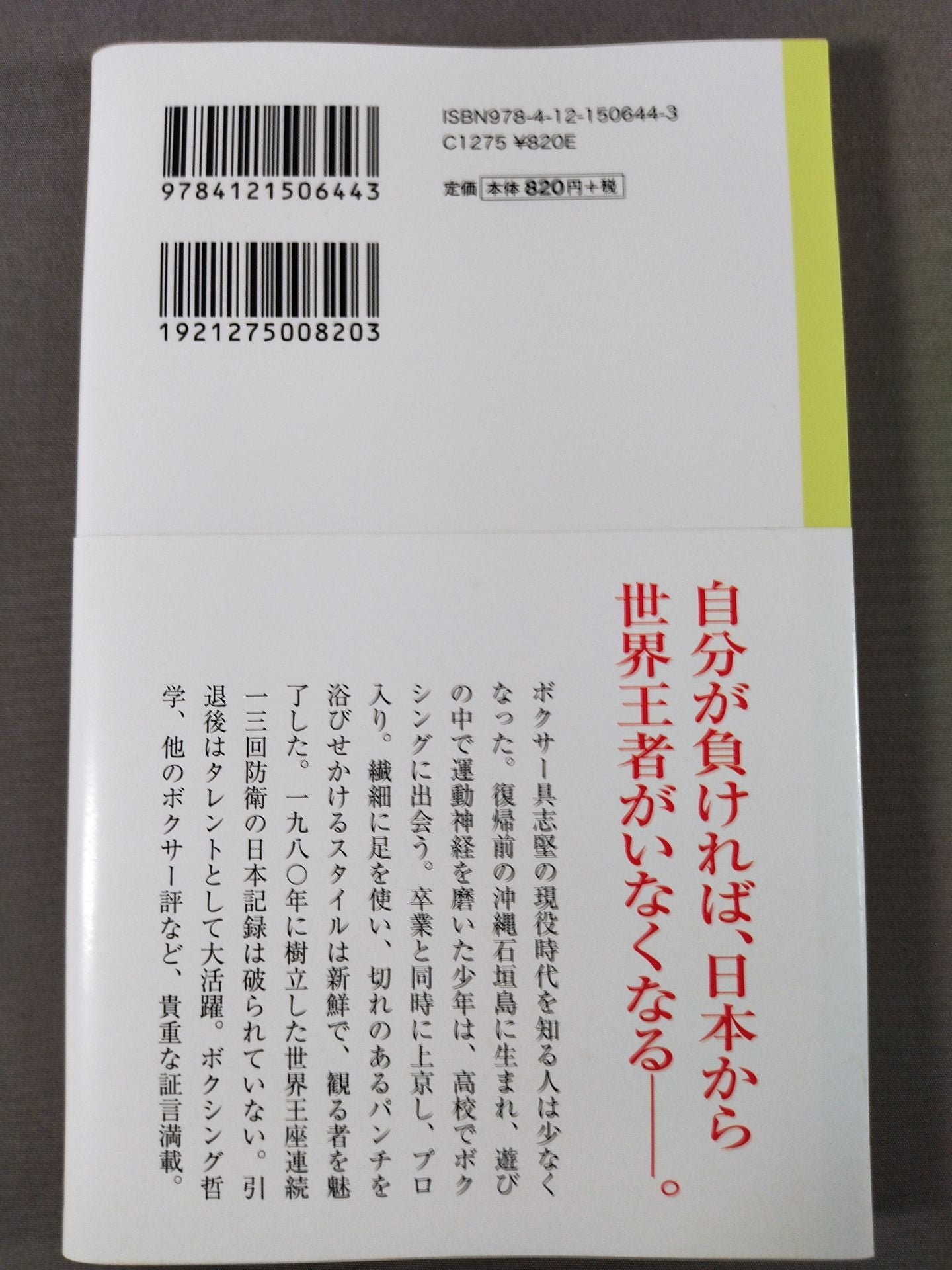 2019年 新(ソフトカバー) 中央公論新社 / ボクサー具志堅の現役時代を知る人は少なくなった。復期前の沖縄石垣島に生まれ、遊びの中で運動神経を磨いた少年は、高校でボクシングに出会う。卒業と同時に上京し、プロ入り。繊細に足を使い、切れのあるパンチを浴びせかけるスタイルは新鮮で、観る者を魅了した。一九八〇年に樹立した世界王座連続一三回防衛の日本記録は破られていない。引退後はタレントとして大活躍。ボクシング哲学、他のボクサー評など、貴重な証言満載!!