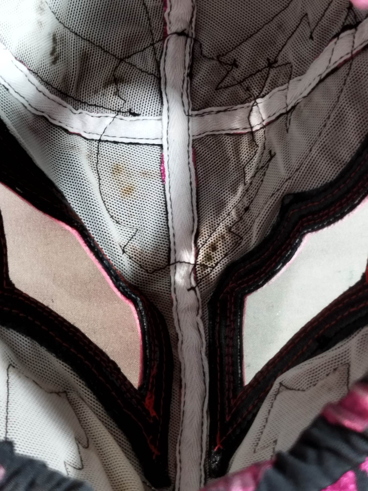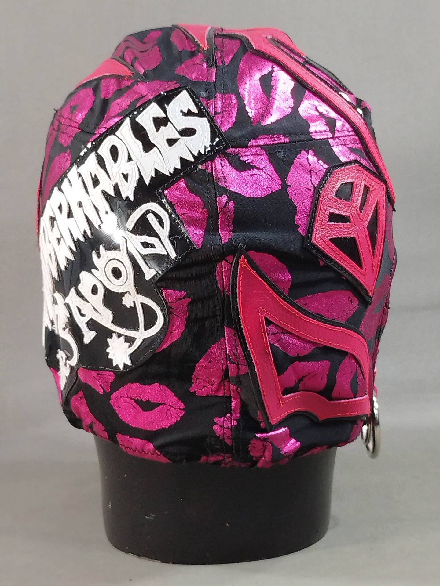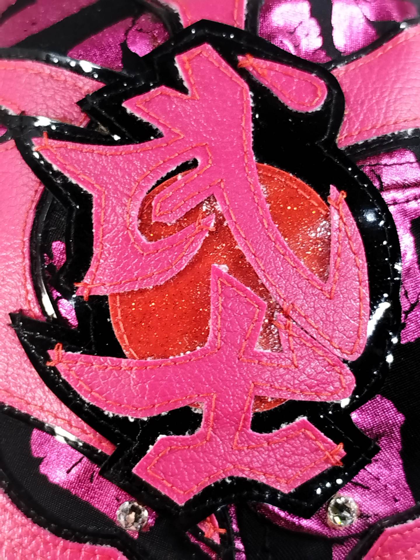 ★新ロゴ・口閉じタイプ★ サイン入り(2021.4.21) 黒レオタード2重生地(メッシュ張り・ピンクメタリックキスマーク模様) 黒地濃ピンク特殊フチ 公式ツイッター https://twitter.com/BUSHI_njpw/status/1384821875679715331