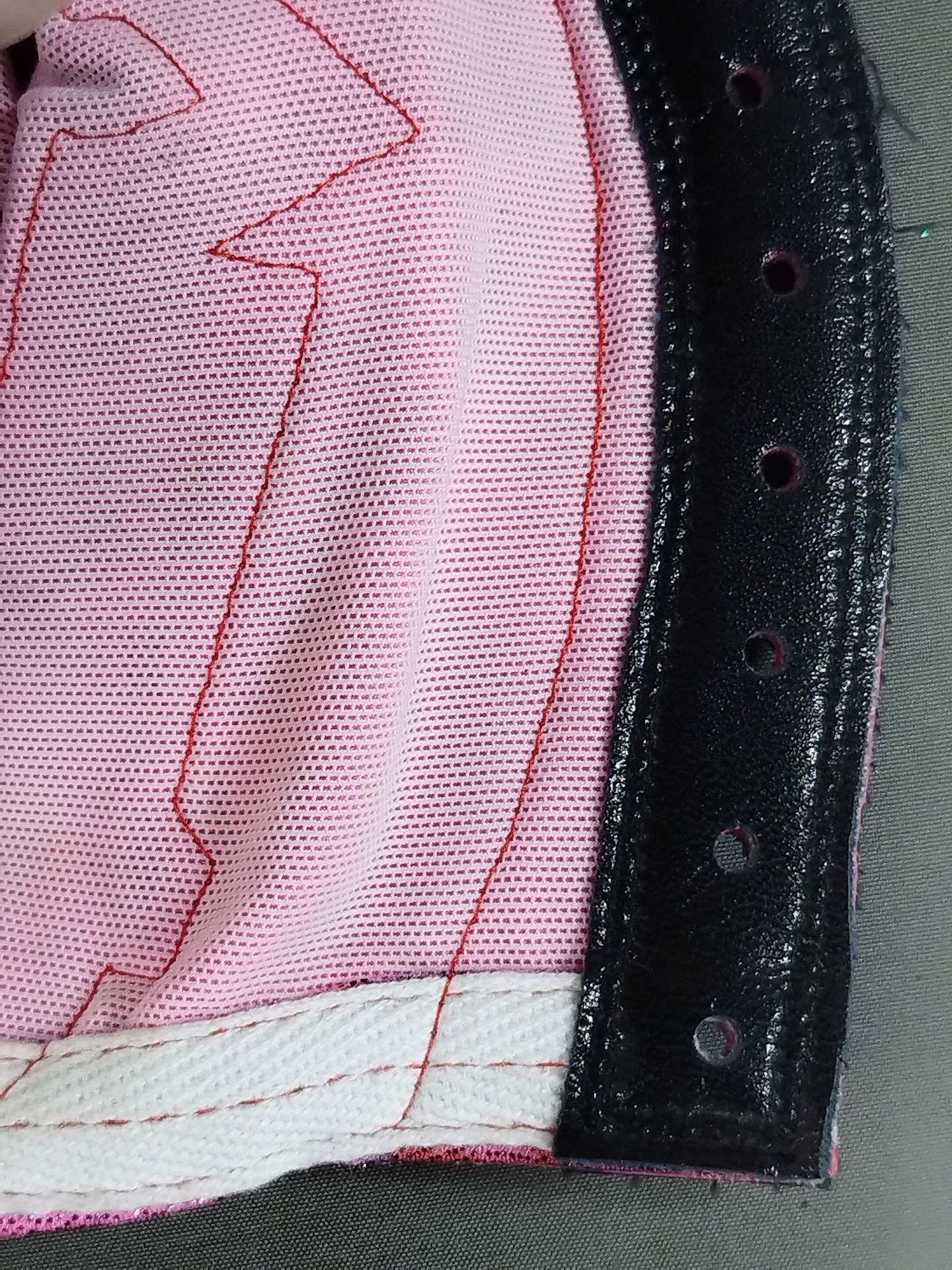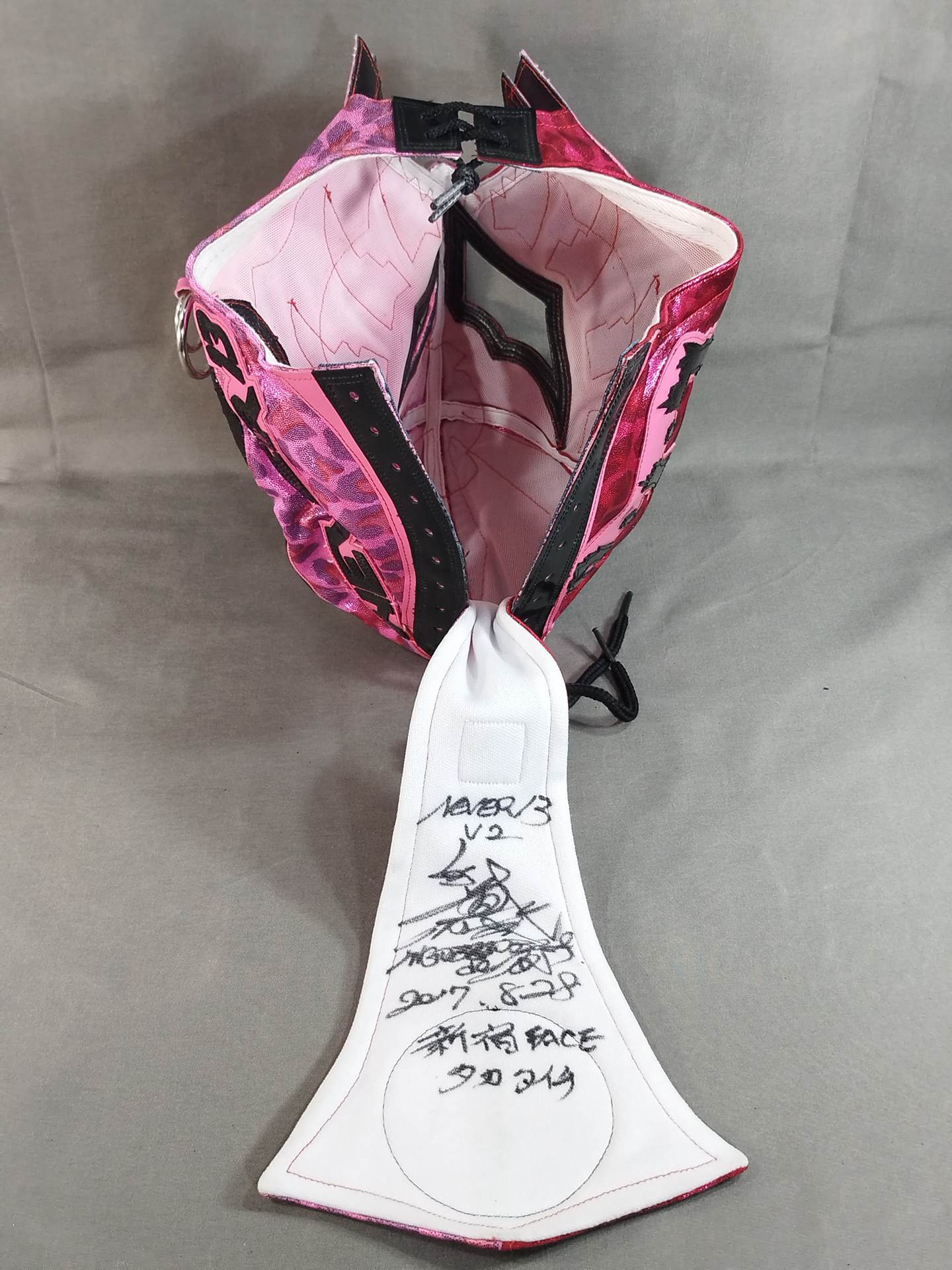 本人使用サイン入り(2017.8.28 新宿FACE タカタイチ) 着用写真付 ピンク特殊&濃ピンク特殊ハーフレオタード2重生地(メッシュ張り) ピンク地黒フチ ラインストーン装飾あり 2017年8月28日、新宿FACEで行われた「TAKA&タイチ興行 SEASON2」メインイベントのタッグ戦で使用したもの https://www.2aw.jp/results/20170828tt/