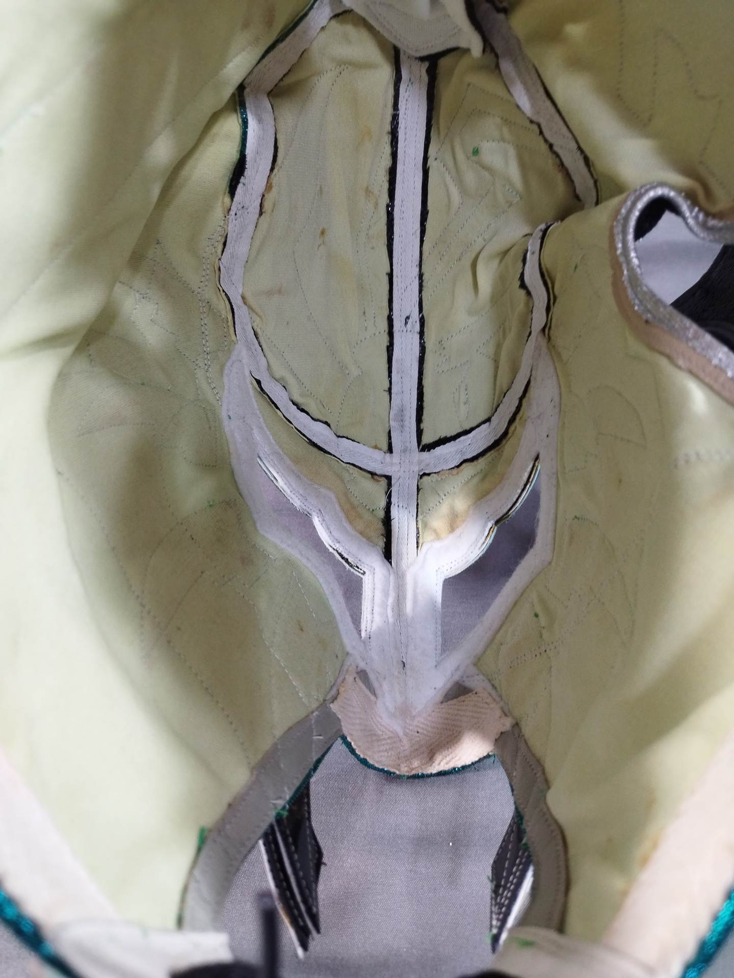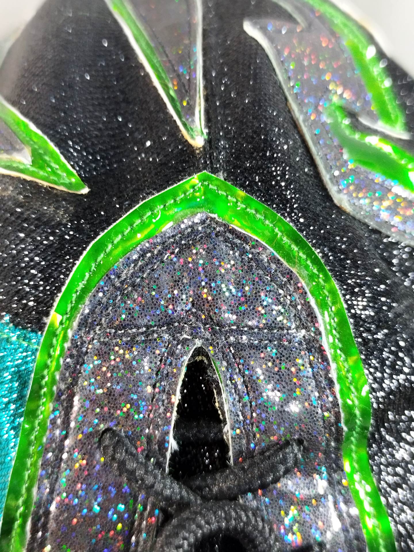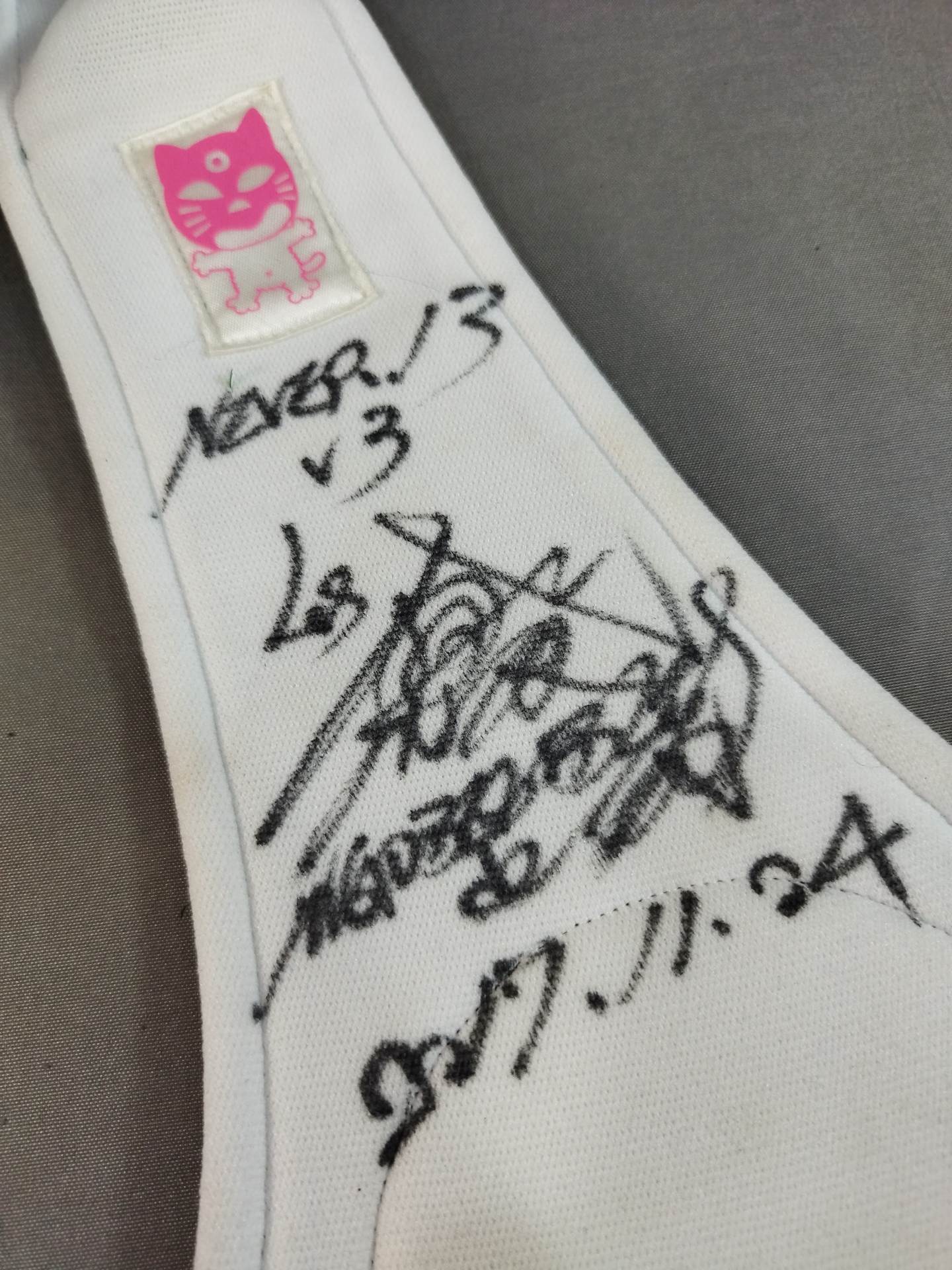 本人使用サイン入り(2017.11.24 NEVER13 V3) 着用写真付 黒&緑斜めハーフラメ 黄緑地黒特殊フチ ラインストーン装飾あり