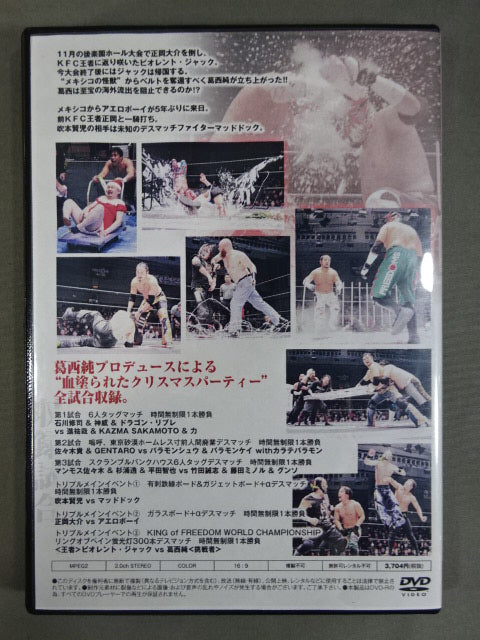 1月の後楽園ホール大会で正岡大介を倒し、KFC王者に返り咲いたビオレント・ジャック。今大会終了後にはジャックは帰国する。“メキシコの怪獣”からベルトを奪還すべく葛西純が立ち上がった!!葛西は至宝の海外流出を阻止できるのか!?葛西純プロデュースによる“血塗られたクリスマスパーティー”全6試合収録!!