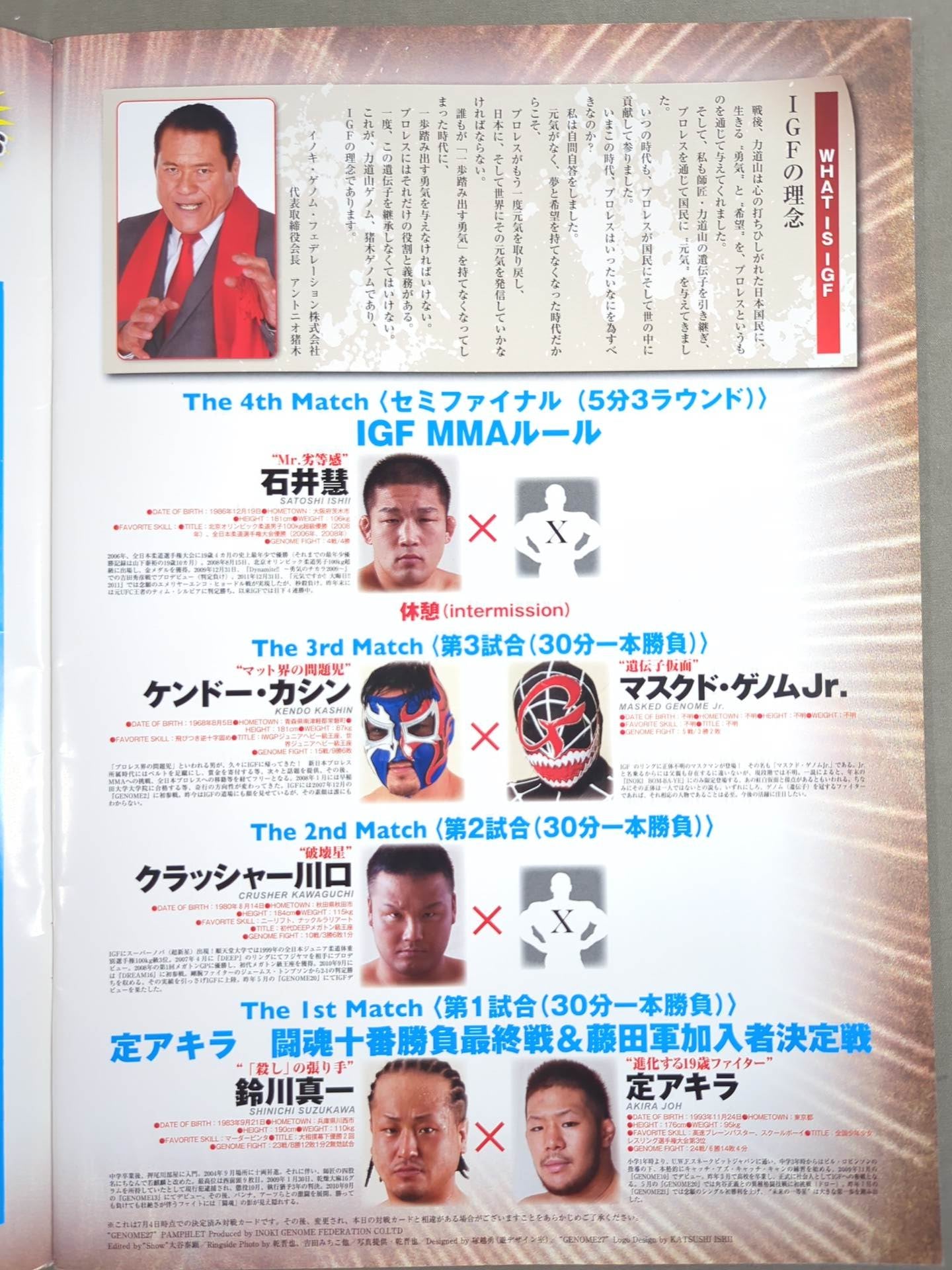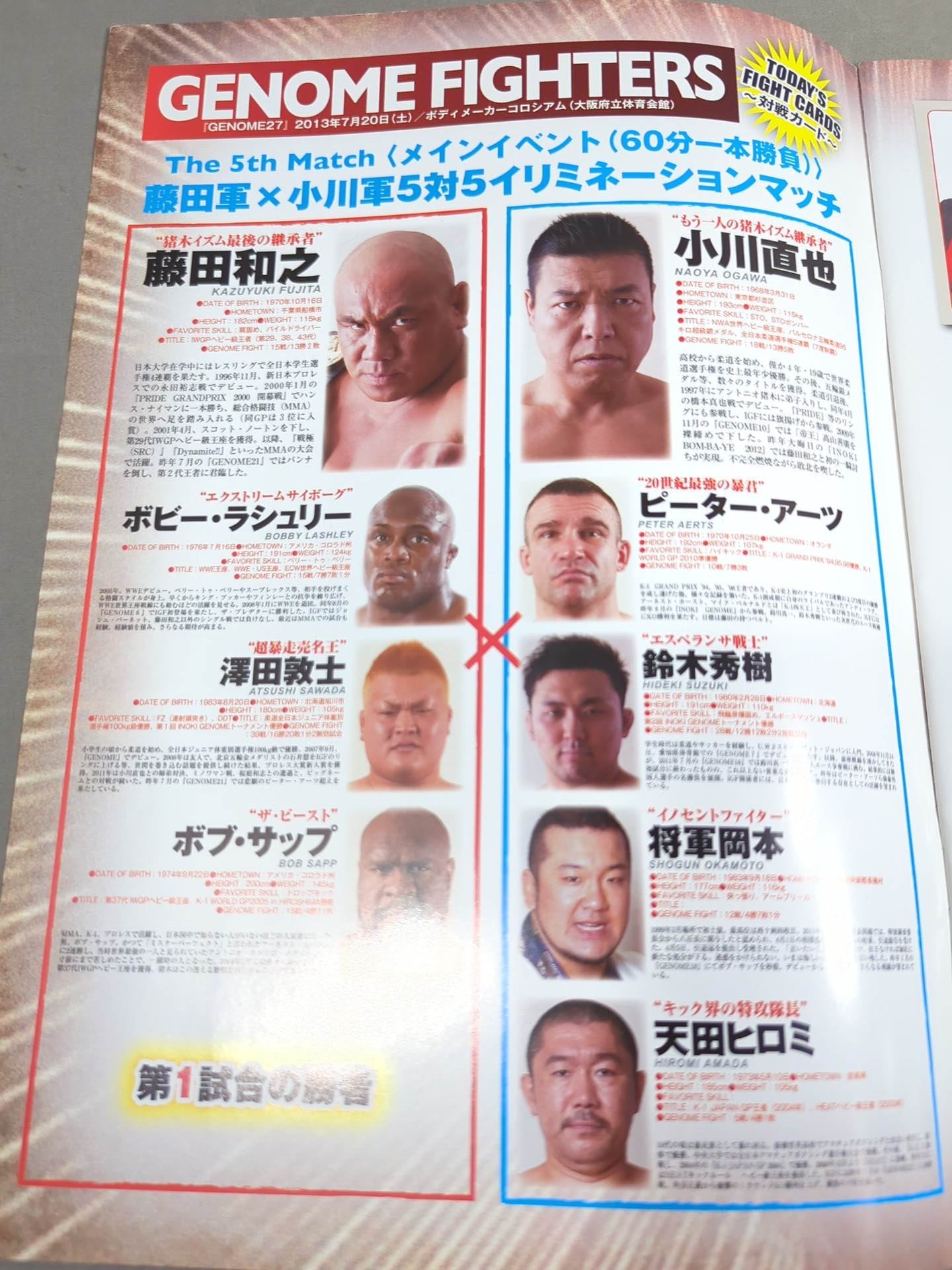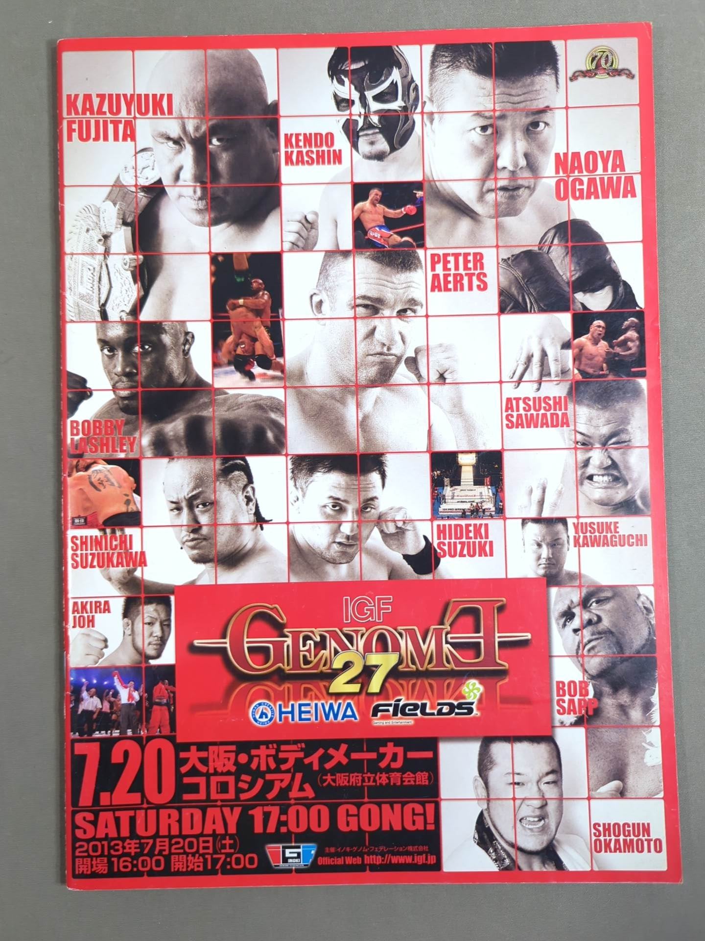 会場:大阪・ボディメーカーコロシアム / 印刷対戦カード:【藤田軍vs小川軍5対5イリミネーションマッチ】藤田和之&ボビー・ラシュリー&澤田敦士&ボブ・サップ&第1試合の勝者(鈴川真一)vs小川直也&ピーター・アーツ&鈴季秀樹&将軍岡本&天田ヒロミ ゲノム27 / アントニオ猪木インタビュー掲載