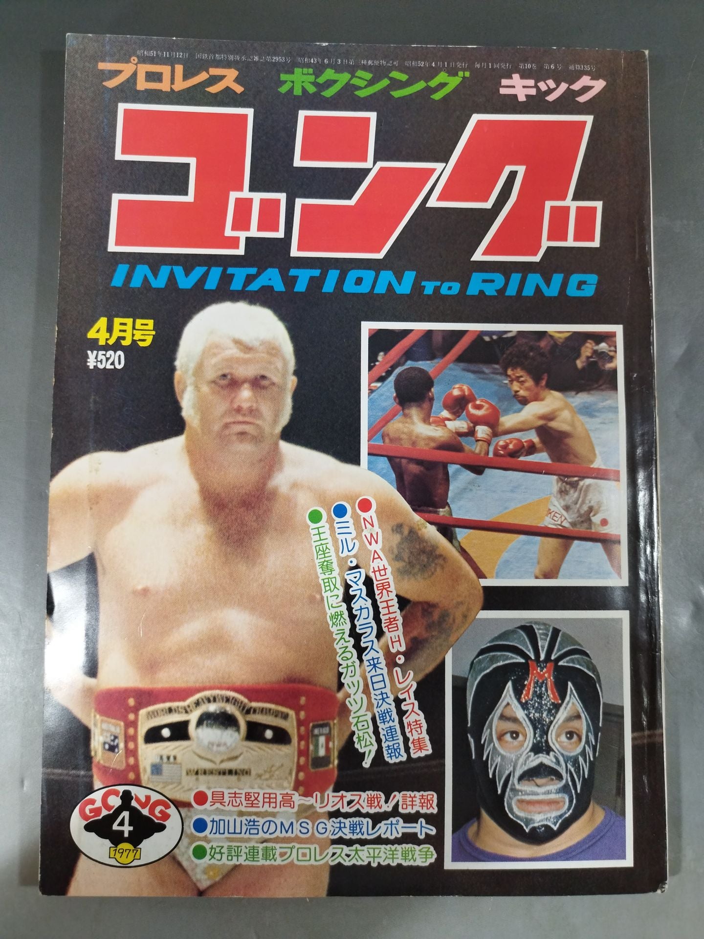 1977年 NWA世界王者H・レイス特集 ミル・マスカラス来日決戦連報 王座奪取に燃えるガッツ石松! 具志堅用高~リオス戦!詳報 加山浩のMSG決戦レポート 好評連載プロレス太平洋戦争 /【付録】○ピンナップ(表ハーリー・レイス/裏マスカラス&エル・サント) 〇特別付録(プロレス名ポスター集【6】第4回ワールド大リーグ戦 新日本プロレス) 表紙:ハーリー・レイス
