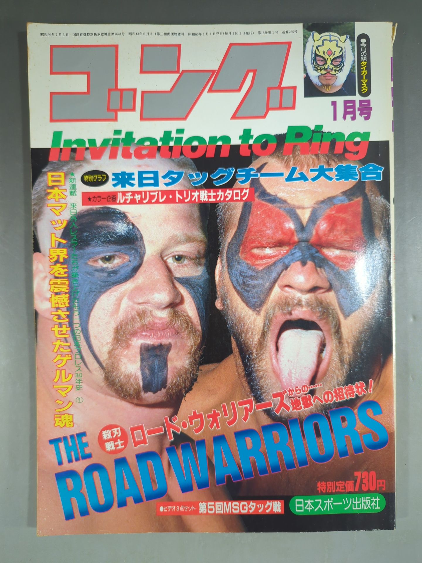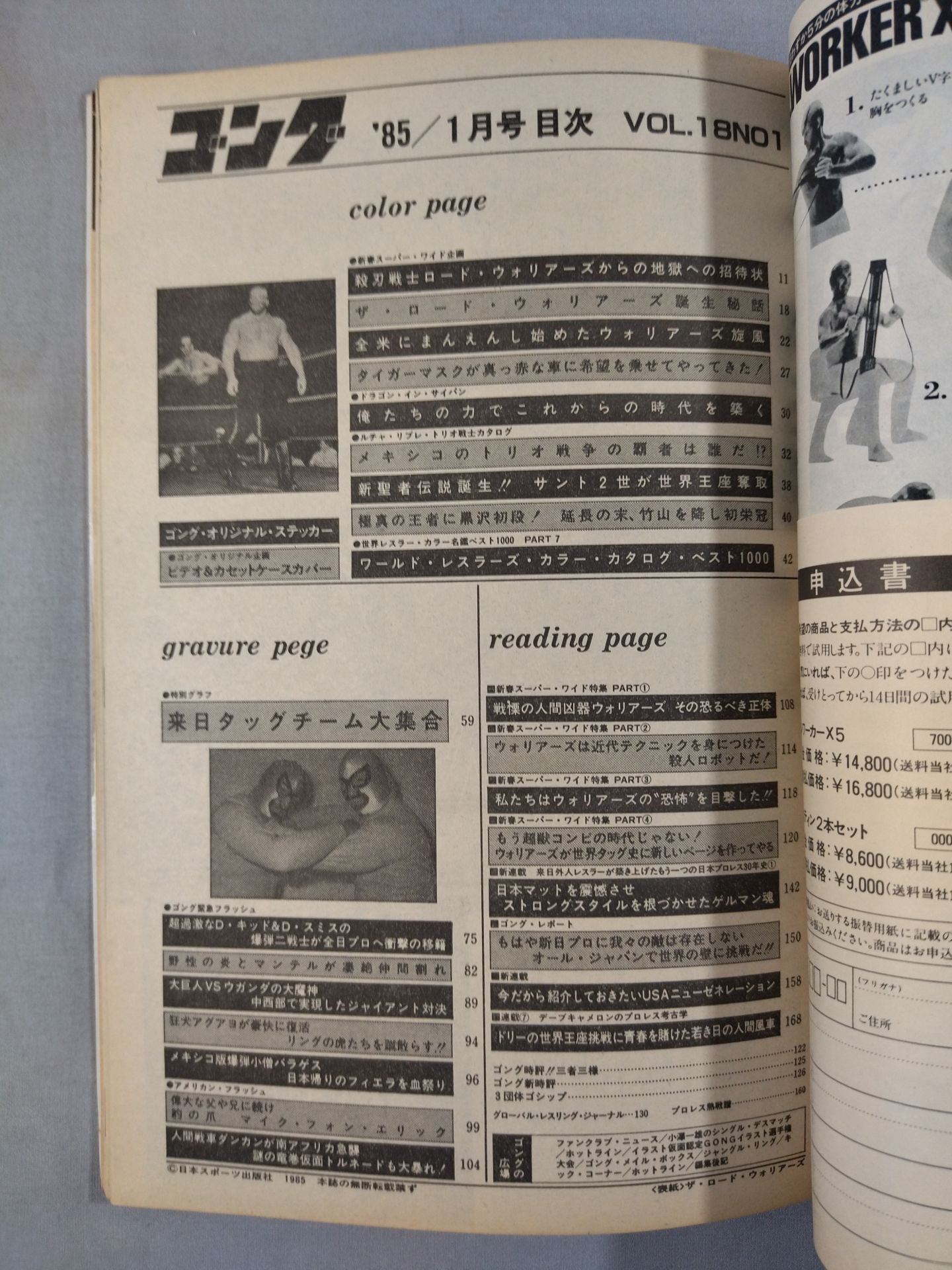1985年 ・殺刃戦士 ロード・ウォリアーズからの・・・地獄への招待状・新連載 来日外人レスラーたちが築き上げたもう一つの日本プロレス30年史① 日本マット界を震撼させたゲルマン魂 ・特別グラフ 来日タッグチーム大集合 ・カラー企画 ルチャリブレ・トリオ戦士カタログ / 【付録】◯特別付録(ゴング・オリジナル・ステッカー ◯オリジナル企画(ビデオ&カセットケースカバー) 表紙:ザ・ロード・ウォリアーズ