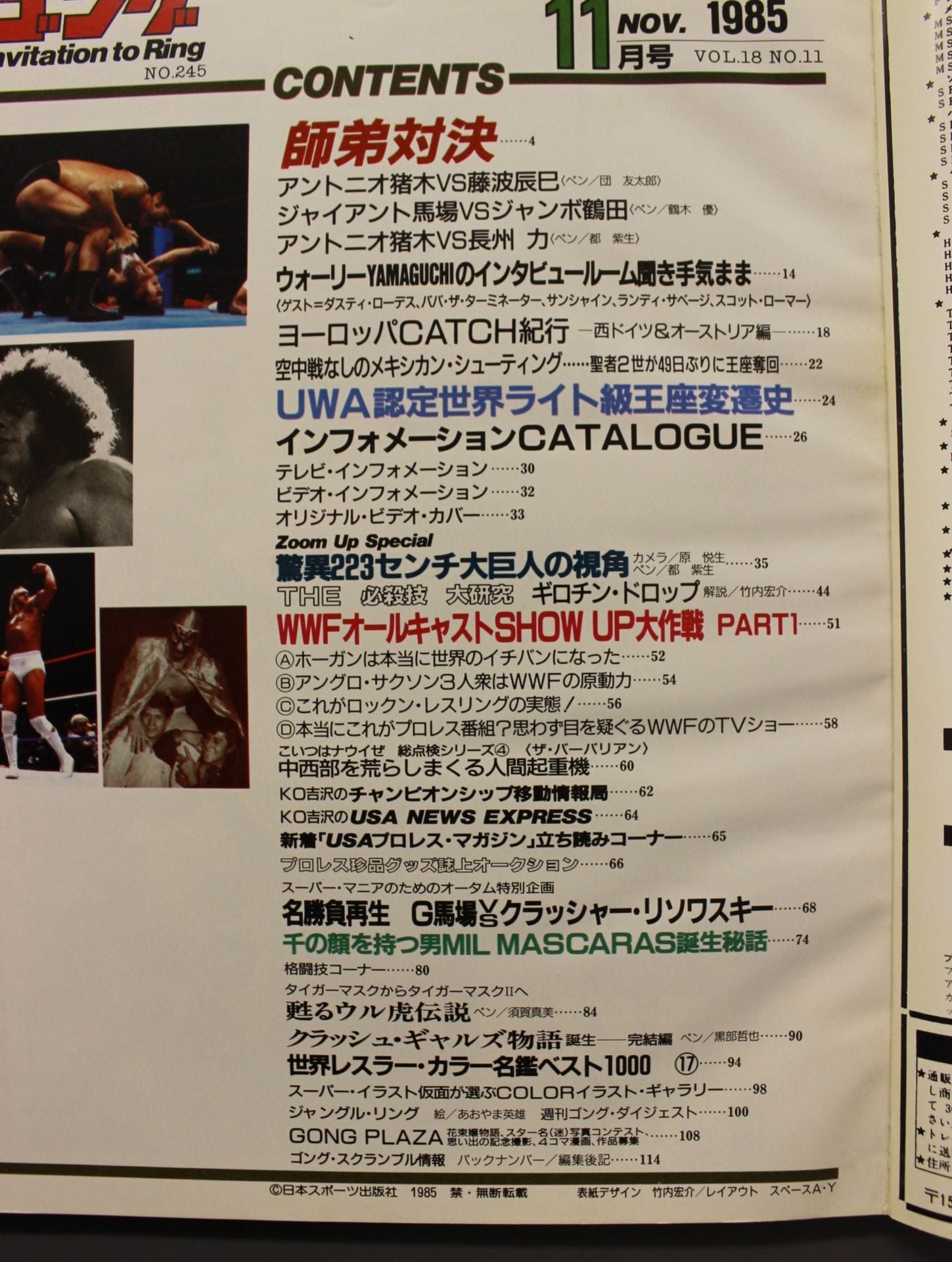 1985年 ・アントニオ猪木vs藤波辰巳 アントニオ猪木vs長州力 ジャイアント馬場vsジャンボ鶴田 師弟対決 ・Zoom Up Special 驚異223センチ大巨人の視角 ・秘蔵写真大公開!線の顔を持つ男MIL MASCARAS誕生秘話 ・タイガーマスクからタイガーマスクⅡへ甦るウル虎伝説 ・THE必殺技大研究 ギロチンドロップ ☆USAカラー・ホット・レポート☆実態に急接近 これがWWFだ ・未知のヨーロッパ・プロレスも特集 ・名勝負名場面=馬場vsクラッシャー ・盛沢山プロレス珍品グッズ誌上オークション 表紙:アントニオ猪木