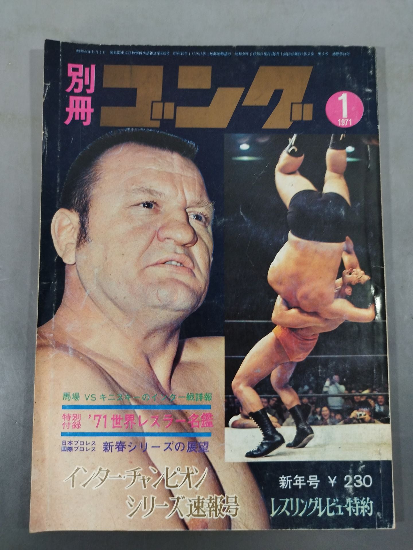 1971年 インター・チャンピオンシリーズ速報号 馬場vsキニスキーのインター戦詳報 日本プロレス 国際プロレス 新春シリーズの展望 / 【付録】○ピンナップ(ドリー・ファンク・ジュニア) ◯ポストカード(ミスター・イトウ) ×特別付録('71世界レスラー名鑑) ◯ゴング・ミニ・プロマイド ×カラー・ジャンボ・ピンナップ(アントニオ猪木) 表紙:アントニオ猪木、ジョニー・バレンタイン、ジン・キニスキー