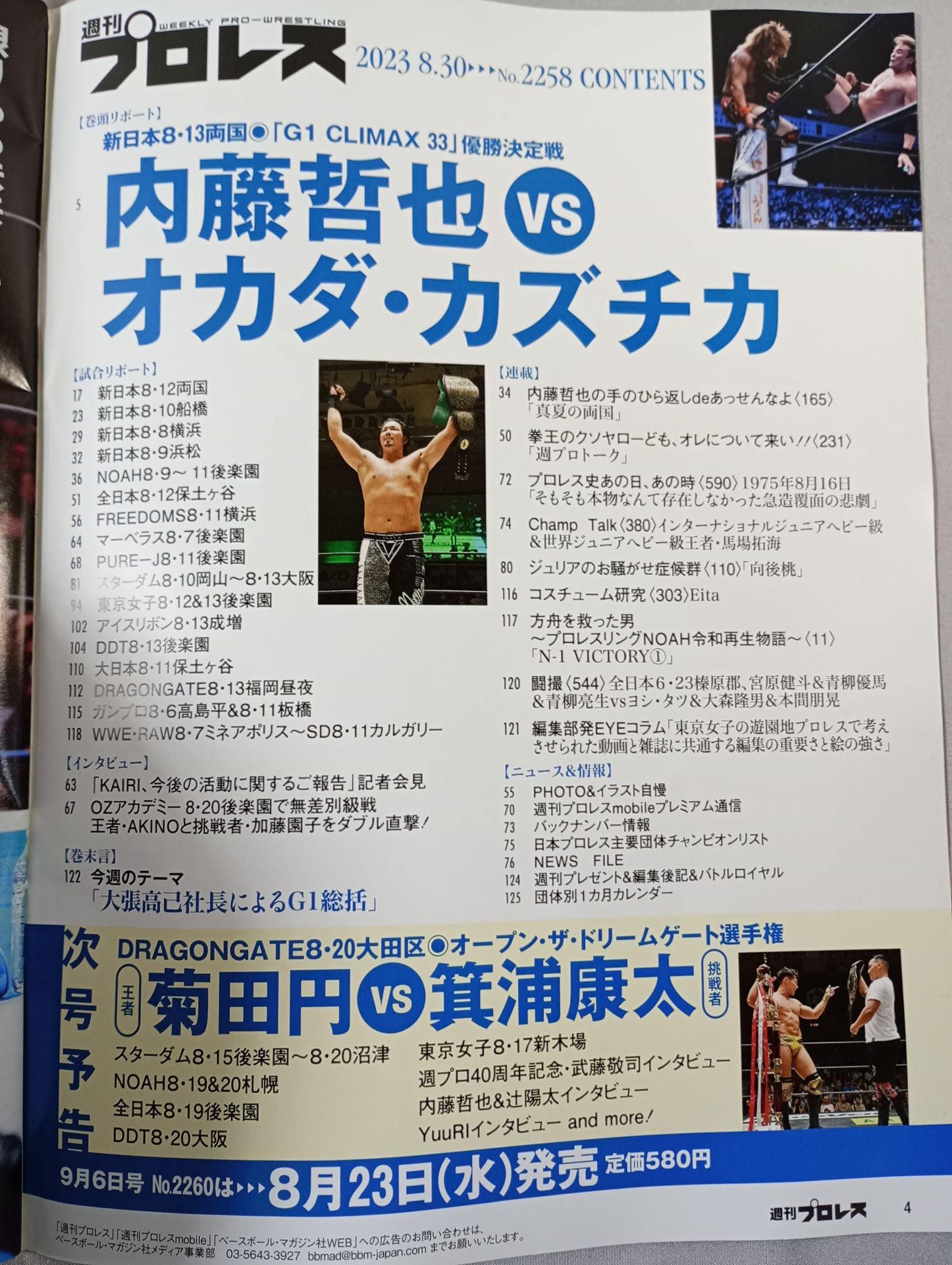 2023年 内藤人気は制御不能 /【巻頭リポート】新日本8・13両国●「G1 CLIMAX 33」優勝決定戦:内藤哲也vsオカダ・カズチカ / 【試合リポート】新日本8・12両国ほか、NOAH8・9~11後楽園、FREEDOMS8・11横浜 ほか / 【インタビュー】KAIRI:「今後の活動に関するご報告」記者会見 ほか /【巻末言】「大張高己社長によるG1総括」 表紙:内藤哲也