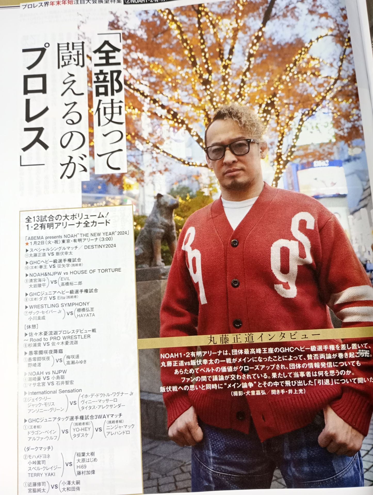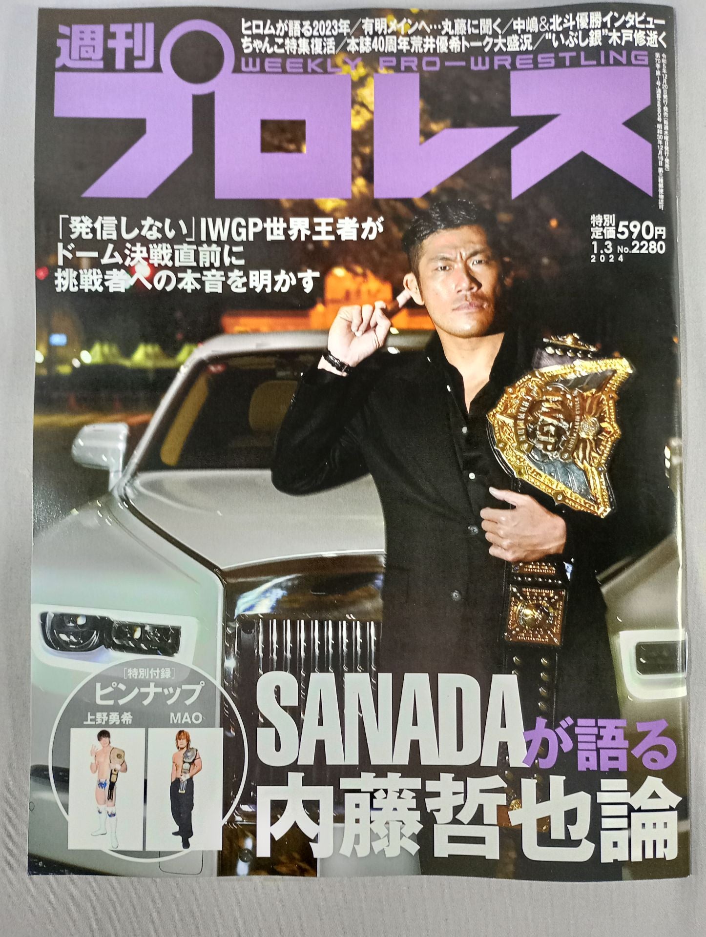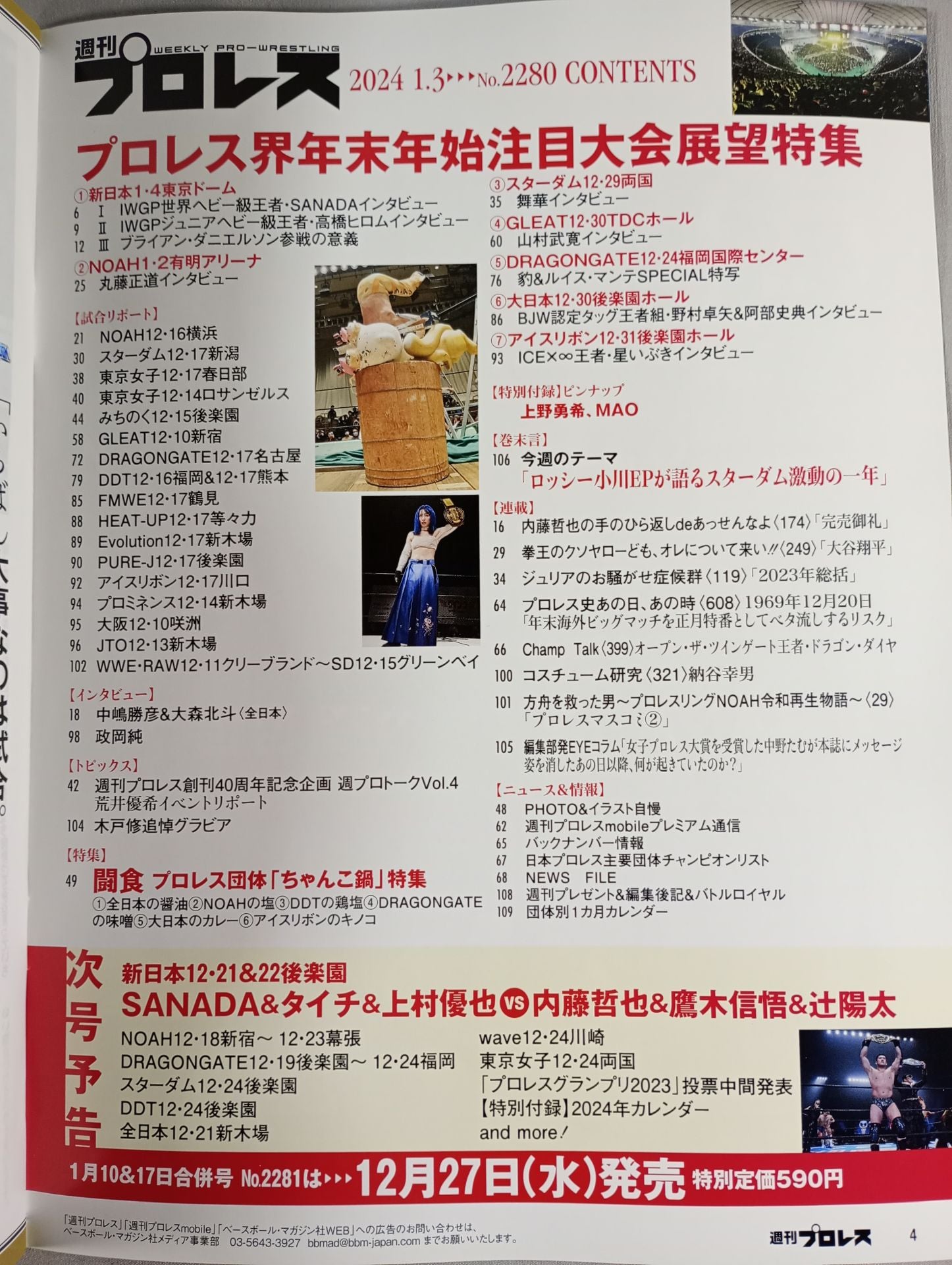 2024年 SANADAが語る内藤哲也論 /【プロレス界年末年始注目大会展望特集】(1)新日本1・4東京ドーム (2)NOAH1・2有明アリーナ (3)スターダム12・29両国 (4)GLEAT12・30TDCホール (5)DRAGONGATE12・24福岡国際センター (6)大日本12・30後楽園ホール (7)アイスリボン12・31後楽園ホール /【試合リポート】NOAH12・16横浜、スターダム12・17新潟、東京女子12・17春日部 ほか /【トピックス】週刊プロレス創刊40周年記念企画 週プロトークVol.4 荒井優希イベントリポート、木戸修 追悼グラビア /【特別付録ピンナップ】上野勇希、MAO 表紙:SANADA