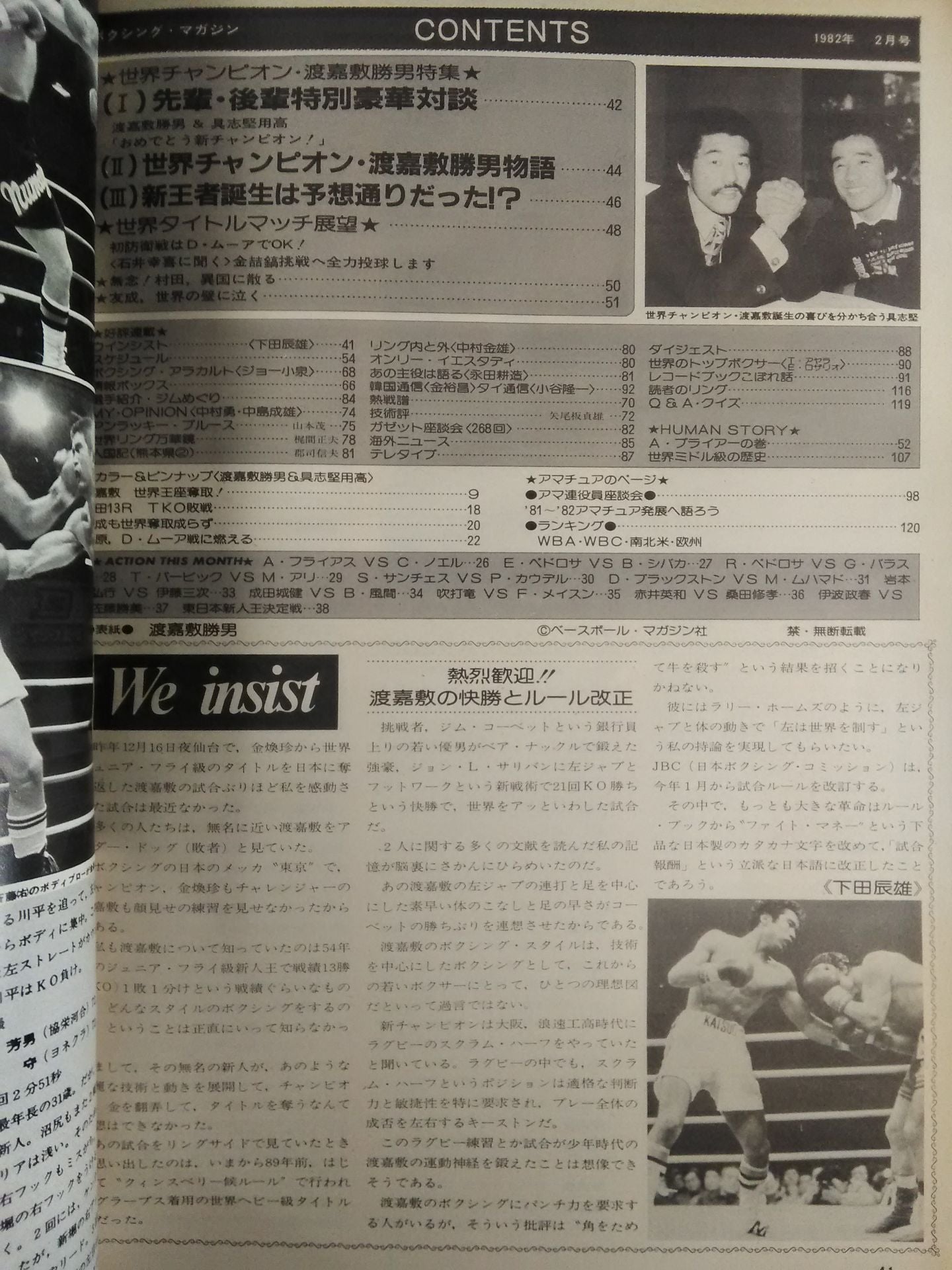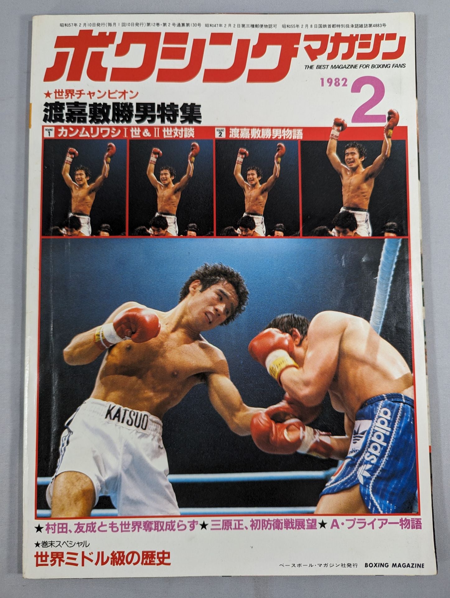 1982年 ★世界チャンピオン渡嘉敷勝男特集 ★村田、友成とも世界奪取成らず ★三原正、初防衛戦展望 ★A・プライアー物語 ★巻末スペシャル 世界ミドル級の歴史 / 【付録】◯ピンナップ(渡嘉敷勝男&具志堅用高) 表紙:渡嘉敷勝男