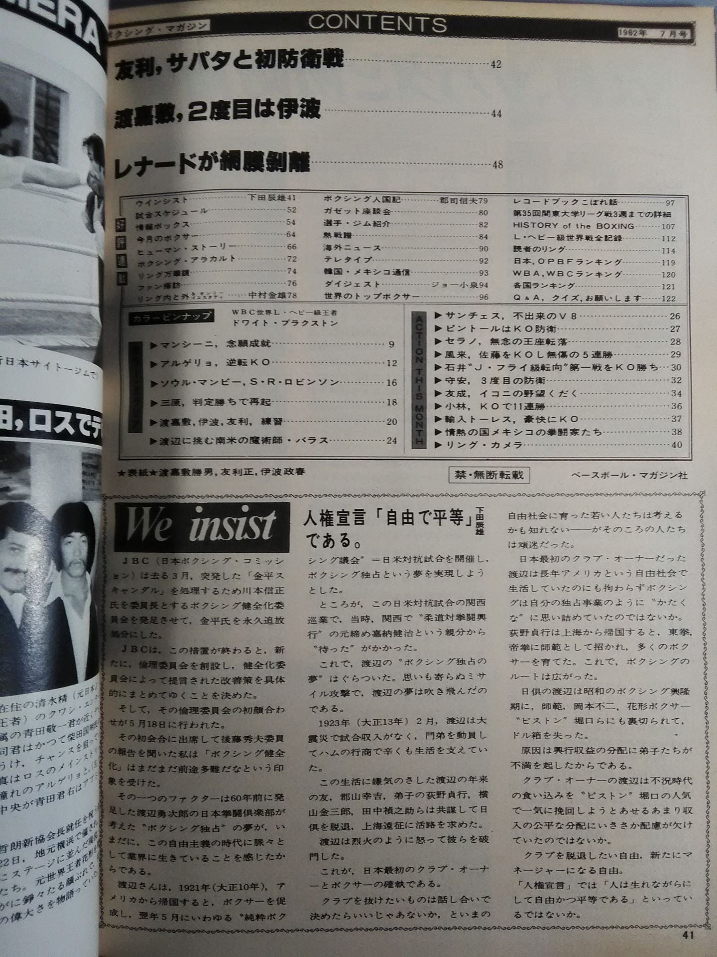 1982年 渡嘉敷vs伊波/有利vsサパタ展望 レナード、網膜ハク離の手術 第35回関東大学リーグ戦第3週までの詳報 / 【付録】◯ピンナップ(ドワイト・ブラクストン) 表紙:渡嘉敷勝男、友利正、伊波政春