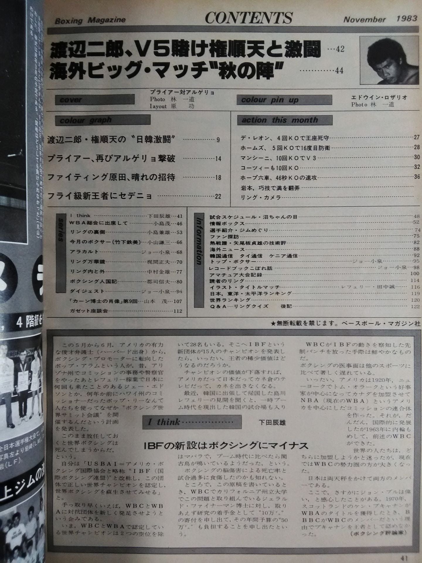 1983年 無念! アルゲリョ、悲願ならず引退 渡辺vs権、大阪決戦速報 WBC創立20周年記念式典にF・原田が出席 / 【付録】◯ピンナップ(エドウィン・ロザリオ) 表紙:アーロン・プライアーvsアレクシス・アルゲリョ