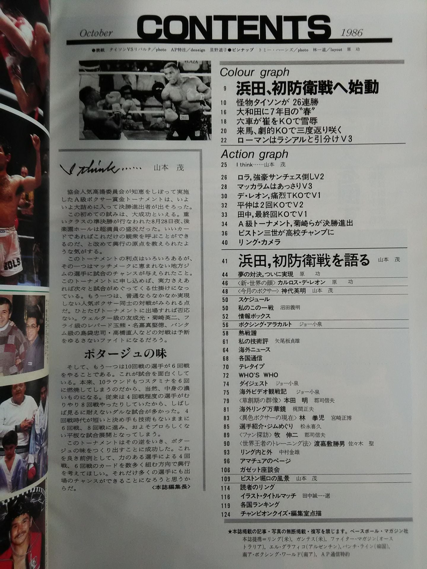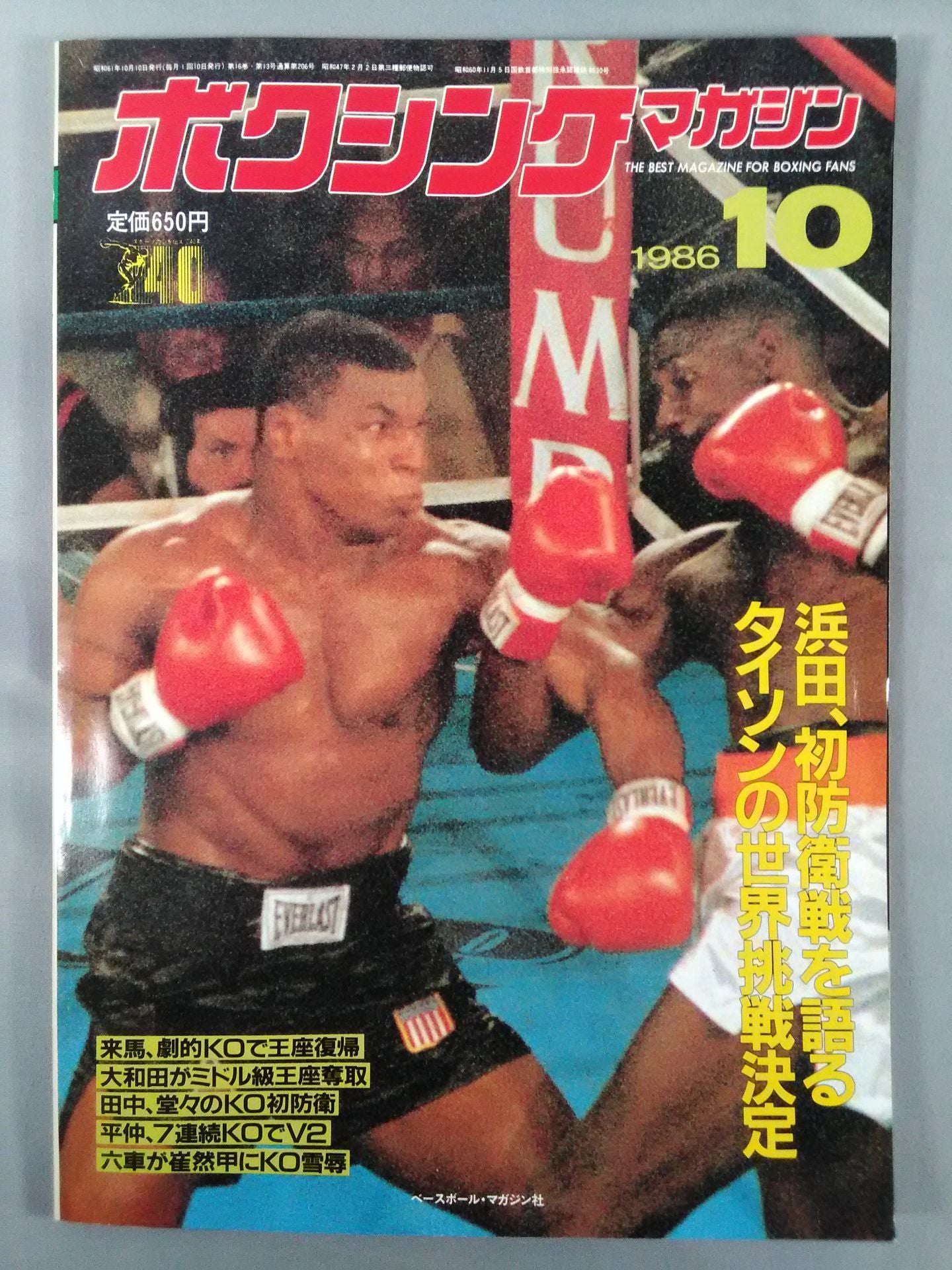 1986年 浜田、初防衛戦を語る タイソンの世界挑戦決定 来馬、劇的KOで王座復帰 大和田がミドル級王座奪取 田中、堂々のKO初防衛 平中、7連続KOでV2 六車が崔然甲にKO雪辱 / 【付録】◯ピンナップ(トミー・ハーンズ) 表紙:タイソンvsリバルタ