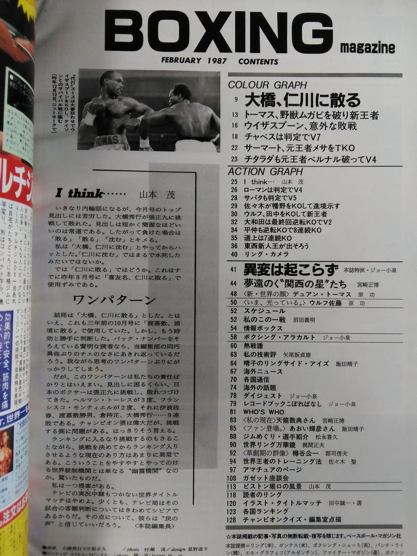 1987年 大橋、仁川に散る ウルフ、KOで王座奪取 大和田は逆転KOでV2 平仲も逆転の8連続KO 東西新人王が出そろう ウィザスプーンが敗退 トーマス、野獣ムガビ破る タイの王者、ともに防衛 サパタが判定でV5 / 【付録】◯ピンナップ(マイケル・スピンクス) 表紙:大橋秀行vs張正九