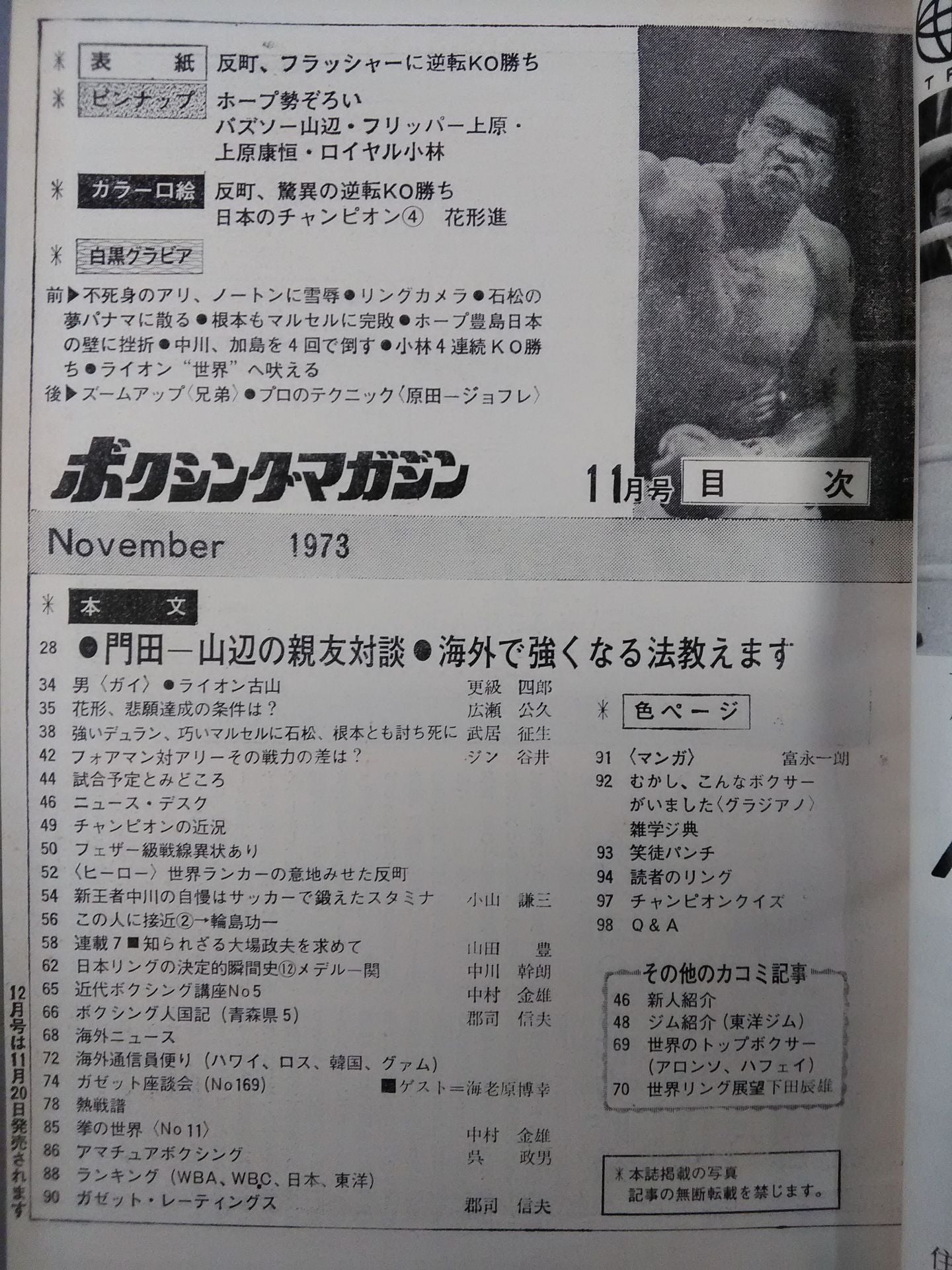 1973年 海外で強くなる法教えます 門田新一=バズソー山辺の親友対談 / 【付録】×ピンナップ(バズソー山辺、フリッパー上原、上原康恒、ロイヤル小林) 表紙:反町、フラッシャーに逆転KO勝ち