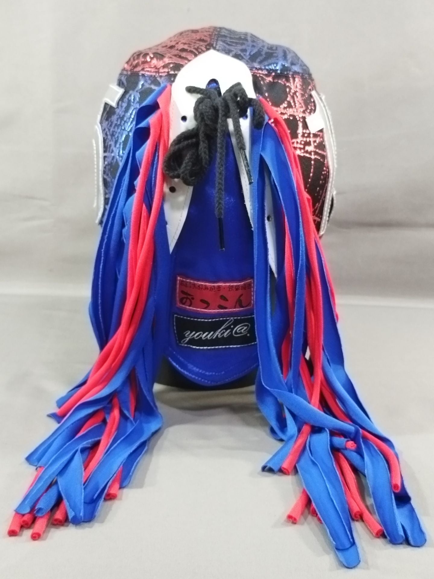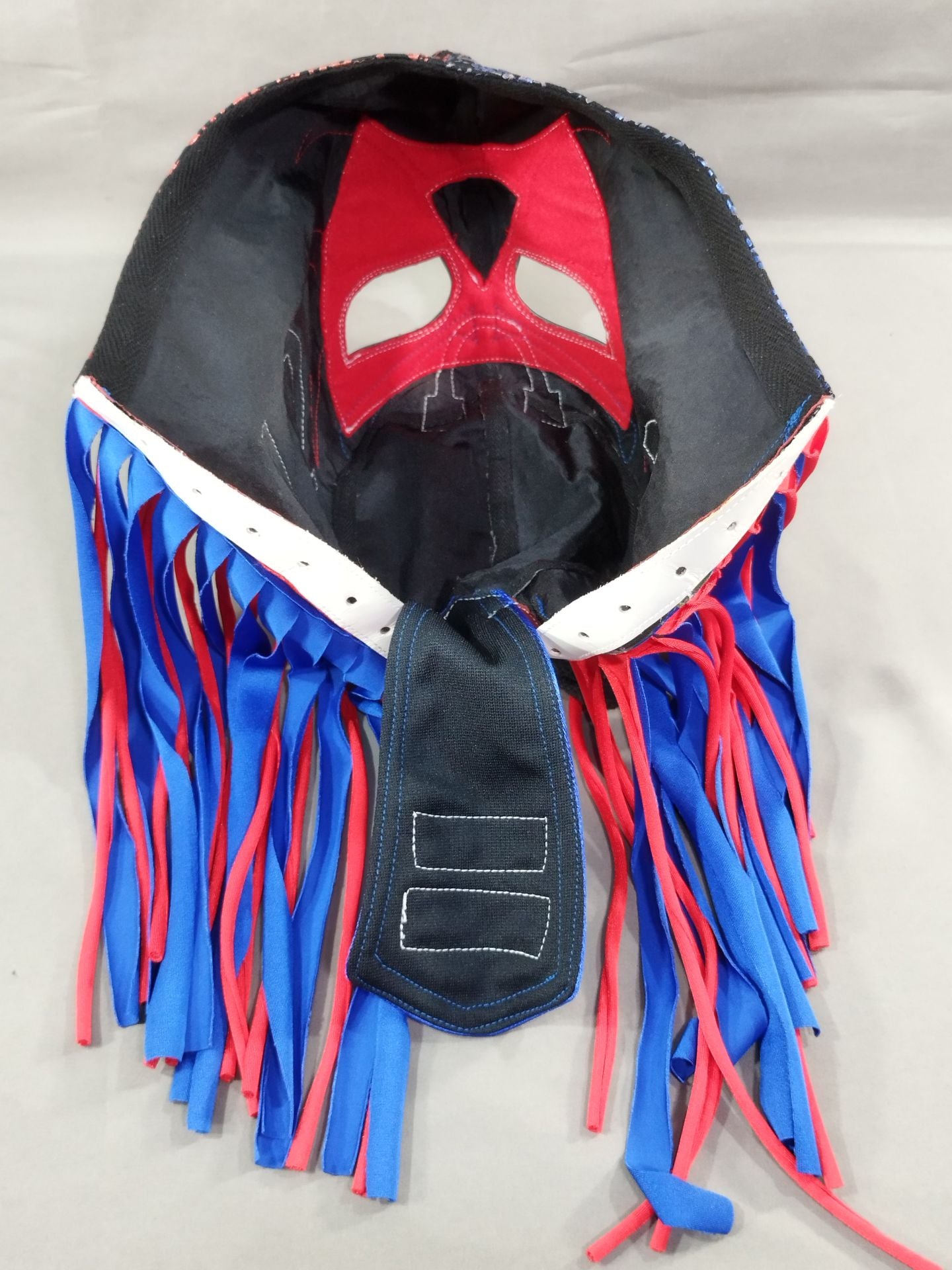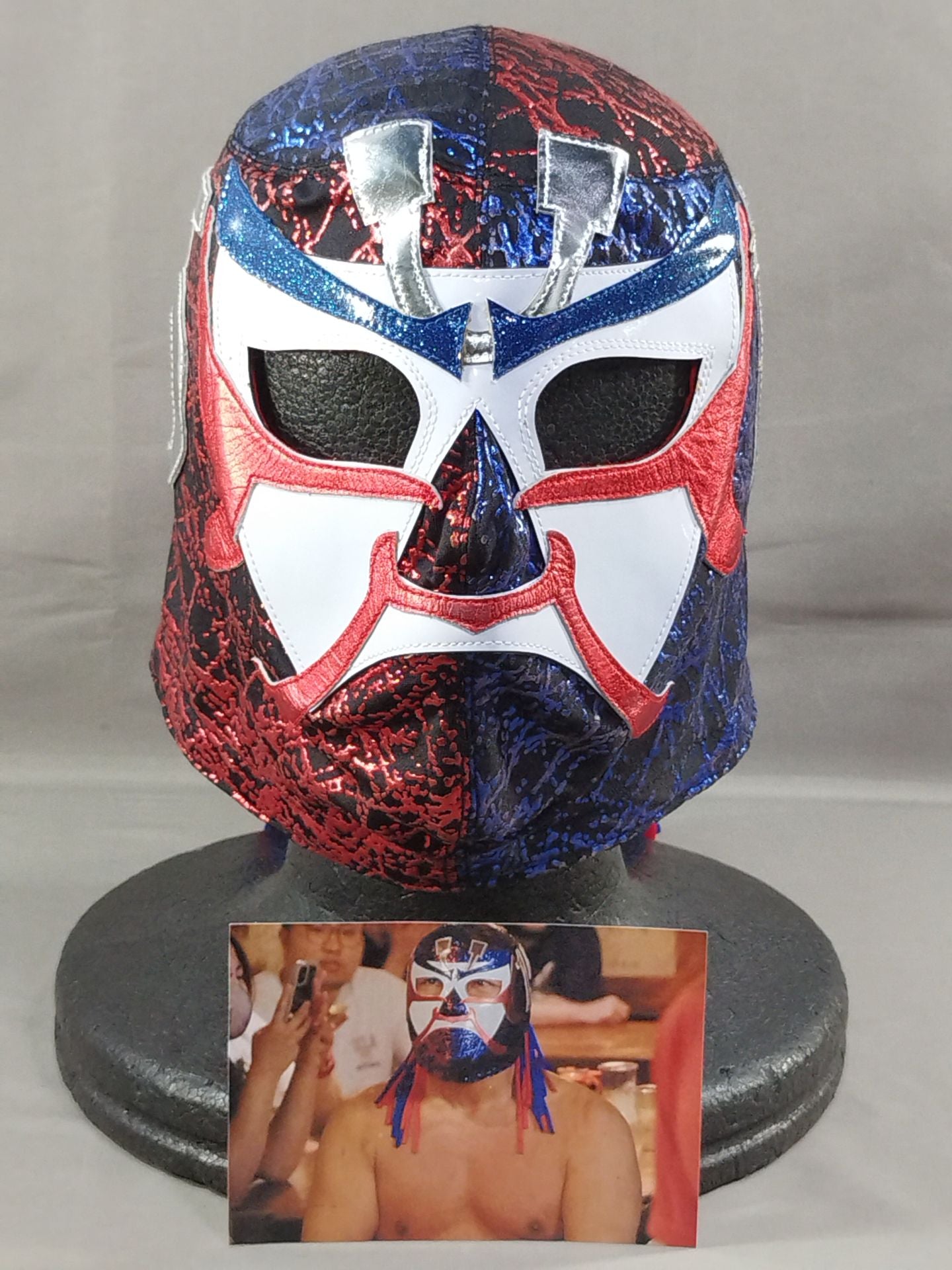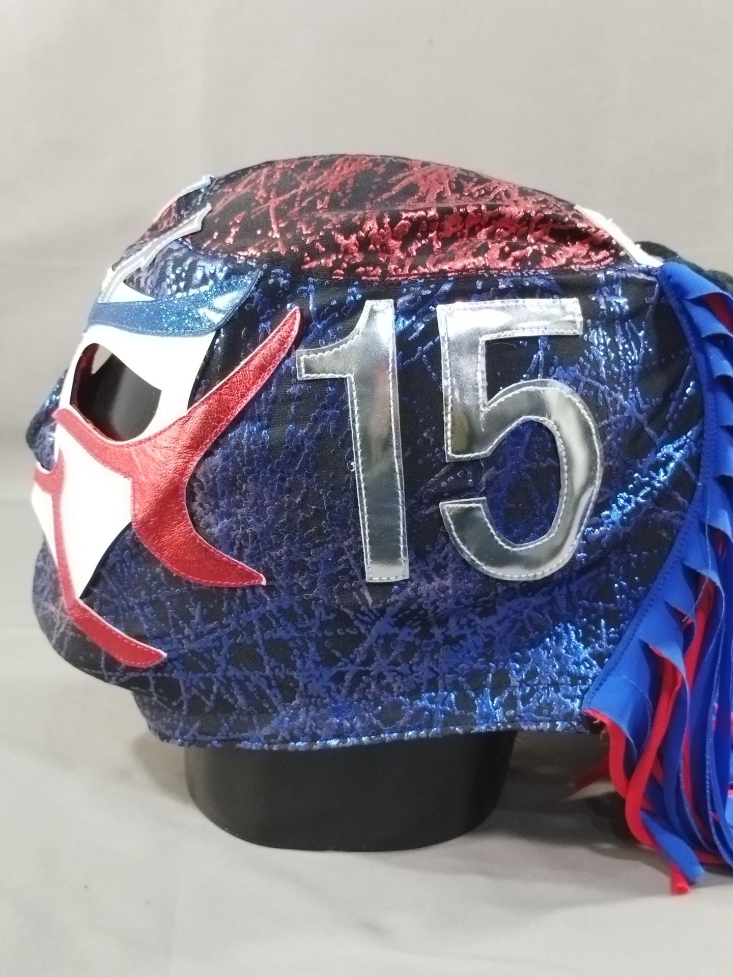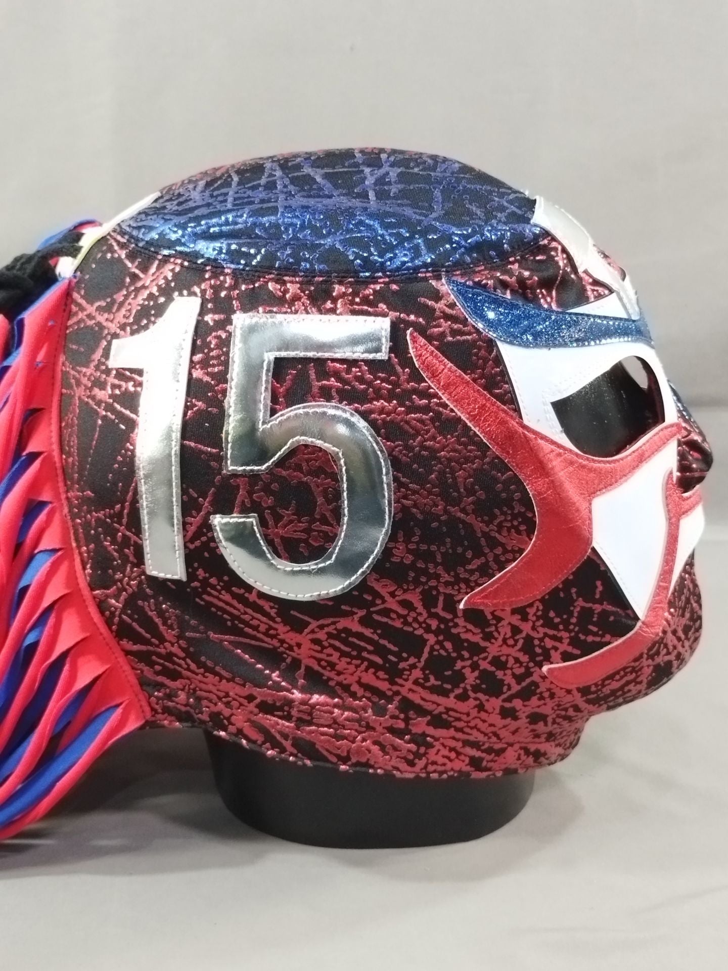 2024年 着用写真付 黒特殊レオタード生地(赤&青模様) 白地赤特殊フチ&銀フチ 青特殊眉 ナンバー15 2024年6月、おっこんdeプロレスで使用したもの