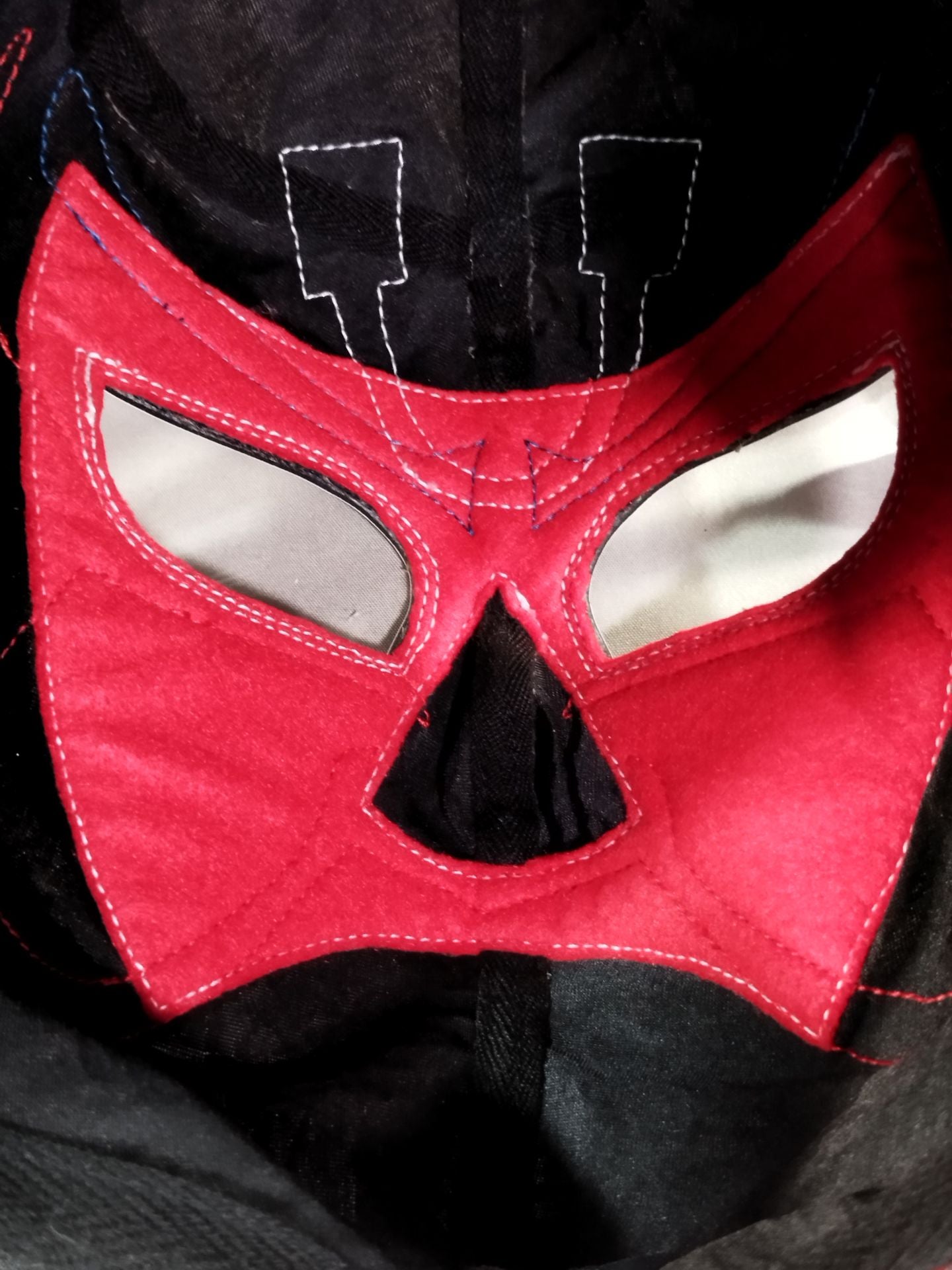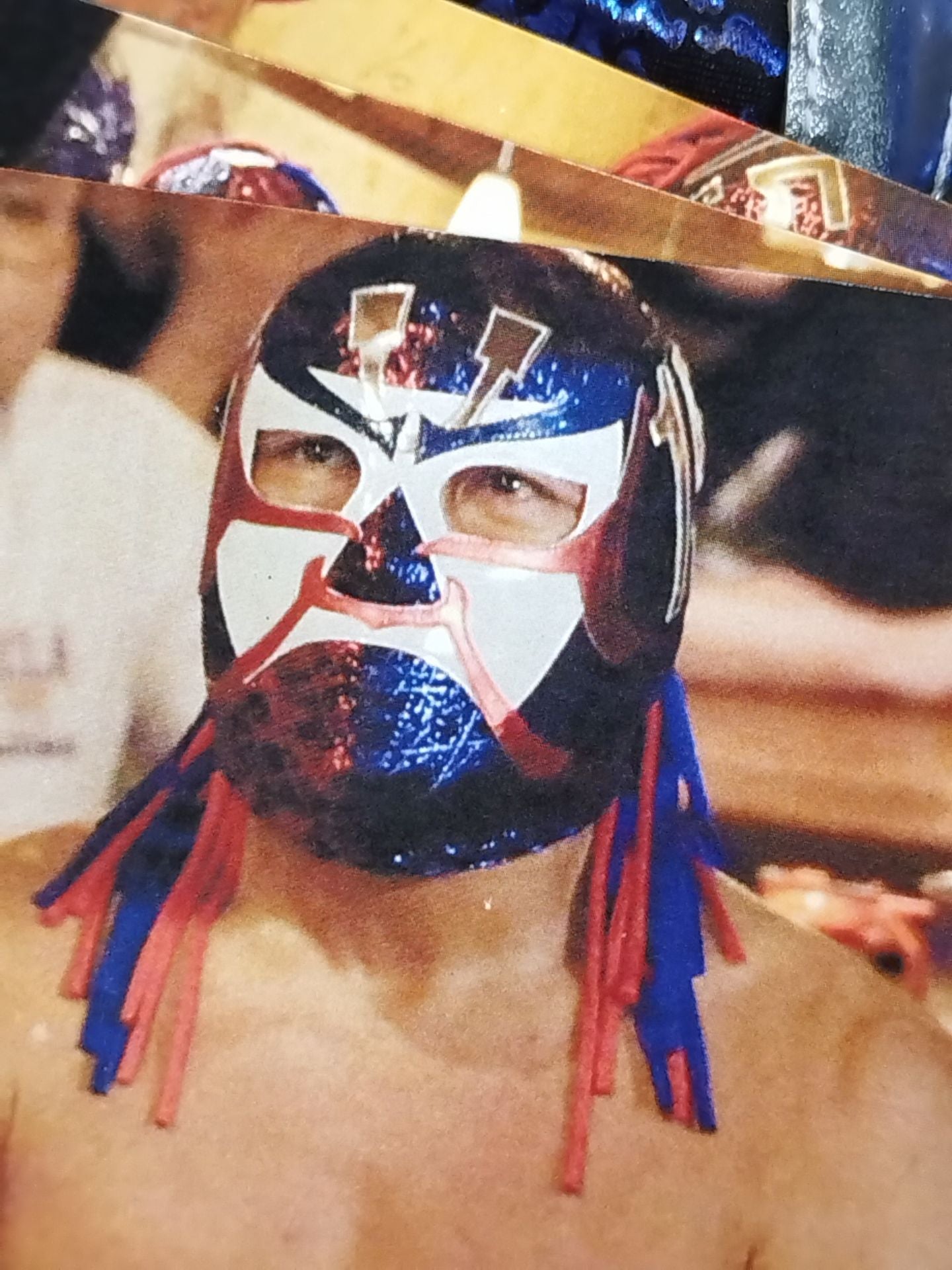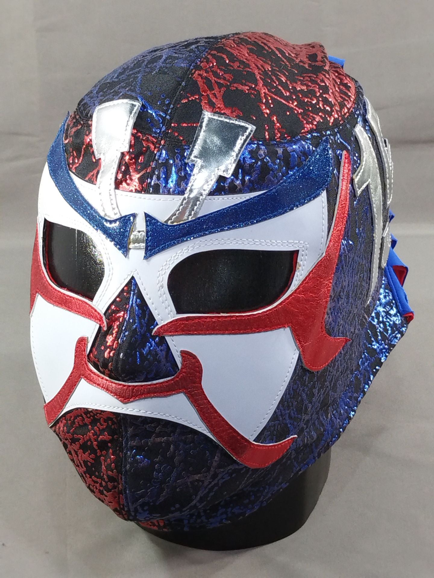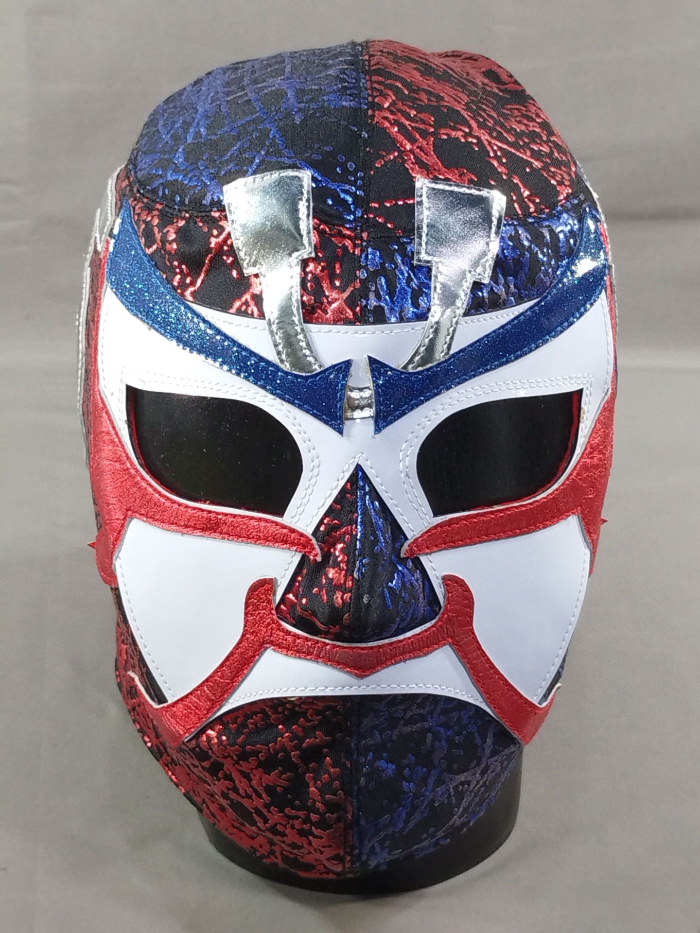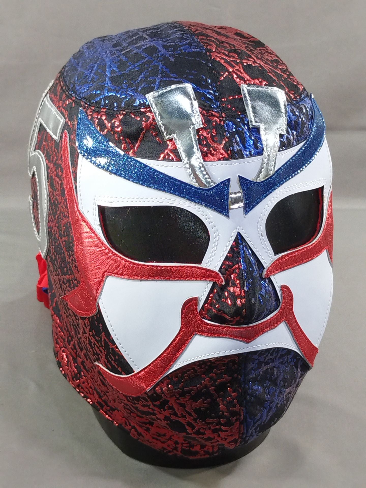 2024年 着用写真付 黒特殊レオタード生地(赤&青模様) 白地赤特殊フチ&銀フチ 青特殊眉 ナンバー15 2024年6月、おっこんdeプロレスで使用したもの