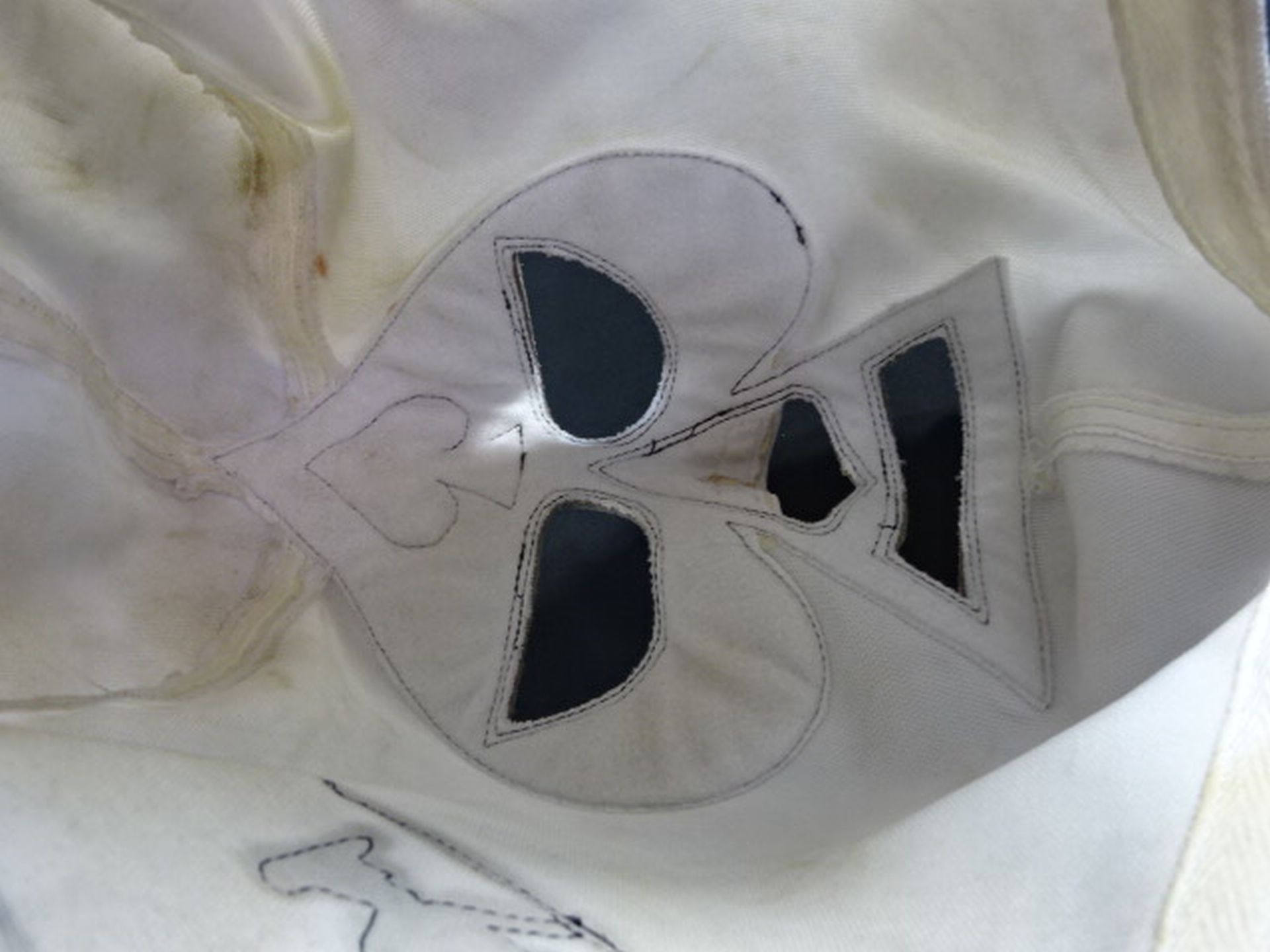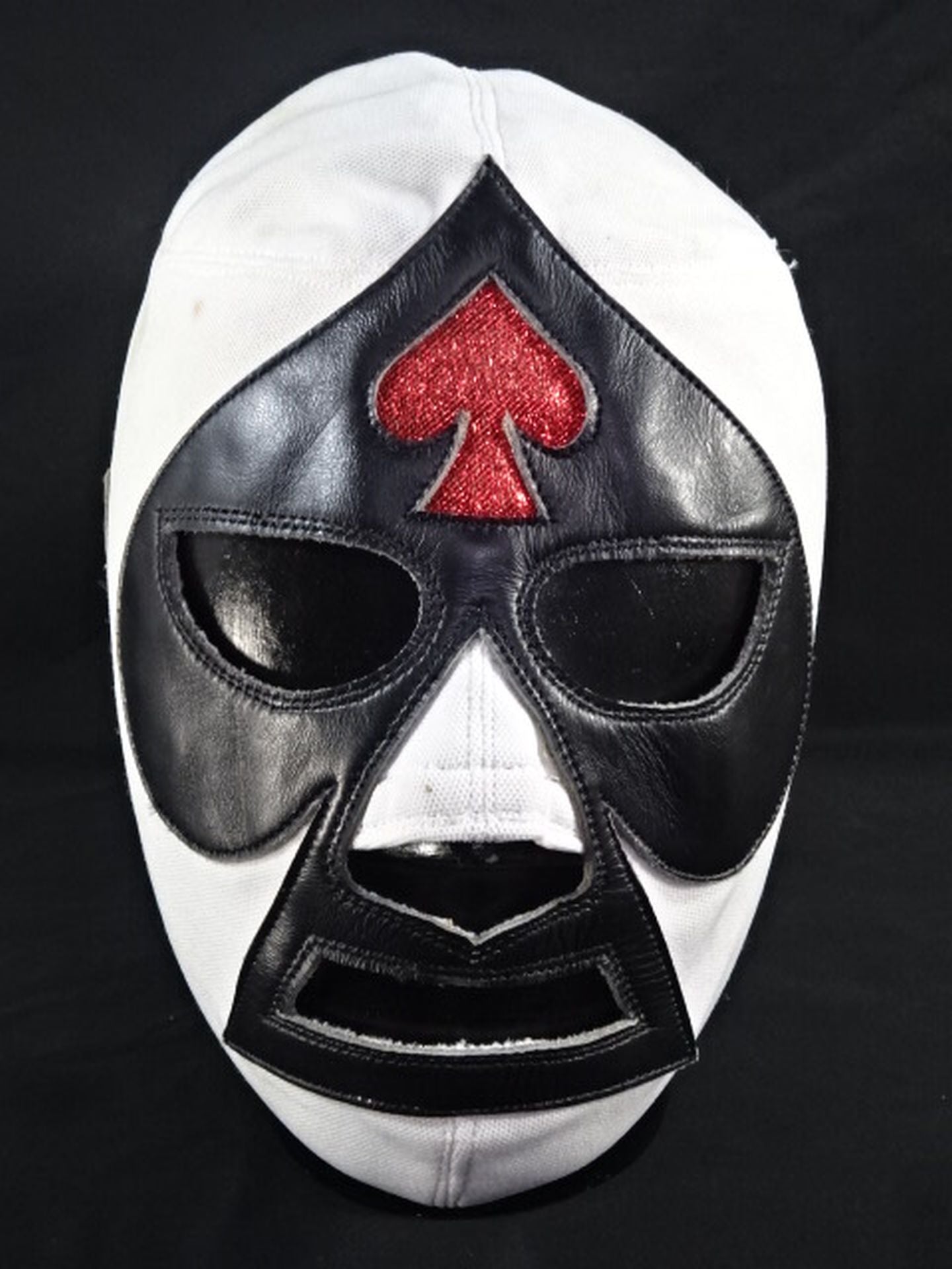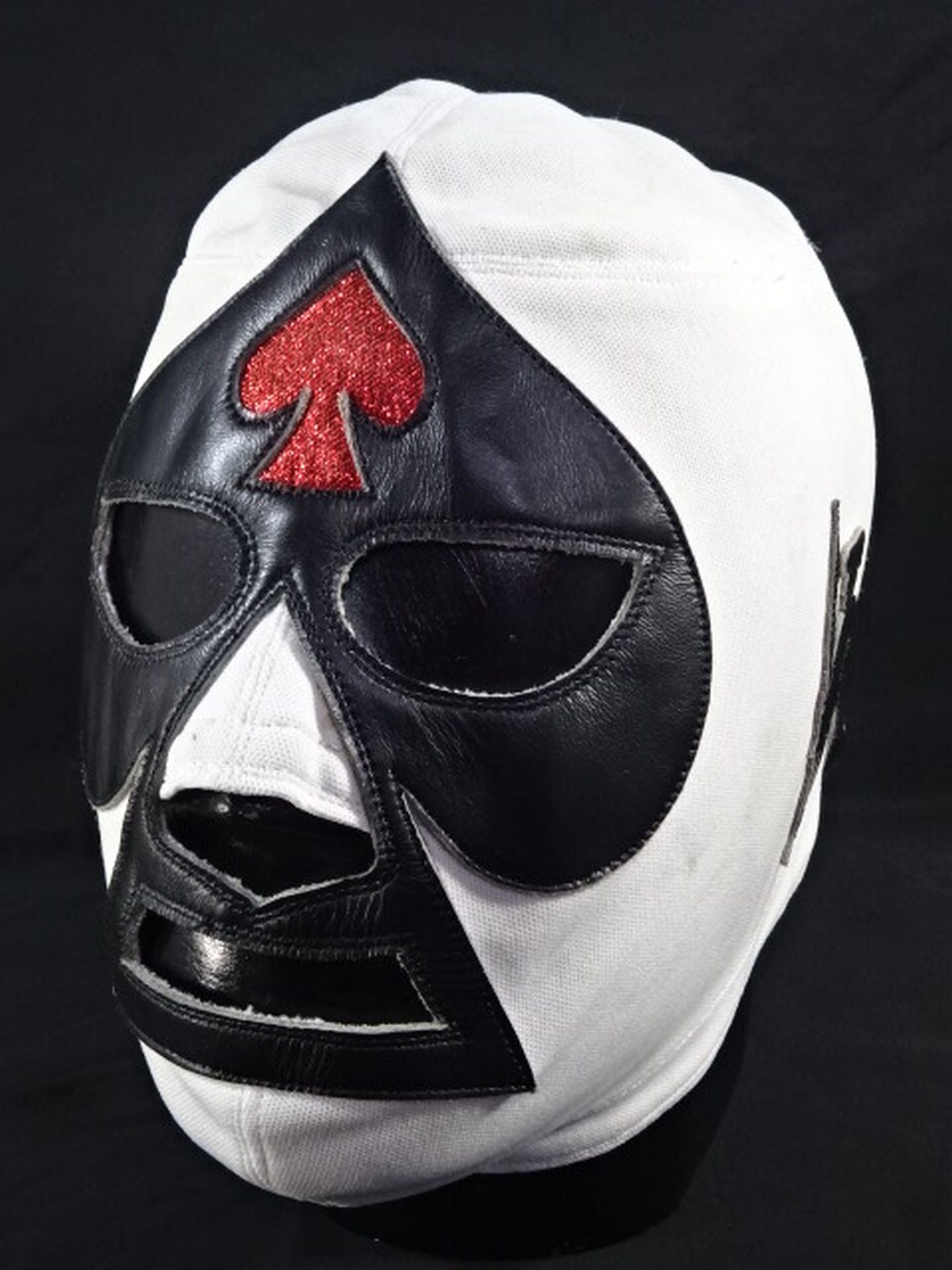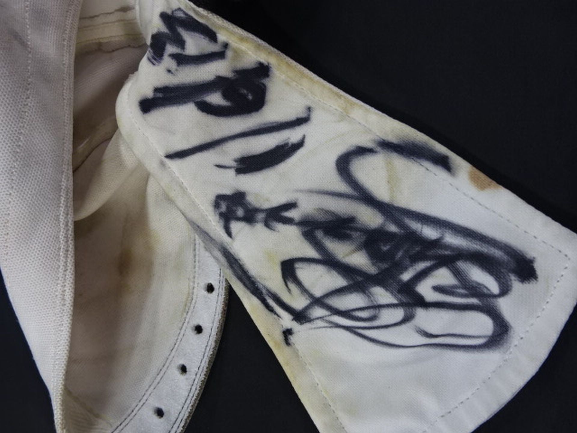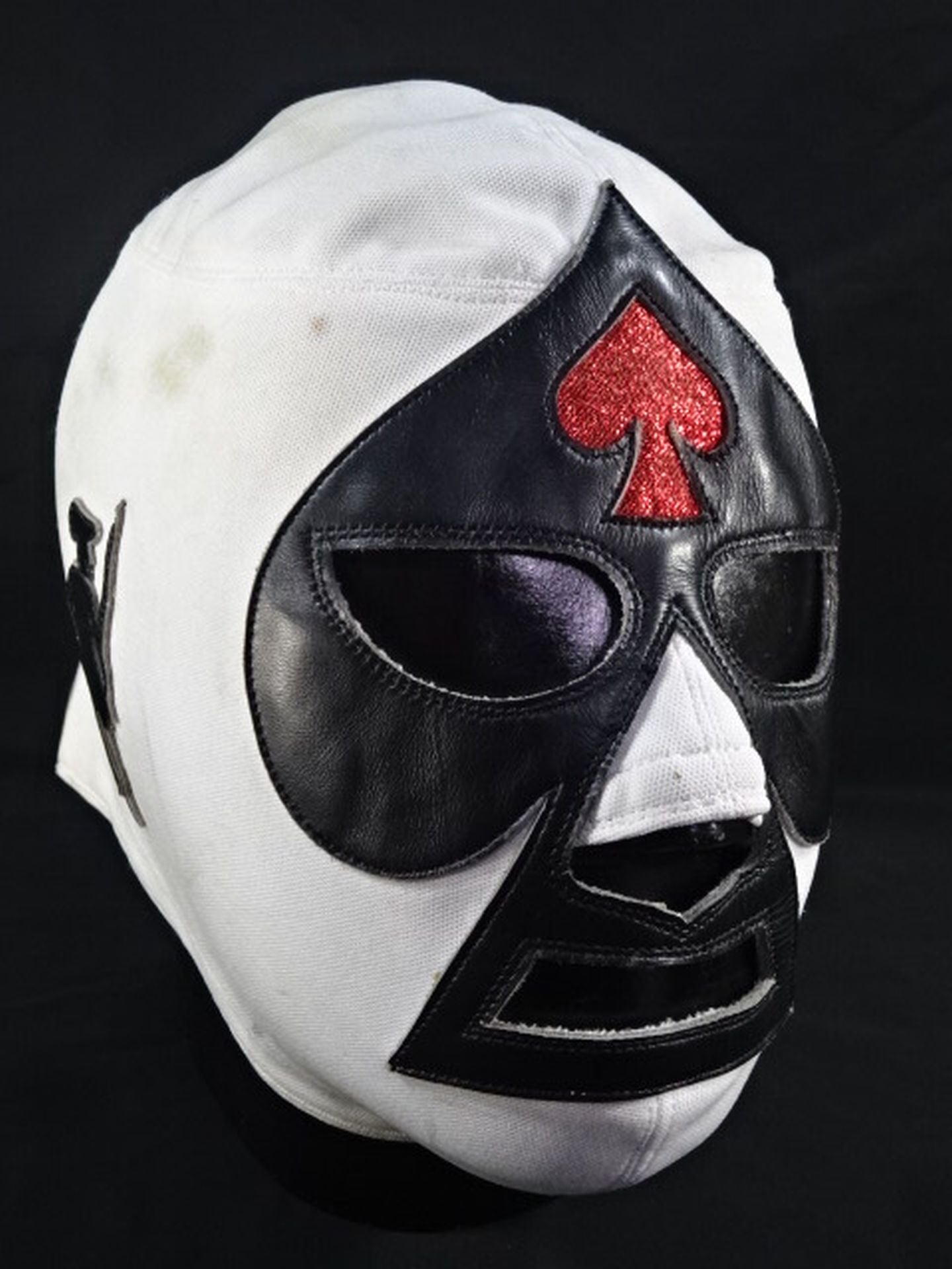 ★ビンテージ年代物マスク★ 本人長期使用サイン入り 白ジャージ生地 黒革フチ(赤ラメ)